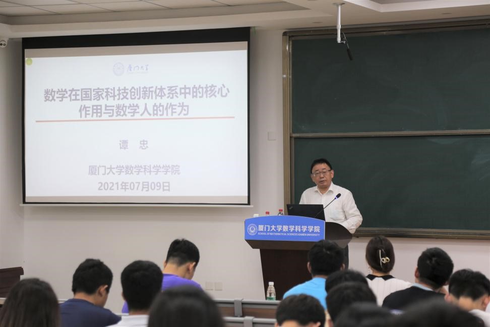 随后,谭忠教授结合厦大数学实际,指出了现存亟待解决的问题:如何提高数学大学生学习数学的兴趣?如何提高数学大学生应用数学解决实际问题的能力?如何开阔大学生的学科视野和行业视野,助力大学生深造选专业和就业选行业的职业规划?他结合自身科研方向,为大家介绍了数学科研成果在实际生活中的具体应用。