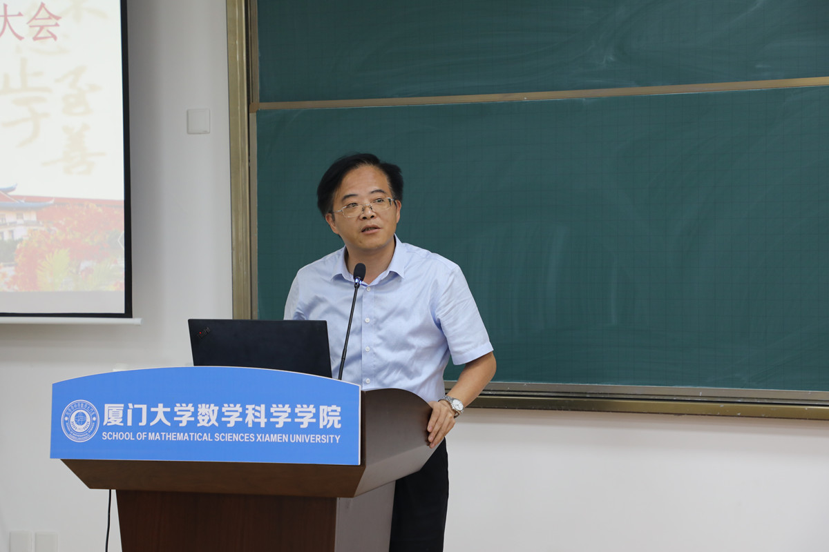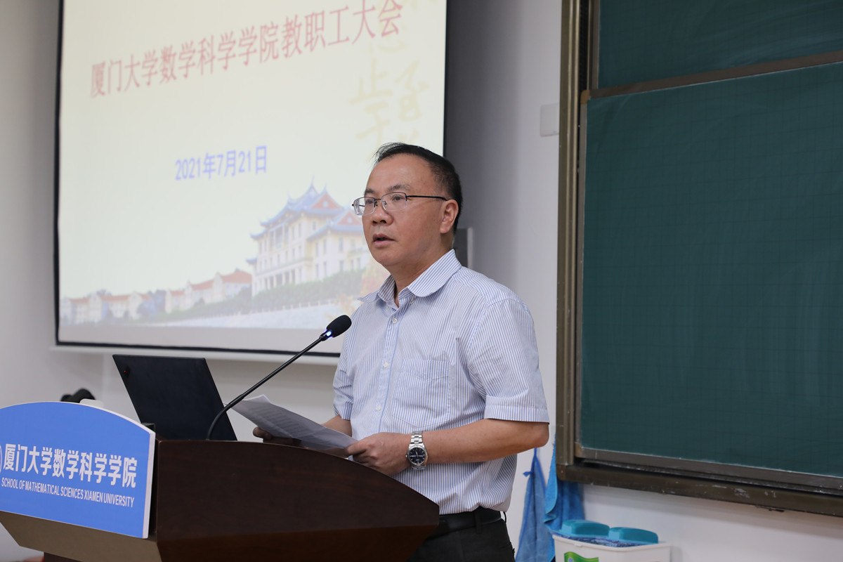 会上,黄宝秋结合学校《关于认真学习贯彻习近平总书记在庆祝中国共产党成立100周年大会上的重要讲话精神的通知》要求,再次传达学习习近平总书记“七一”重要讲话精神,报告学院3月下旬以来扎实推进党史学习教育各项工作所取得的阶段性成效,肯定了学院在庆祝百年校庆和建党百年活动以及党建思政、教书育人、科学研究、志愿服务、群团工作等方面所取得的成绩,并就几项重点工作作了强调。他指出,习近平总书记“七一”重要讲话是一篇马克思主义纲领性文献,是新时代中国共产党人不忘初心、牢记使命的政治宣言,是我们党团结带领人民以史为鉴、开创未来的行动指南,要深入领会“七一”重要讲话精神的重大意义和丰富内涵,把学习“七一”重要讲话精神同当前开展的党史学习教育结合起来,同学习贯彻落实习近平总书记致厦门大学建校100周年贺信精神结合起来,同统筹推进“双一流”建设结合起来,不断把学习“七一”重要讲话精神引向深入。他认为,了解历史才能看得远,理解历史才能走得远,我们有幸见证了伟大的中国共产党领导全国人民决战决胜脱贫攻坚、全面建成小康社会,有幸见证了中国共产党成立100周年,有幸见证了厦门大学庆祝建校100周年的辉煌时刻,还将继续参加、见证我国于2035年基本实现社会主义现代化、于本世纪中叶建成富强民主文明和谐美丽的社会主义现代化强国,要更加坚定在新时代与党一起创业的信心和决心,把学习“七一”重要讲话精神和开展党史学习教育的成果转化为奋进新征程、建功新时代的实际行动,努力在实现“两个一百年”奋斗目标的宏伟征程中作出应有贡献。他强调,学院取得的各项发展成就得益于这个伟大的时代,得益于大家撸起袖子加油干,得益于和谐向上的集体,希望大家继续发扬自强不息、止于至善的校训精神和陈景润先生的科学精神,不忘初心,砥砺前行,努力在新百年新征程中展现数学人的新风采。