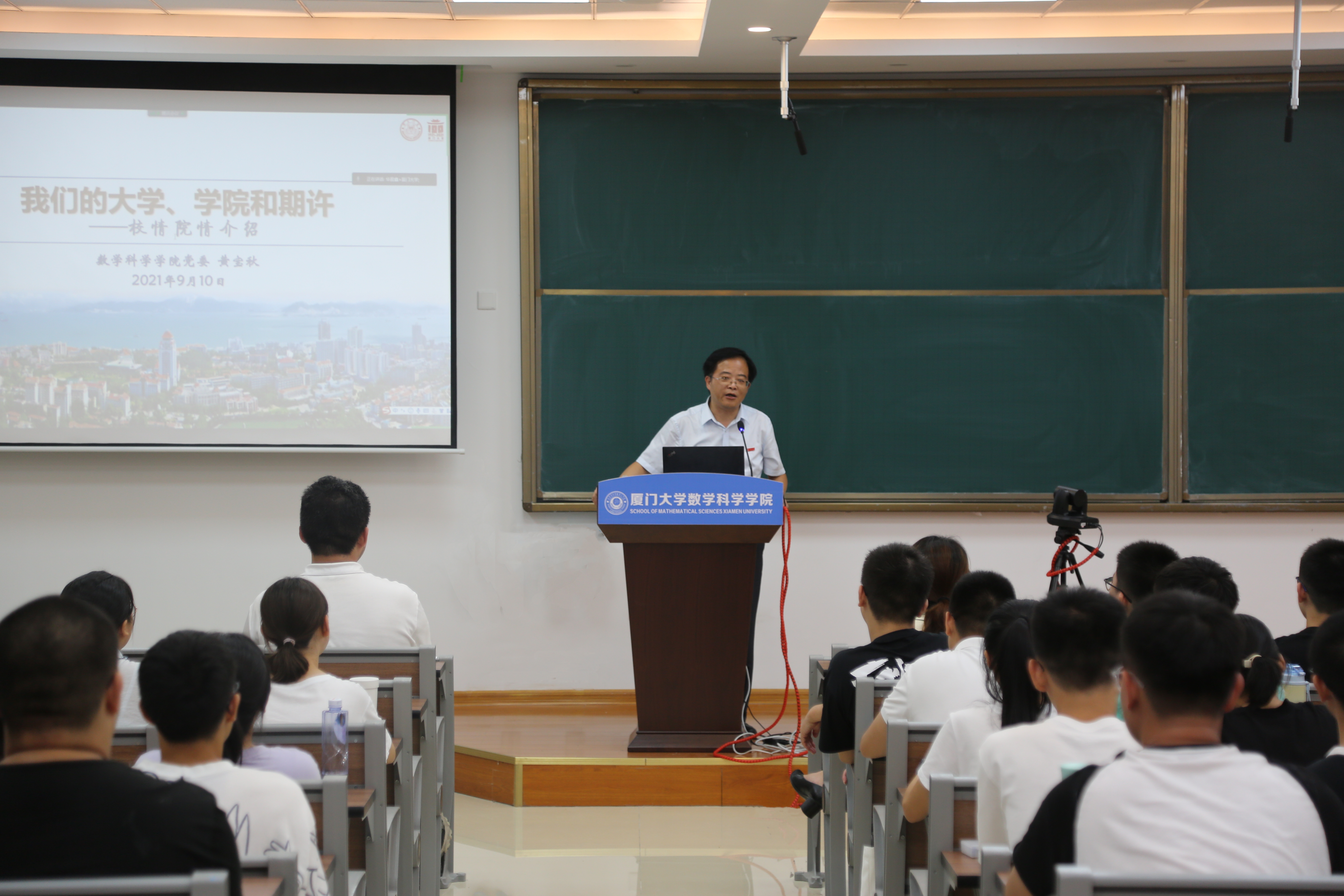 黄宝秋书记首先代表学院向来自五湖四海的厦大新百年新学子表示热烈祝贺,向全体新生家长致以诚挚祝福。他以《我们的大学、学院和期许》为题,向新生及家长介绍了校情及院情,为学院2021级本科新生讲授了“第一堂思政课”。他说,厦门大学是一所理想远大、敢于担当的大学,是一所坚守信仰、追求真理的大学,是一所精神独特、底蕴深厚的大学,是一所充满情怀、深具大爱的大学。他结合习近平总书记致厦门大学建校100周年重要贺信精神和厦门大学百年历史文化积淀形成的“四种精神”,从学校人才培养、学科特色、师资水平、科研实力、办学条件、社会评价等方面,介绍了厦门大学百年来取得的发展成就,并展望了学校第二个百年发展愿景,期许新同学传好新百年接力棒,勇做新征程的奋斗者、创造者,为“双一流”建设贡献新力量。