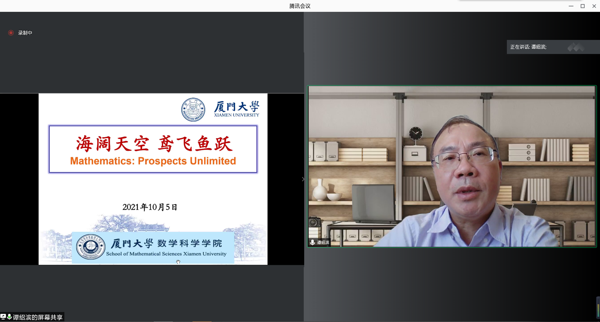 10月5日,9001cc金沙院长谭绍滨教授为2021级全体本科生上第一堂新生研讨课。根据教学安排与疫情防控要求,本次研讨课在线上进行,数学与应用数学系副主任杜妮副教授、辅导员华盈鑫共同参加。