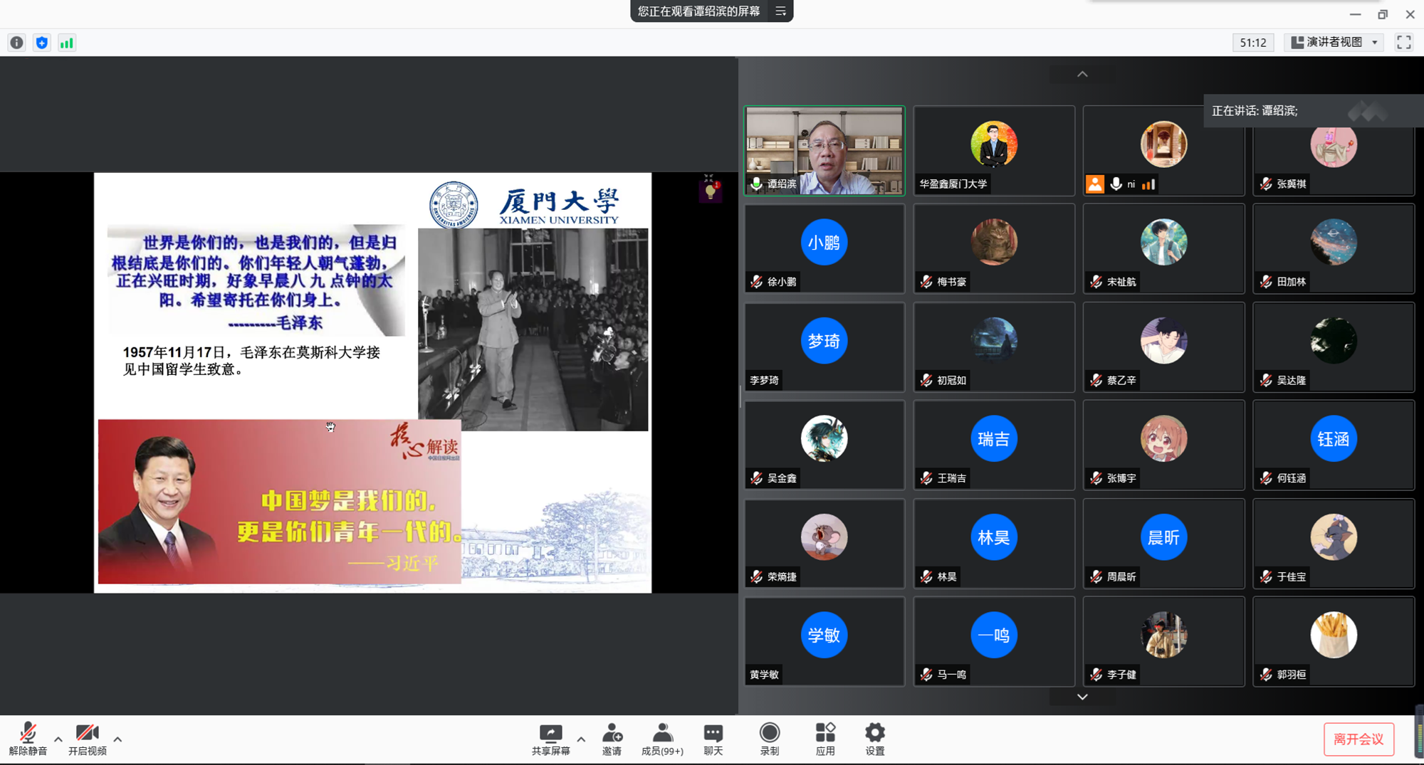 从代数方程求解,到Galois群论;从欧拉、高斯的才华横溢,到伽罗瓦、阿贝尔的年轻有为,一代代青年人前赴后继,不懈求索,推动着数学学科不断迈上新台阶。在课程的最后,谭绍滨院长对同学们寄予厚望:正值厦大开启新百年征程,恰逢国家前所未有地重视基础学科人才培养新局面,希望所有同学都能勇于抓住机遇、敢于迎接挑战,用年轻的心、涌动的激情,为数学注入年轻的力量,为建设数学强国梦努力奋斗。