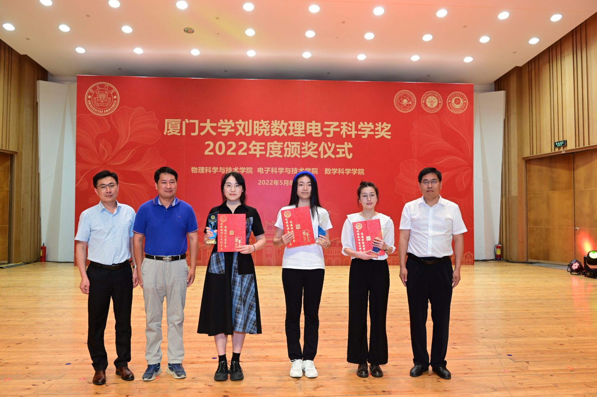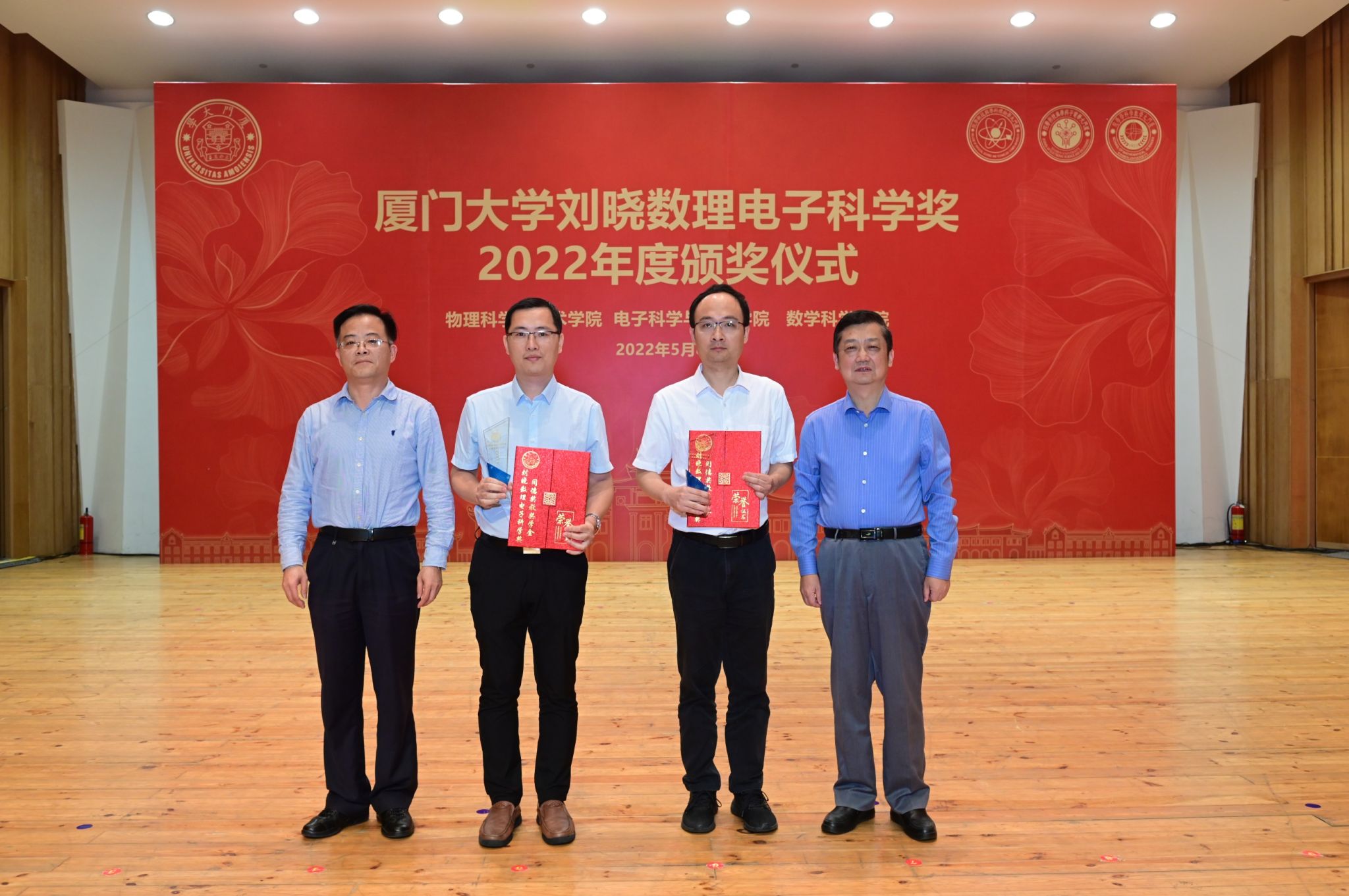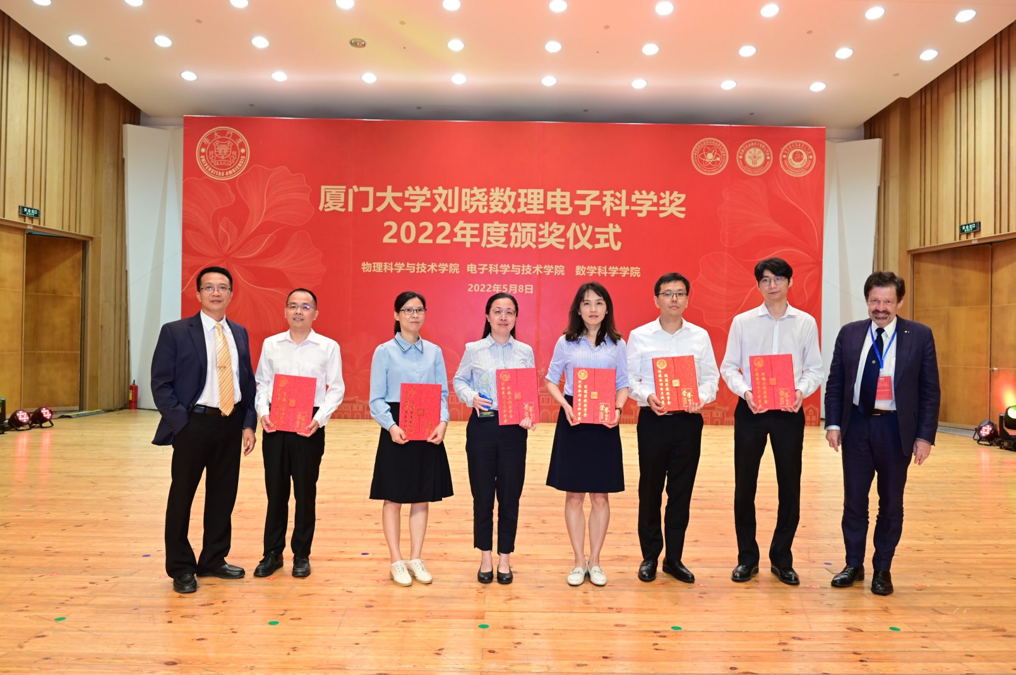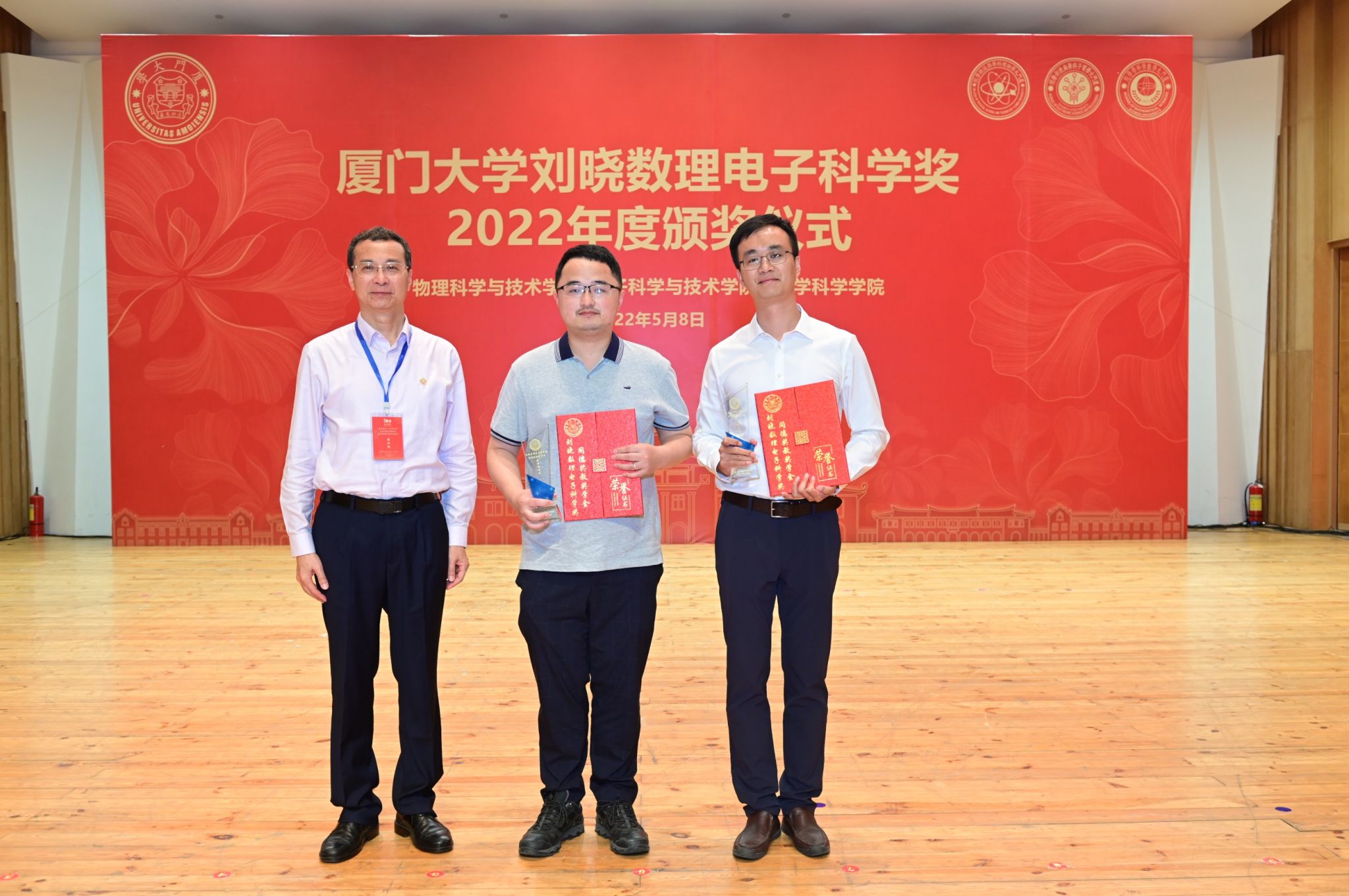 5月8日下午,2022年厦门大学“刘晓数理电子科学奖”(下设“同德奖教学金”)颁奖典礼在科艺中心音乐厅隆重举行。9001cc金沙6名教师获“同德奖教金”突破贡献奖、2名教师获“同德奖教金”教书育人奖、2名教师获“同德奖教金”科学探索奖,2名本科生、3名研究生获“同德奖学金”青年英才奖,获奖师生代表上台接受颁奖。1980级物理系校友、深圳格亮光电有限公司董事长刘晓,学校关工委常务副主任、校友总会副理事长赖虹凯以及有关部处负责人、学院党政领导为获奖者颁奖。