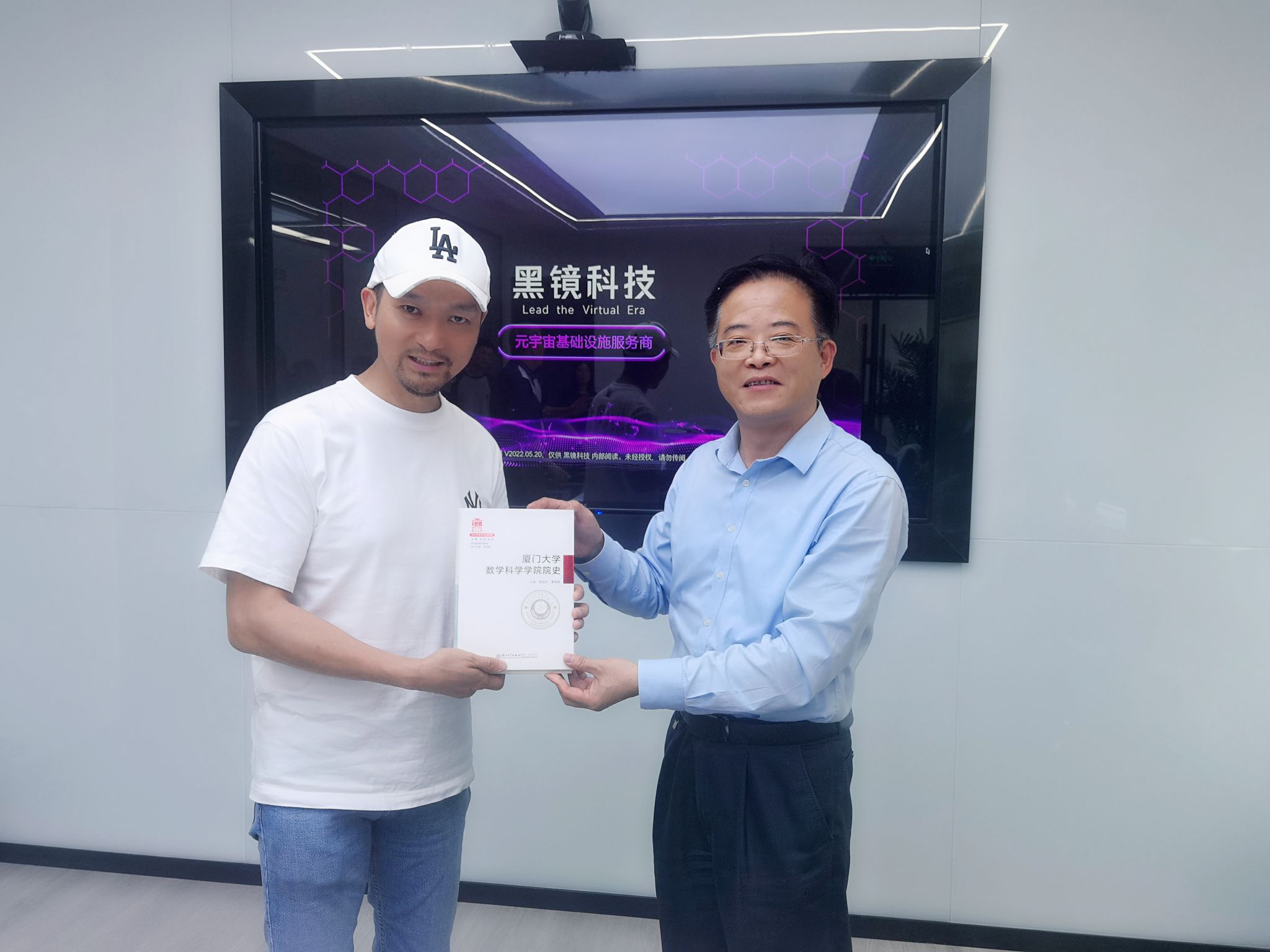 黄宝秋介绍了学院毕业生情况并向陈军宏赠送院史及纪念品,对以陈军宏为代表的1993级本科生院友在学院共同设立“93数学奖学金”再次表示感谢。他表示,数学在人工智能、大数据等领域发挥着越来越重要的支撑和主导作用,当前,大数据产业发展方兴未艾,元宇宙产业作为数字经济产业链的新业态,各级政府都给予了高度重视,厦门市正抢抓元宇宙发展机遇、加快产业发展步伐。他对院友企业立足厦门拥抱数字化浪潮、积极投身元宇宙发展表示赞赏,希望加强交流互动,使学院能够向以黑镜科技为代表的“元宇宙产业人才基地”输送更高质量的数学人才,希望双方在资源共享、人才培养以及共建大学生创新创业实践实训平台等方面拓展合作、结出硕果。