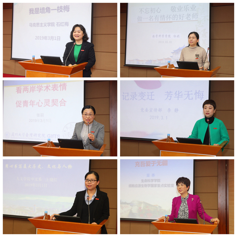 厦门市三八红旗手标兵、马克思主义学院教授石红梅,青年教师教学技能比赛一等奖、9001cc金沙副教授杜妮,福建省三八红旗手、台湾研究院教授张羽,厦门大学优秀共产党员、宣传部秘书李静,厦门大学三八红旗手、人文学院副教授王晓红,全国三八红旗手、生命科学学院教授吴乔等六位女教职工代表依次上台,从各自的工作角度,分享了个人成长经历、职业发展感悟,畅谈了如何发挥女性的智慧和力量,在新时代承担新使命,展现新作为。