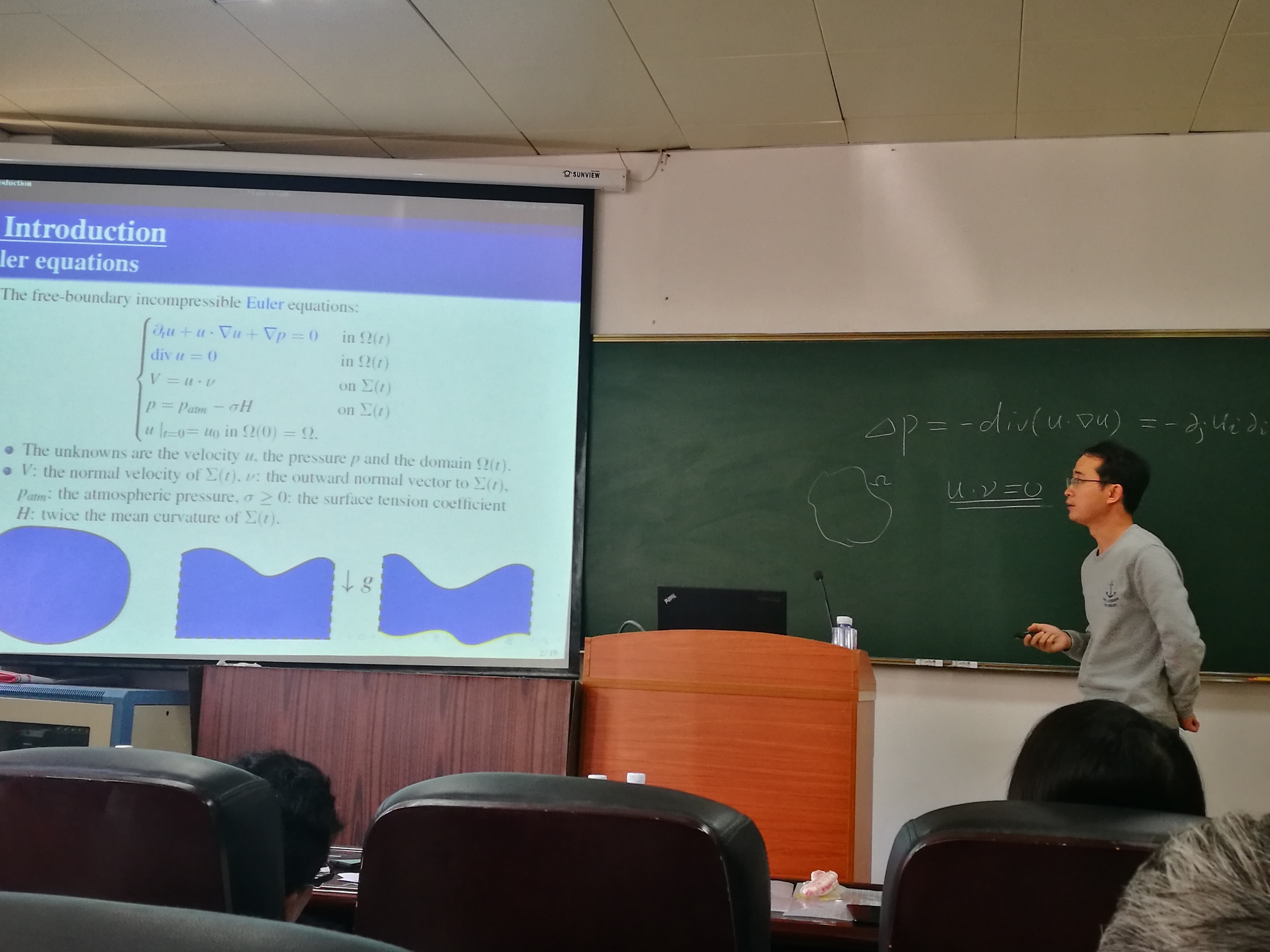 上午和下午的学术报告会分别由邱建贤副院长和张然副院长主持,双方数学工作者奉献了8场精彩的学术报告。吉林大学高丽媛、王培洁、聂元元、于浩然、李欣欣分别做题为《The instrituion fuction in income gap evolution》、《Inference on Semiparametric Transformation Model with General Interval-censored Failure Time Data》、《Perturbation Problems of Continuous Subsonic-Sonic Flows in Convergent Nozzles》、《Transfer and Its Applications》、《Linearized Alternating Direction Method of Multipliers with Adaptive Stepsize》的学术报告,我院梁薇、王焰金、黄文分别做题为《Empirical Likelihood for Differentiable Functionals under Doubly Censorship》、《Incompressible inviscid resistive MHD surface waves in 2D》、《Riemannian optimization and averaging symmetric positive definte matrices》的学术报告。