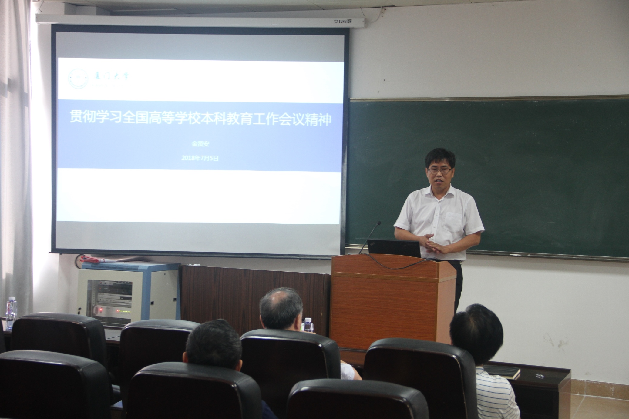 金贤安副院长传达了新时代全国高等学校本科教育工作会议精神。他结合会议基本情况和教育部陈宝生部长讲话精神两方面进行传达。621日,教育部在四川成都召开新时代全国高等学校本科教育工作会议。会议强调,要深入学习贯彻习近平新时代中国特色社会主义思想和党的十九大精神,全面贯彻落实习近平总书记今年52日在北京大学师生座谈会上重要讲话精神,坚持“以本为本”,推进“四个回归”,加快建设高水平本科教育、全面提高人才培养能力,造就堪当民族复兴大任的时代新人。