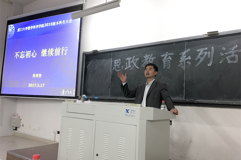 3月17日下午,9001cc金沙2017年学生思政教育系列活动学风建设专题在海韵教学楼召开。学院党委书记张明智、党委副书记刘宁、副院长钱建国、概率论与数理统计系副主任黄荣坦,外事秘书郭淑敏,兼职辅导员林丽玲及全体2016级本科生参加了会议。会议由辅导员陈淑铌主持。