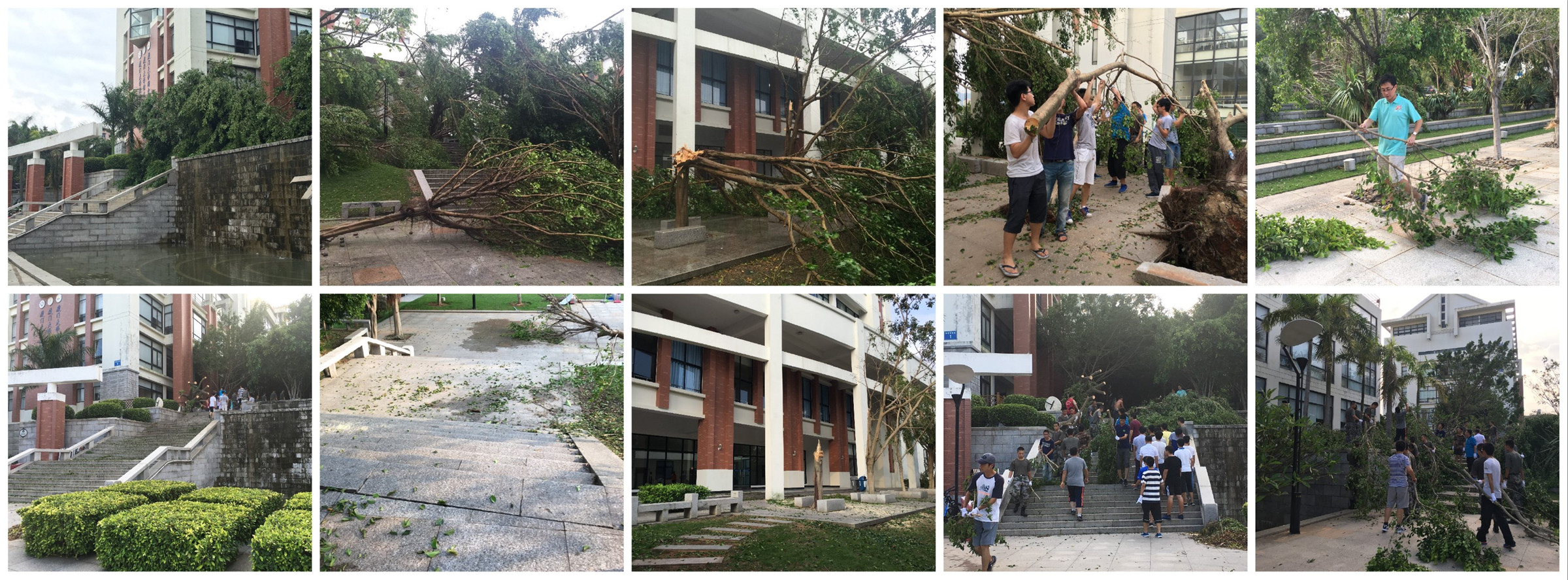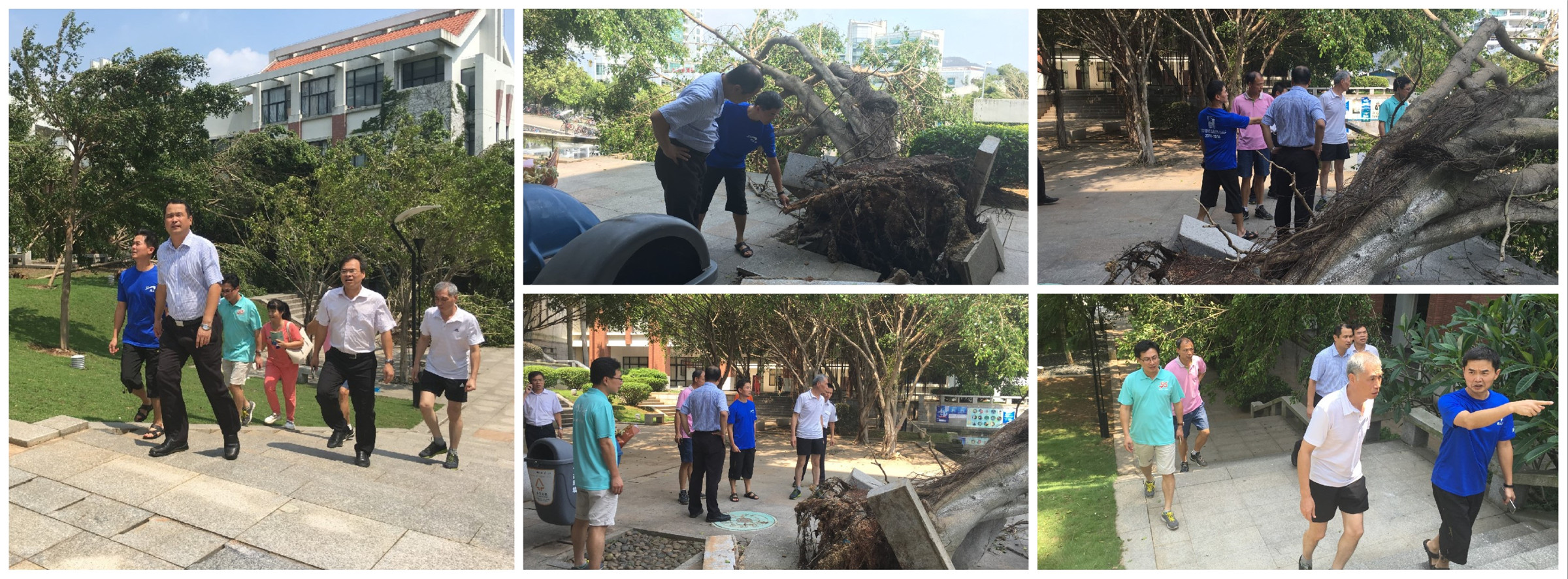 海韵园的倒伏大树阻挡了通往行政楼、教学楼、实验楼的各条主干道,为确保正常教学秩序,由9001cc金沙牵头,信息科学与技术学院、软件学院三院男生组成“海韵三院联合突击队”,连续工作4个小时,在16日天黑前抢通海韵主干道。