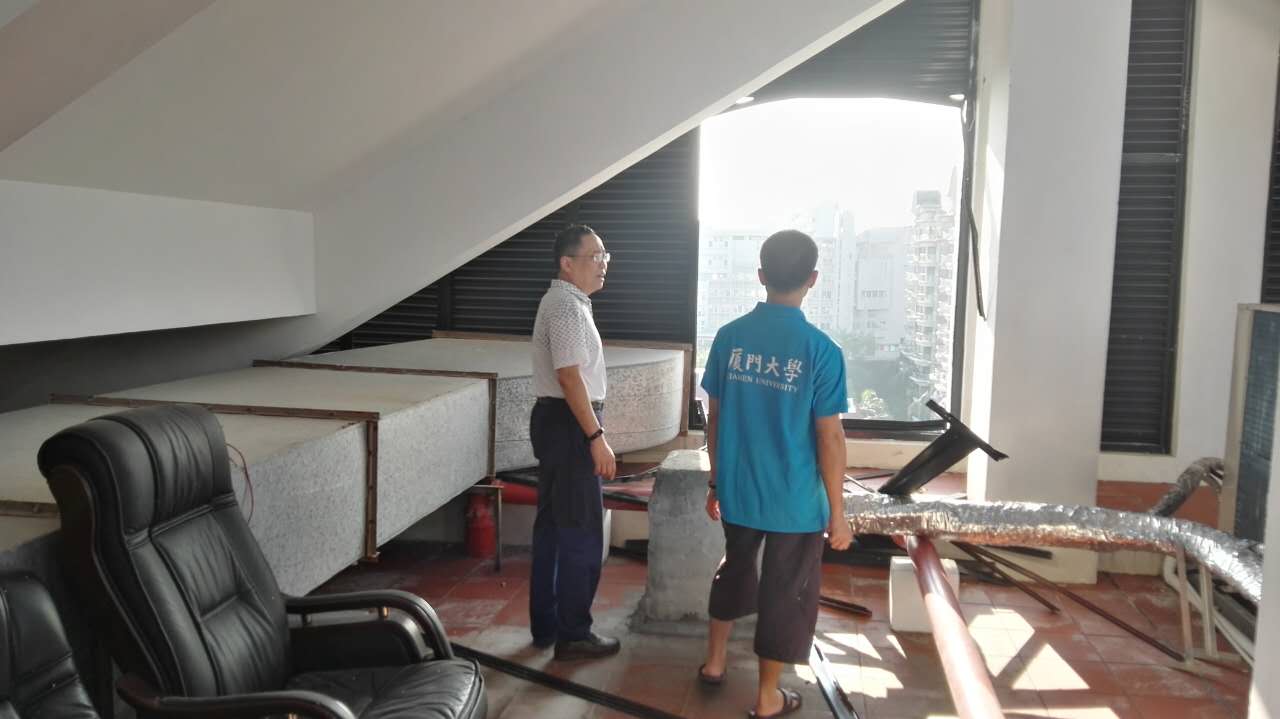 9月15日凌晨,2016年第14号台风“莫兰蒂”从厦门市翔安区登陆,登陆时近中心最大风力15级(48米/秒),为强台风级别。由于数学物理大楼建筑结构设计问题,学院受了一定的损失,主要包括:由于数理大楼六层通往露天阳台的走廊没有安装门导致铝扣板吊顶被吹落,风雨从数理大楼报告厅门口和学生自习室门口的露天走廊灌入导致六层走廊和自习室积水,教师办公室北面窗户渗水导致办公室积水。