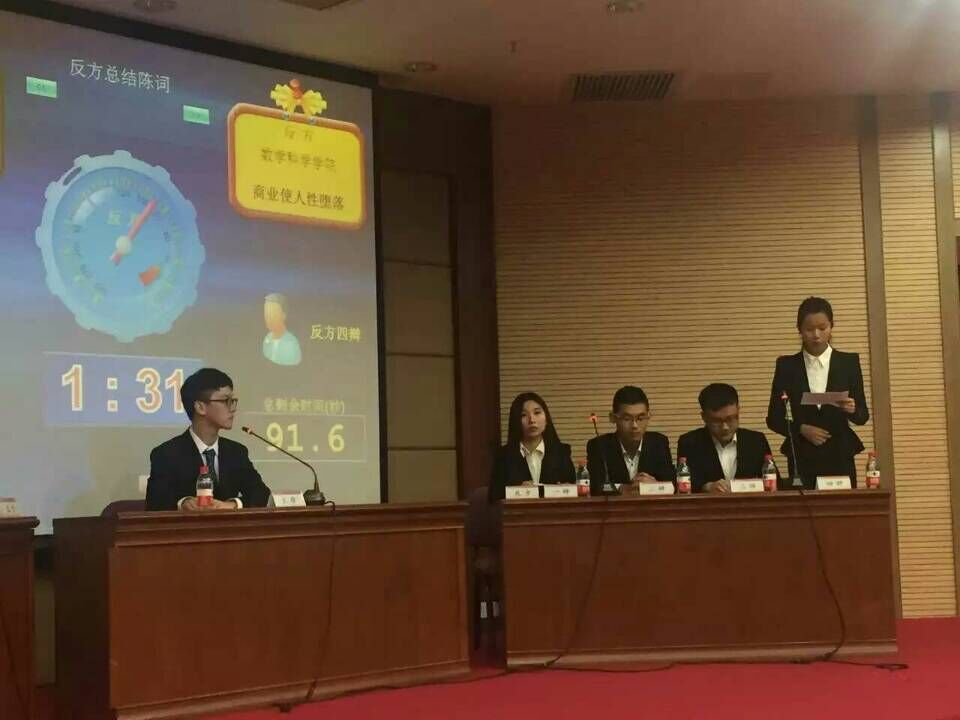 决赛正式开场。正方论述了商业使人性升华,提出商业的发展对社会进步带来积极影响。我院作为反方则通过当下社会热点魏则西事件、百度医疗竞价排名,说明商业是赚钱机器,一味追求利益,埋没人性,推论出商业使人性堕落。双方唇枪舌剑,就商业的定义、商业起源以及在社会中的影响等各方面进行了激烈的交锋。灵敏的思维,犀利的言辞,引来了现场观众的阵阵掌声。