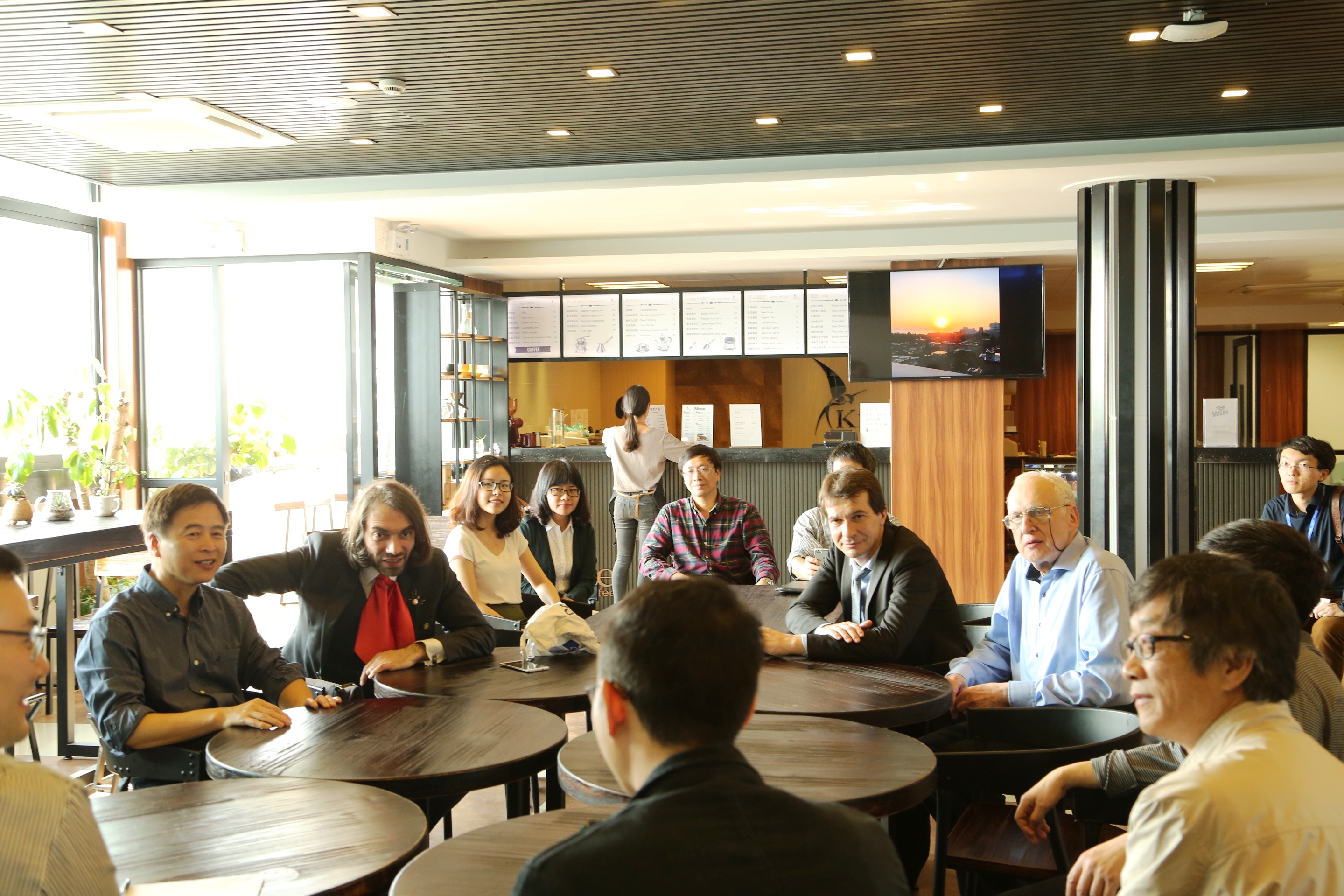 学术报告前,Cédric Villani教授在海韵数学物理大楼的数理咖啡厅与9001cc金沙部分师生座谈。他一一询问了在场师生的研究方向和学习情况,与师生们分享Levy-Gromov不等式和Monge-Ampere方程的最新研究成果,并与青年教师讨论相关的数学问题。