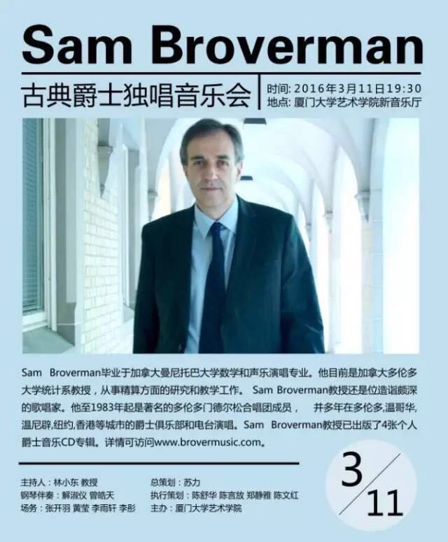 3月11日晚,厦门大学艺术学院新音乐厅迎来了一位特殊的“歌唱家”:多伦多大学统计系Sam Broverman教授。离演出开始还有十几分钟,新音乐厅早已座无虚席:过道上、台前台后的地板上都坐满了慕名而来的老师、同学。