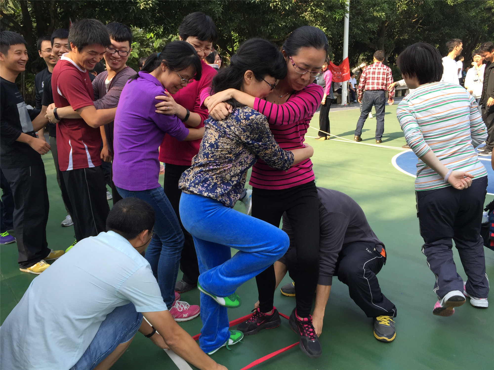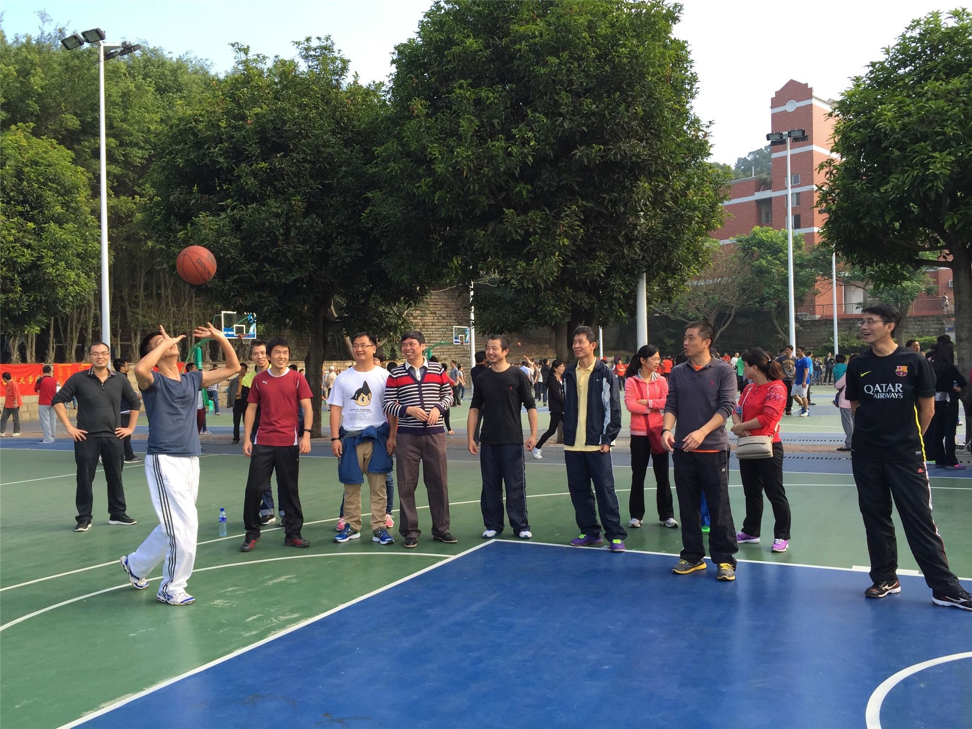 我院教职工8:30am便齐聚在这里,大家先行练习集体跳绳。跳绳看似简单,不过是一甩一跳,但这甩和跳却是数学、物理学、材料学、心理学和运筹学等的综合运用。半个多小时的磨合后,我们便正式参赛表演了。为了保证尽可能不被甩绳绊到,15名跳绳的老师不得不将一分钟内的每次跳跃发挥到极致。看排头的刘轼波老师几乎要跳出画面了!