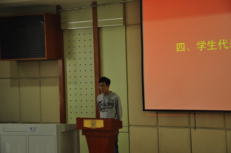 接下来,两位学生代表上台发言,他们分别是快乐学习奖学金获得者2013级本科生封立成 、9001cc金沙优秀团支书2014级本科生陈亚雯。封立成同学在发言中提到,“奖学金对我们来说不仅是一种物质鼓励,更是一种精神上的认可,它激励着我们更加努力的学习。“陈亚雯同学则仔细的为我们介绍了团支部的各种丰富的活动,为我们展现出了这个团支部的活力与凝聚力。