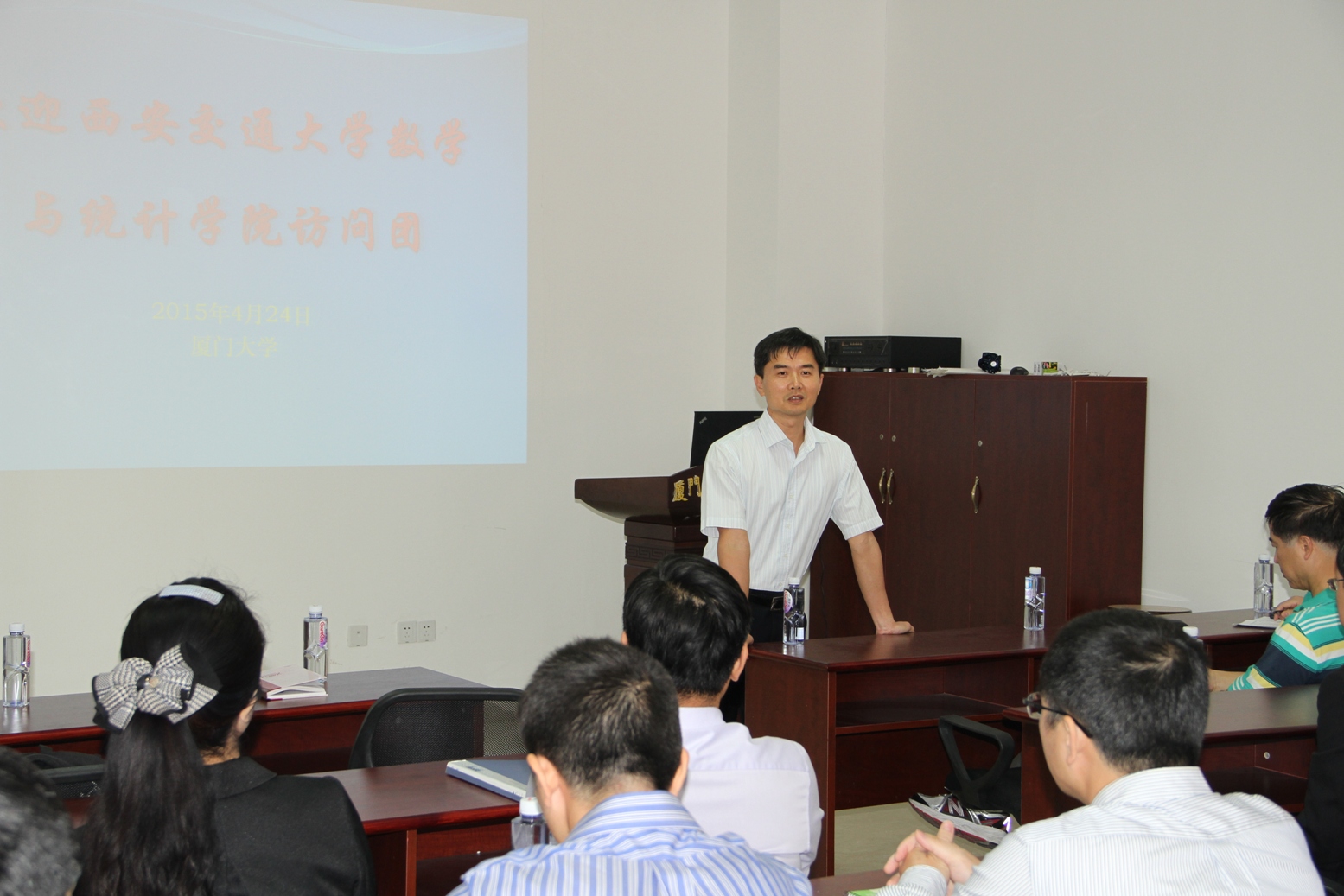 张明智书记致欢迎词,他对西安交通大学数学与统计学院一行的来访表示表欢迎。张书记说,西安交通大学是一所著名高校,数学学科实力雄厚,影响广泛,在多年的发展中形成了独具特色的专业和研究方向,非常值得我院的学习。厦门大学数学学科有过辉煌的历史,也经历过发展的低潮,感谢西安交通大学长期以来对我院发展的大力支持。他说,近几年,我院重视与兄弟院校加强交流学习,举办联合学术报告会,为年轻学者搭建交流平台,提供展头露面的机会,分享学术研究成果,营造浓厚学术氛围,通过相互学习,取长补短,互帮互助,达到共同进步的目的,有力的推动了数学学科的发展和提升。他预祝学术报告会取得圆满成功。