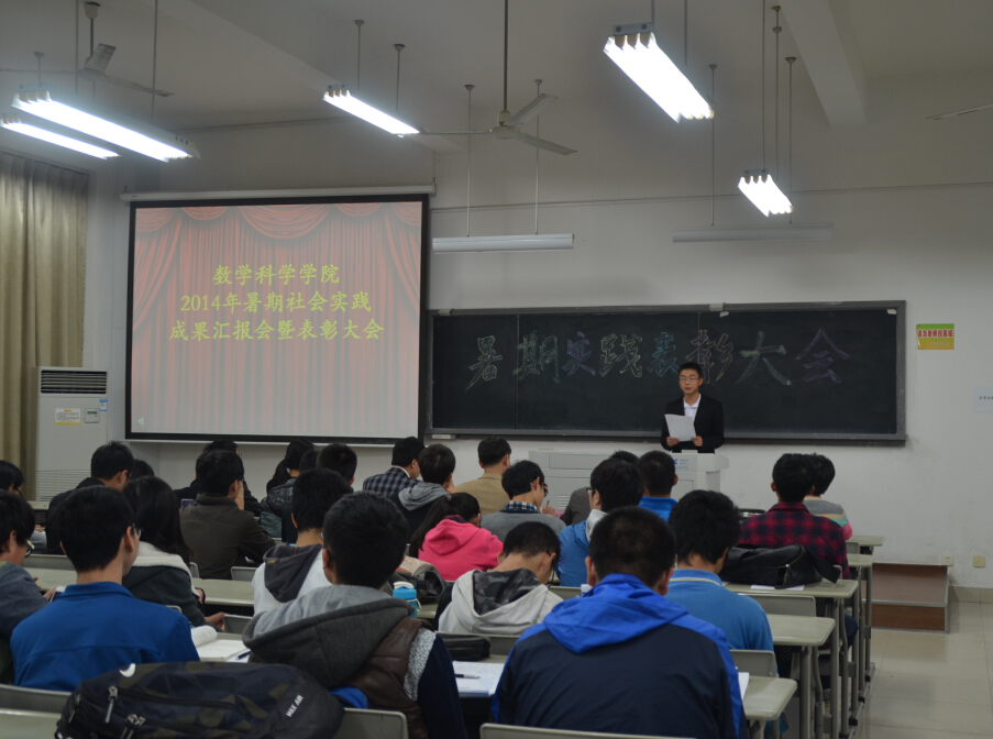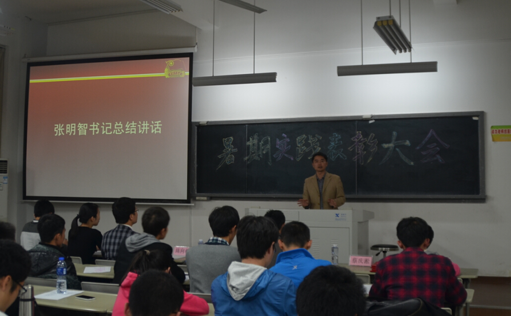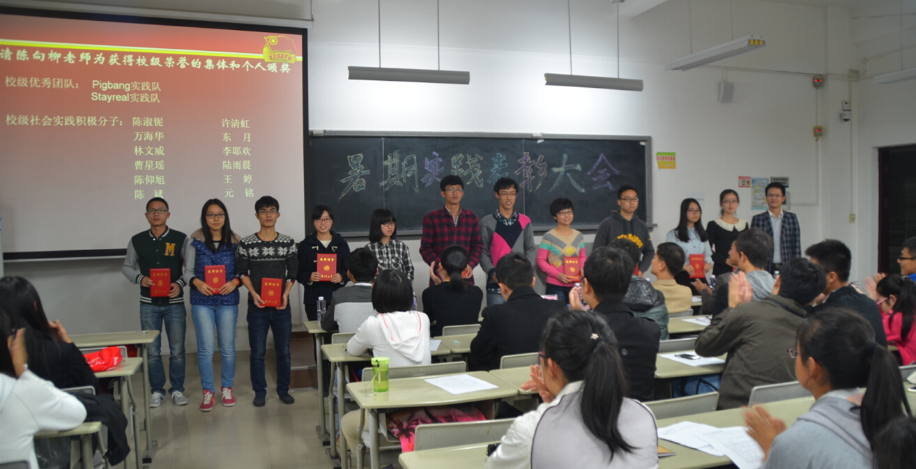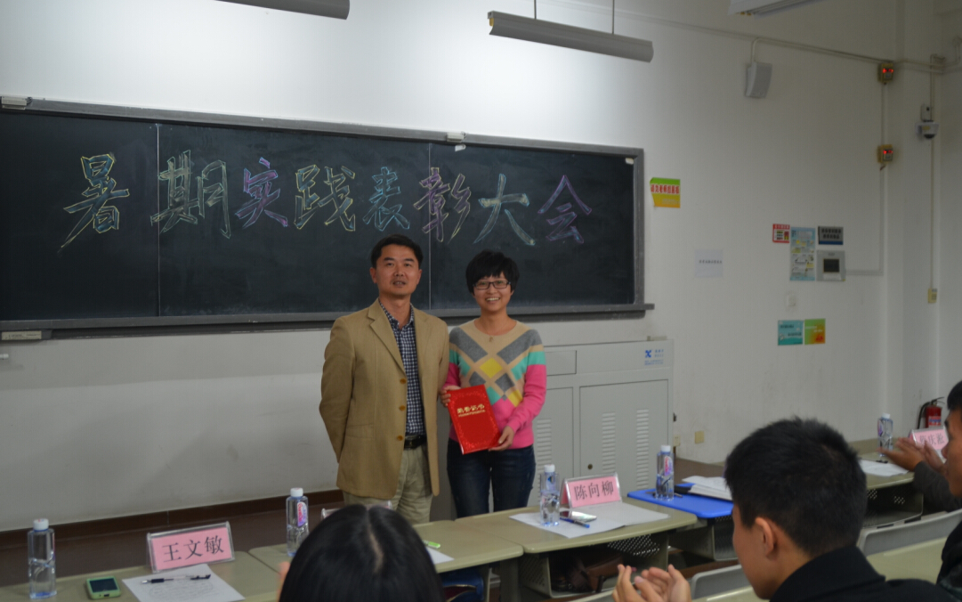 2014年12月4日晚7点,我院在海韵教学楼202教室成功召开暑期社会实践表彰大会。院党委书记张明智、院团委书记陈向柳、辅导员石义凯、兼职辅导员陈淑铌、王文敏、柯颖等老师以及学院两会一中心学生干部代表、2013级暑期社会实践队代表和2014级本科生参加本次大会。