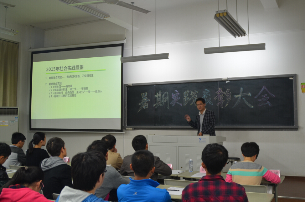 大会伊始,陈向柳老师简要地介绍了我院本年度暑期社会实践的组织情况。我院共有79名本科生和35名硕士研究生参与到今年的社会实践活动中。社会实践的内容和形式主要集中在社会问题的调研、支教以及个人实习。对于今年的社会实践,我院团委提早进行了部署和组织工作,实践取得了不错的成效。但陈向柳老师也指出了我院学生参与积极度不足的问题,希望能有更多的同学参与到社会实践的活动中来。最后,他还对社会实践活动的日后发展进行了展望,希望更多的同学能深入社会基层,走向农村,走向西部,走向生产的第一线。
