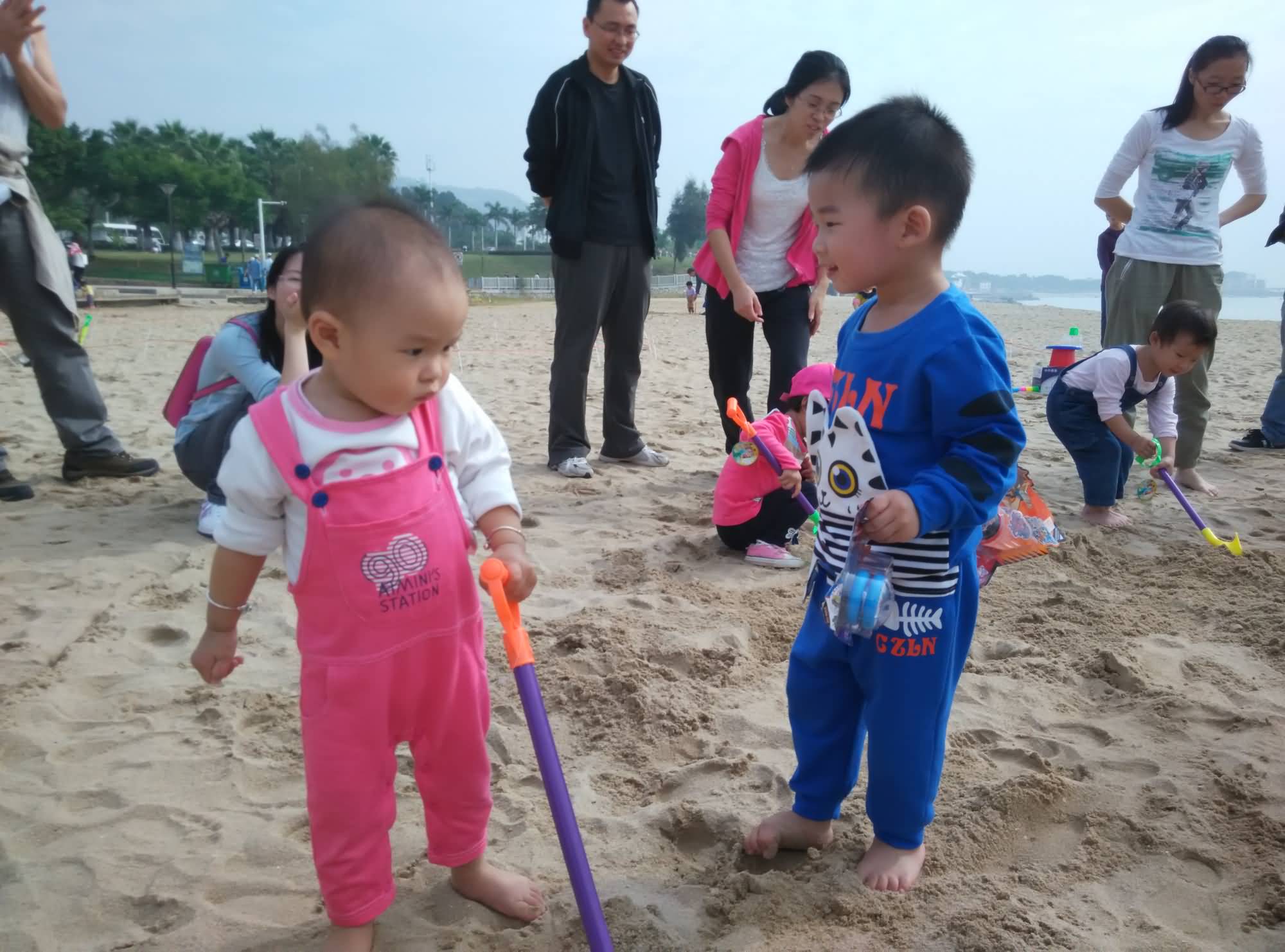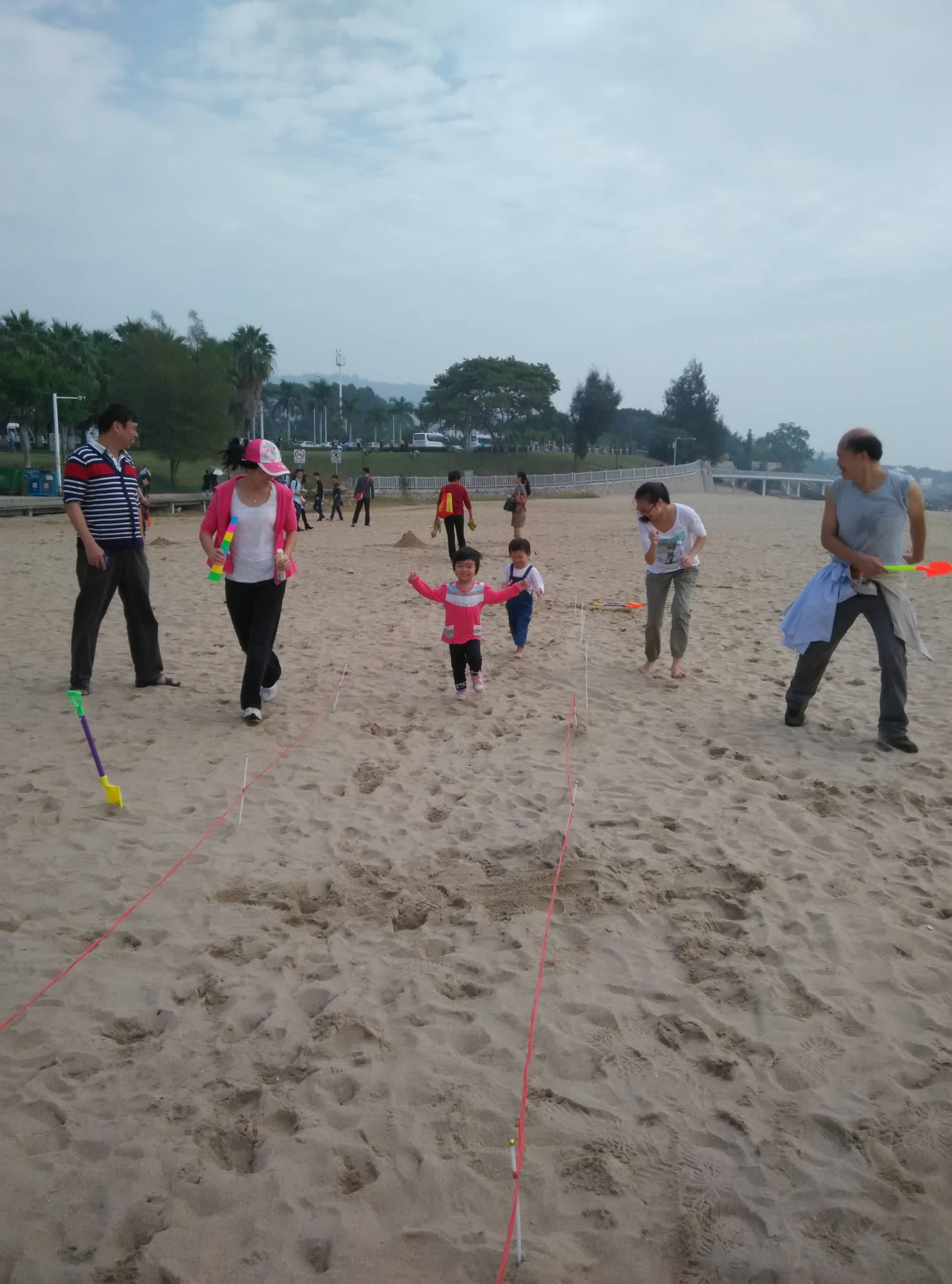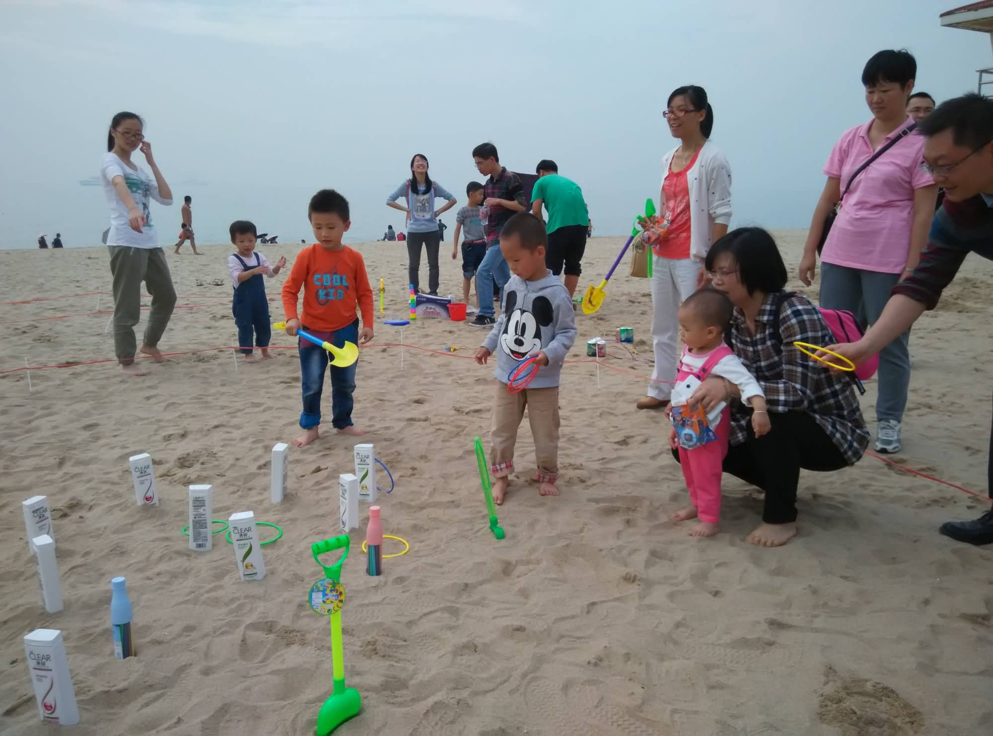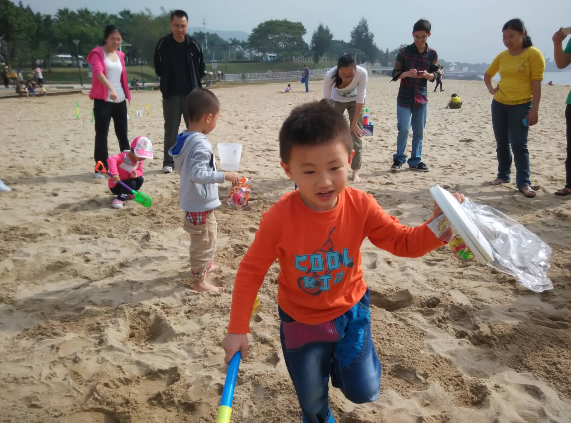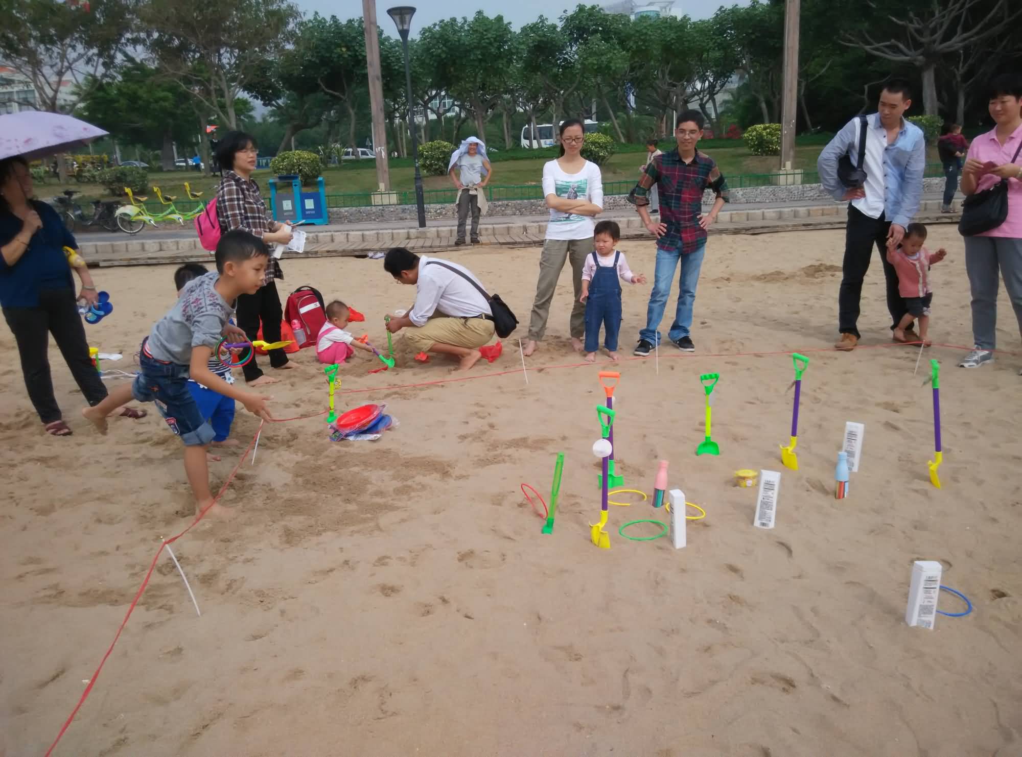 本次的亲子活动一共有三个项目,一是沙滩寻宝,由小朋友们拿着沙滩铲在规定的范围内进行挖掘,寻找事先埋藏好小礼品;