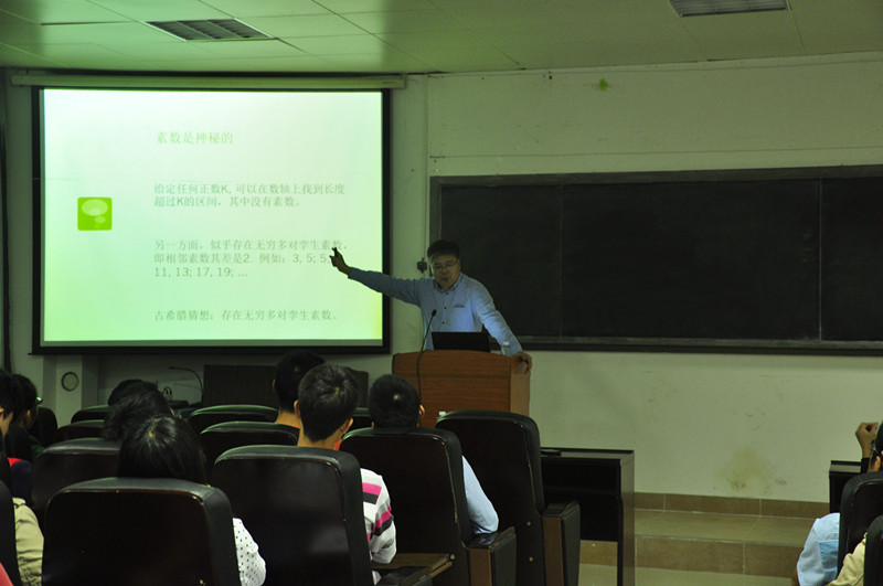 11月9日晚上,山东大学刘建亚院长为我院师生做了一场《孪生素数猜想》的学术报告。我院师生慕名而来,实验楼105座无虚席。刘建亚院长介绍孪生素数猜想的研究历史,并着重介绍了我院校友陈景润和华人数学家张益唐在猜想研究中的贡献。刘建亚院长幽默风趣的演讲风格博得师生们的阵阵掌声。