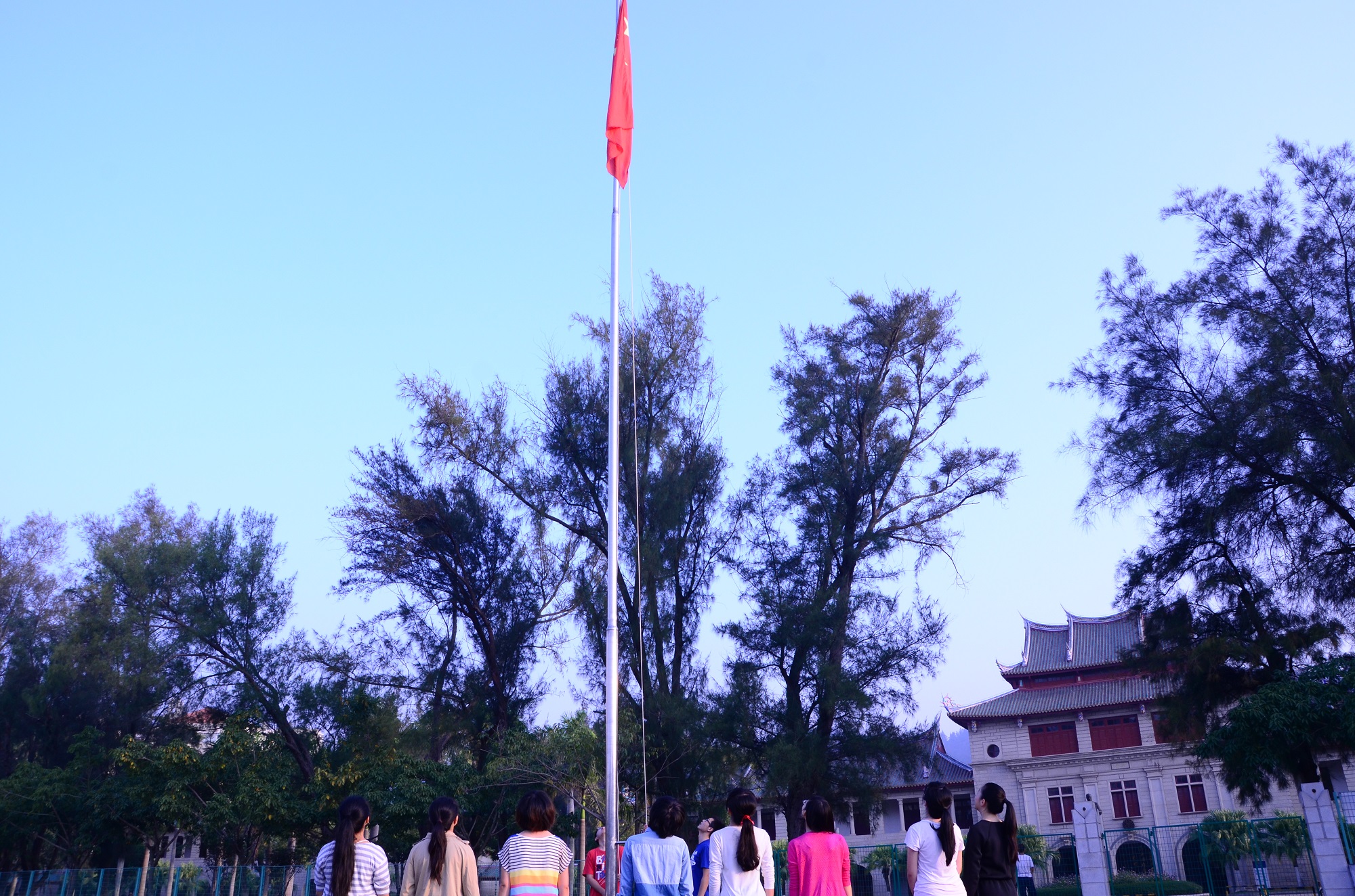 早上六点,太阳还在酝酿初升的气势,大多数同学还在睡梦中。12级党支部成员们已经从床上爬起,来不及吃早饭,乘着薄薄晨雾,穿越长长的芙蓉隧道,赶赴嘉庚广场。芙蓉湖畔氤氲水汽与嘉庚主楼和谐地组合在一起,笔直的旗杆伫立在广场当中,和我们一起等待着红旗与朝阳一同升起的那刻。