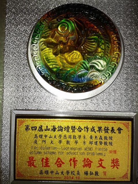 开幕式上,我院的邱建贤教授和高雄中山大学的黄杰森教授联合发表研究论文《An Eulerian-Lagrangian WENO finite volume scheme for advection problems》获得“第四届山海论坛最佳合作论文奖”。共有5篇论文获此奖。此奖项鼓励表彰三校科学研究人员的实质性合作。
