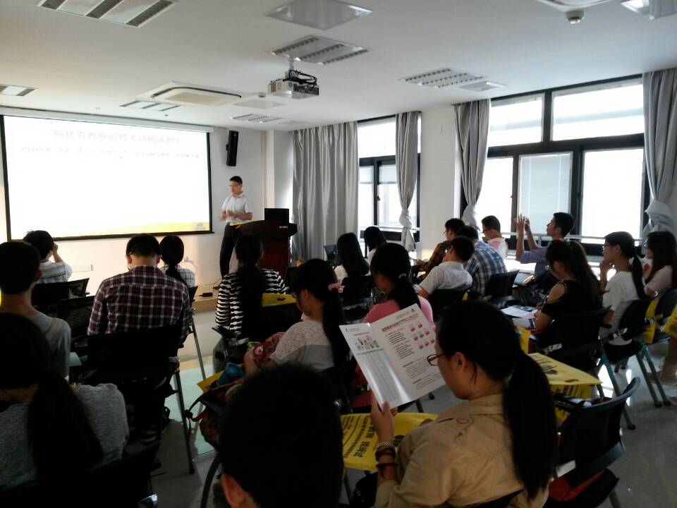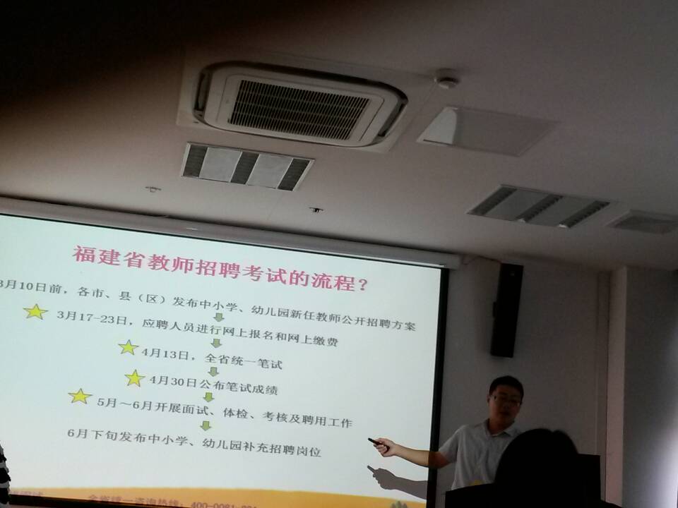 首先开始的是关于教师资格证考试以及教育行业招聘考试的专场辅导讲座,讲座主题为“福建省教师招聘考试政策公告解读及考情分析”,主讲人为闽试教育的郭子夏老师。郭老师从四个方面帮助大家了解福建省教师招聘的具体内容。首先是对教师资格认定相关政策进行解读,其次是对福建教师招聘考试政策要求进行解释,再次是对福建教师招聘考试考情进行解析,最后,郭老师对即将要参加福建省教师招聘考试的同学进行现场的备考指导。
