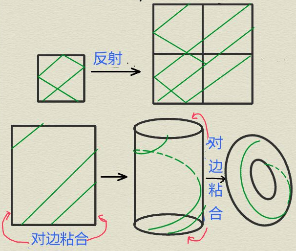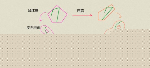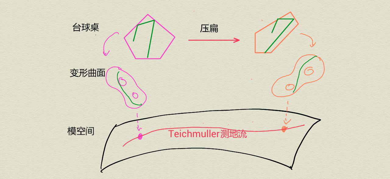 为了研究台球的长期运动轨迹,一个有用的方法是想象沿运动轨迹方向慢慢地压扁台球桌,以至在给定时间内,我们可以看到更多的台球运动轨迹。原始的台球桌变成了一系列新的台球桌,这个变换也可以想象成在数学家所说的模空间上航行,这个模空间是由给定边的数目的所有可能的台球桌组成的。通过将每个台球桌变成一个被称为“变形(translation)曲面”的抽象曲面,数学家可以通过了解所有变形曲面组成的模空间来分析台球的运动。研究人员已经证明通过了解压扁台球桌运动在模空间形成的“轨道”(译者注:Teichmüller测地流)有助于回答许多有关原始台球桌的问题。