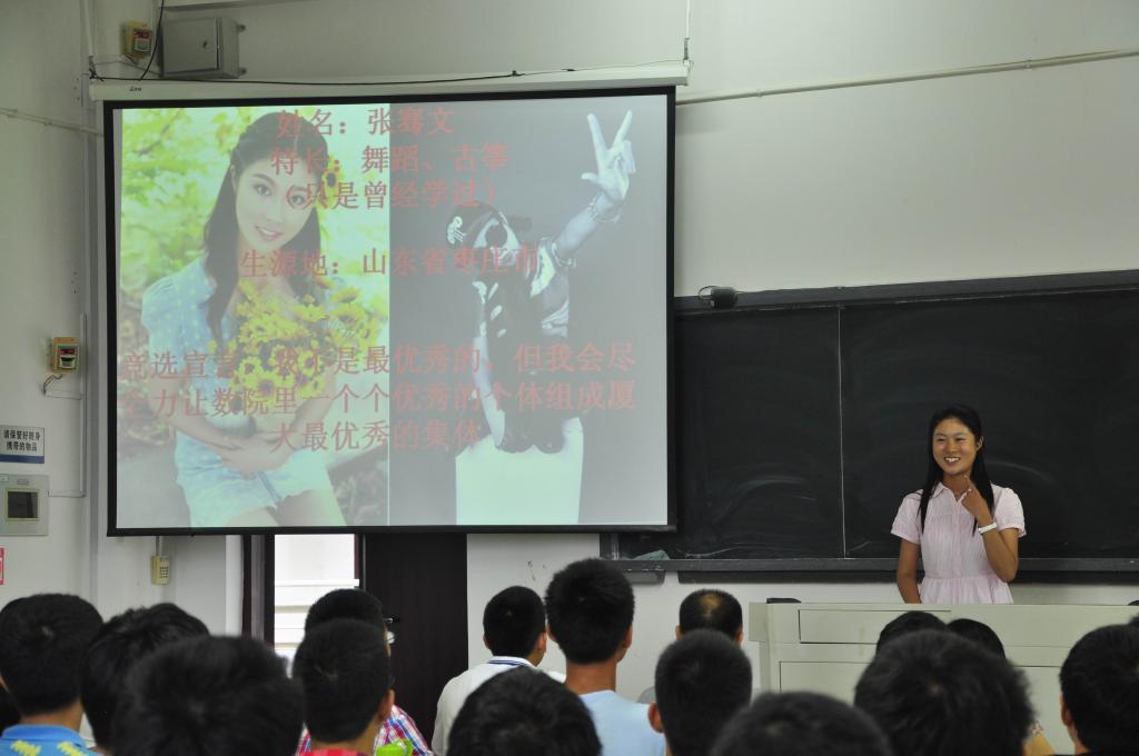 在主持人介绍完竞选程序后,便进入竞选演讲环节,两个班的25位同学充分地展现自我,风采各异,各显身手。1班由黄俊斌首个出场,演讲气场强大,观点明确,语言表达不乏幽默。王雅卓以正装出场,严肃认真,竞选突出为同学服务宗旨。杨静的演讲则简洁清晰,表达轻松自然,颇显大气。桂亦康展现了他对体育由衷的热爱,他希望通过体育将班级凝聚起来,带动同学们一起走出宿舍锻炼身体。