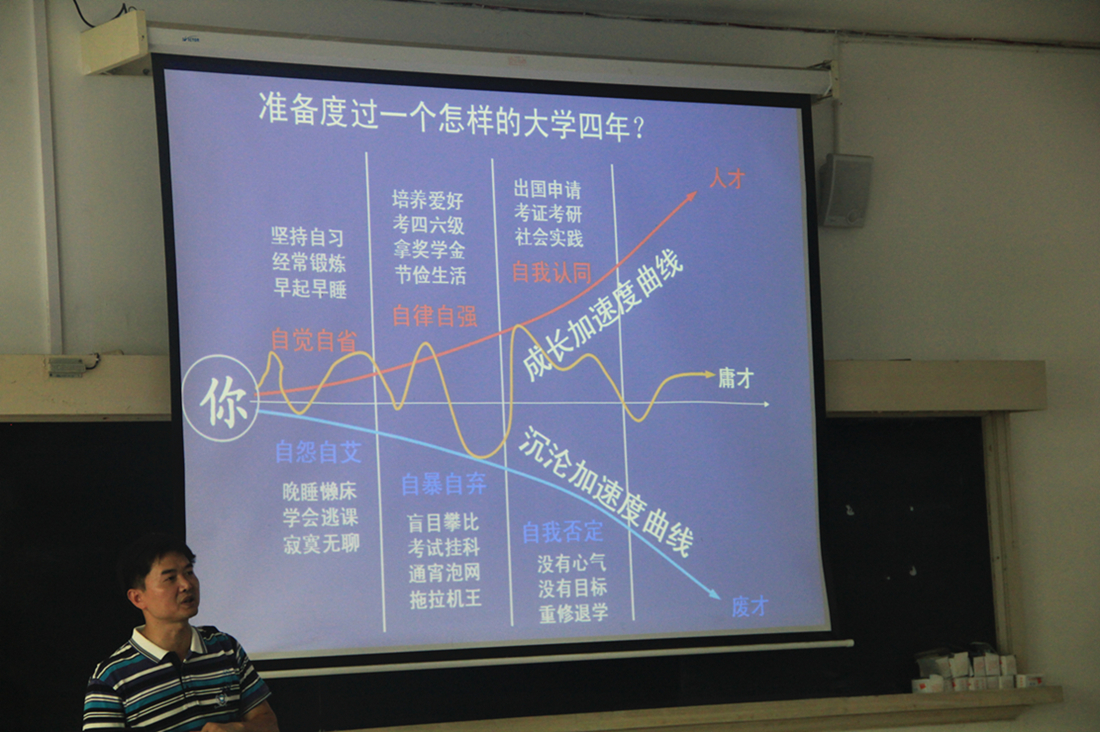 随后,张明智书记用简洁的文字和充满幽默感的图片全方位、多角度地为新生刻画出了一幅即将到来的生活图景,阐释了新生应该如何读大学。他首先分析了新生入学后在学习、生活、感情等方面可能出现的困惑,例如失落、迷茫、焦虑等,并一一给出了建议和要求。他提醒大家掌握好专业学习、学生活动、运动娱乐之间的平衡,学会调整自己的心理状态,尽快适应大学环境和学习生活。