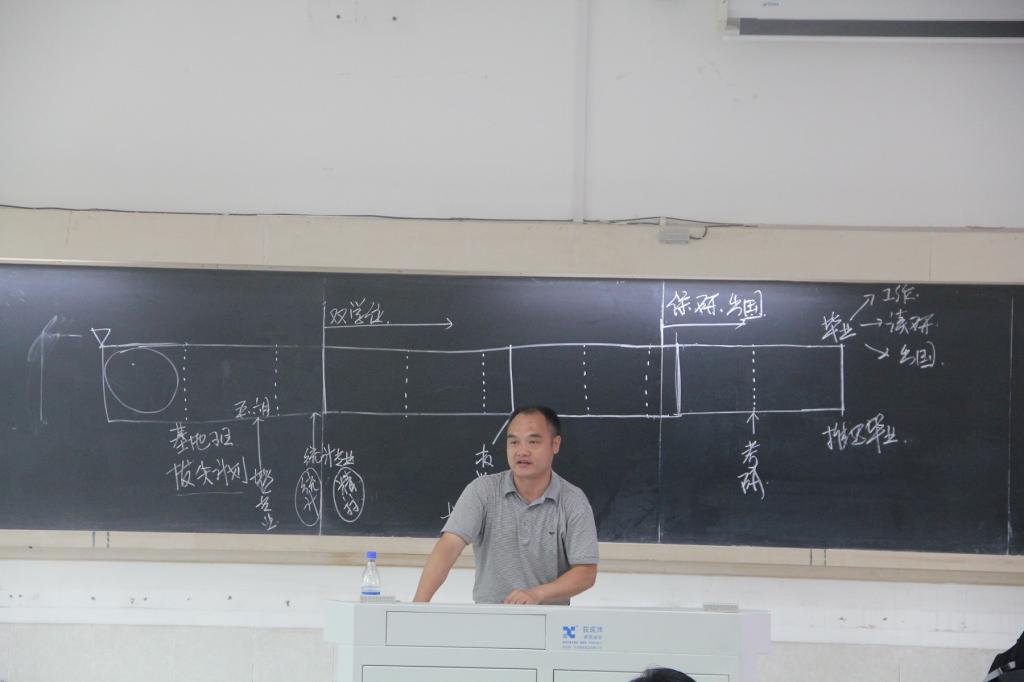接下来钱建国副院长在黑板上画了数院本科学生学业时间轴,将4年来学生学习的大事化为轴上一点,生动明了地告诉家长、学生每个时间点要发生的事情,并提醒家长、学生要做哪些准备。钱建国副院长对大学的规划及安排的介绍思路清晰,简单明了。他指出尤其是刚开始要注重中学与大学的衔接,及时调整孩子的心态,以避免孩子没适应大学对以后学习造成影响。“中学老师可能每一点都非常详细,但大学更看重自学能力。鼓励不畏艰难,发现数学中的乐趣。”