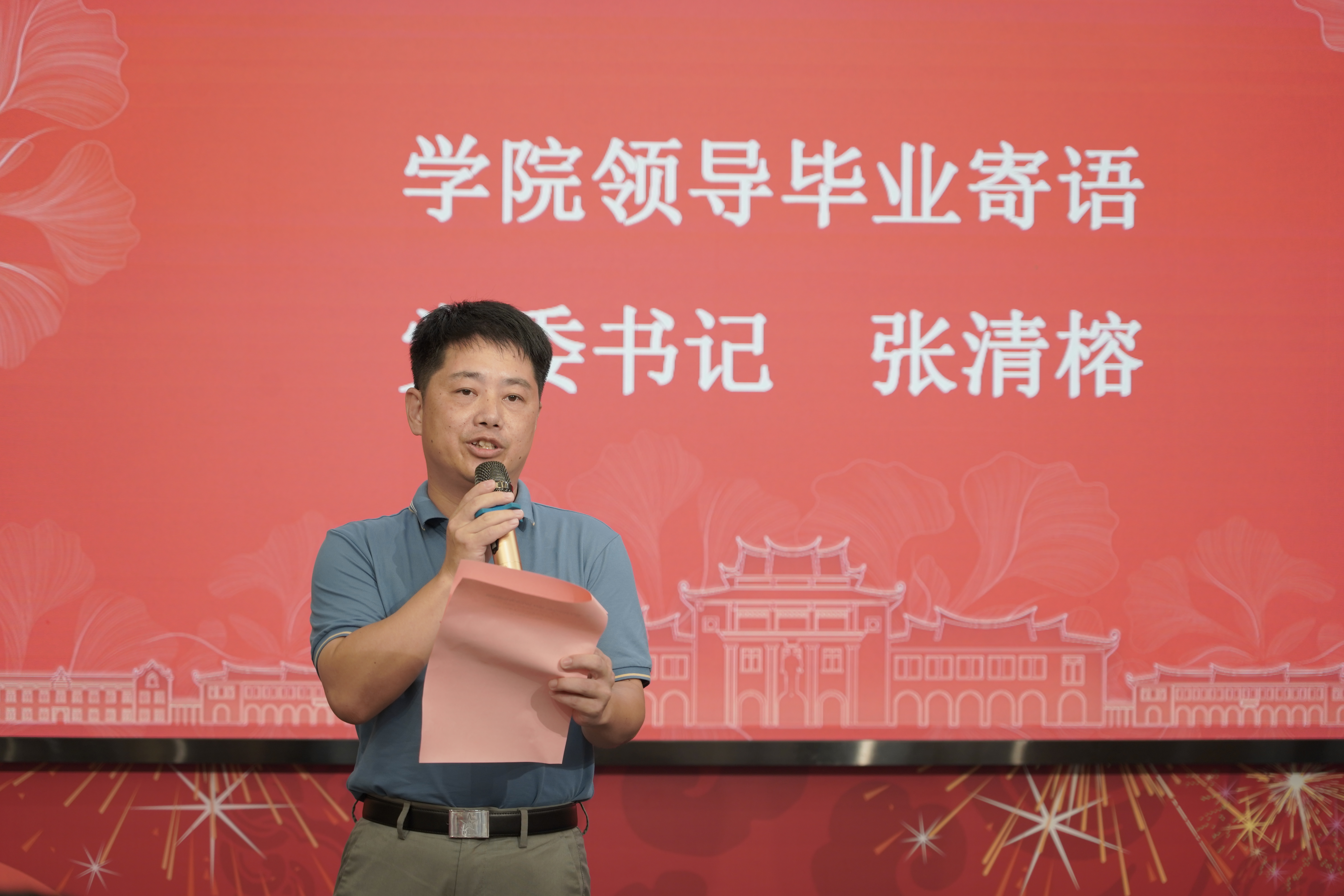 张清榕代表学院,向全体毕业生表示热烈祝贺并送上诚挚的祝福和殷切的期望。他高度肯定了同学们在校期间的优异表现,赞扬了景润青年的使命担当。他希望,身为“厦大数学人”,同学们一定要肩负起时代赋予的使命,努力成为我国科教事业的主力和各行各业的能手,不断锤炼自身本领。不忘初心,常怀感恩,无论今后走多远、飞多高,始终不忘回报社会,始终关注和支持母校、母院,为母校、母院发展建言献策,贡献力量。