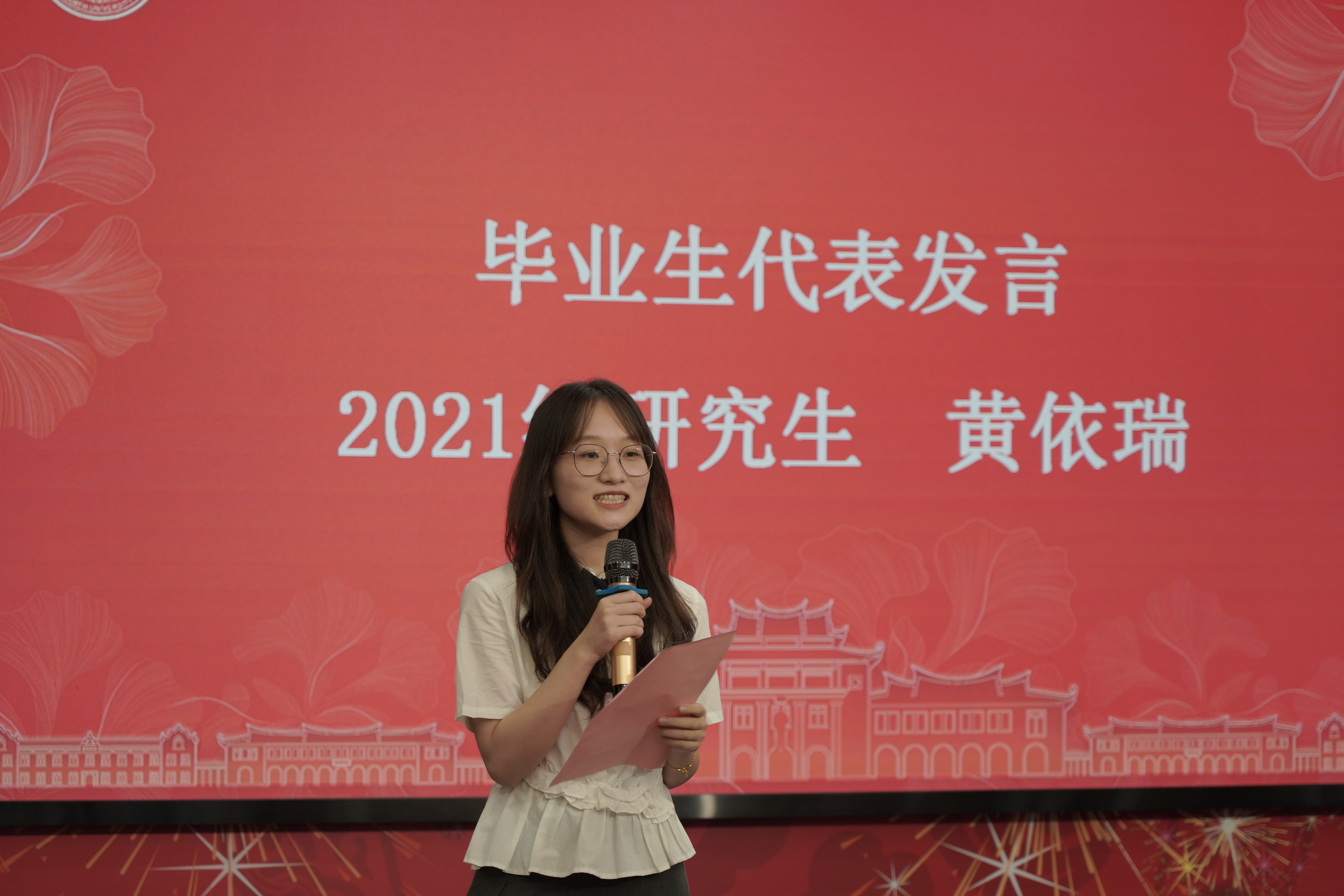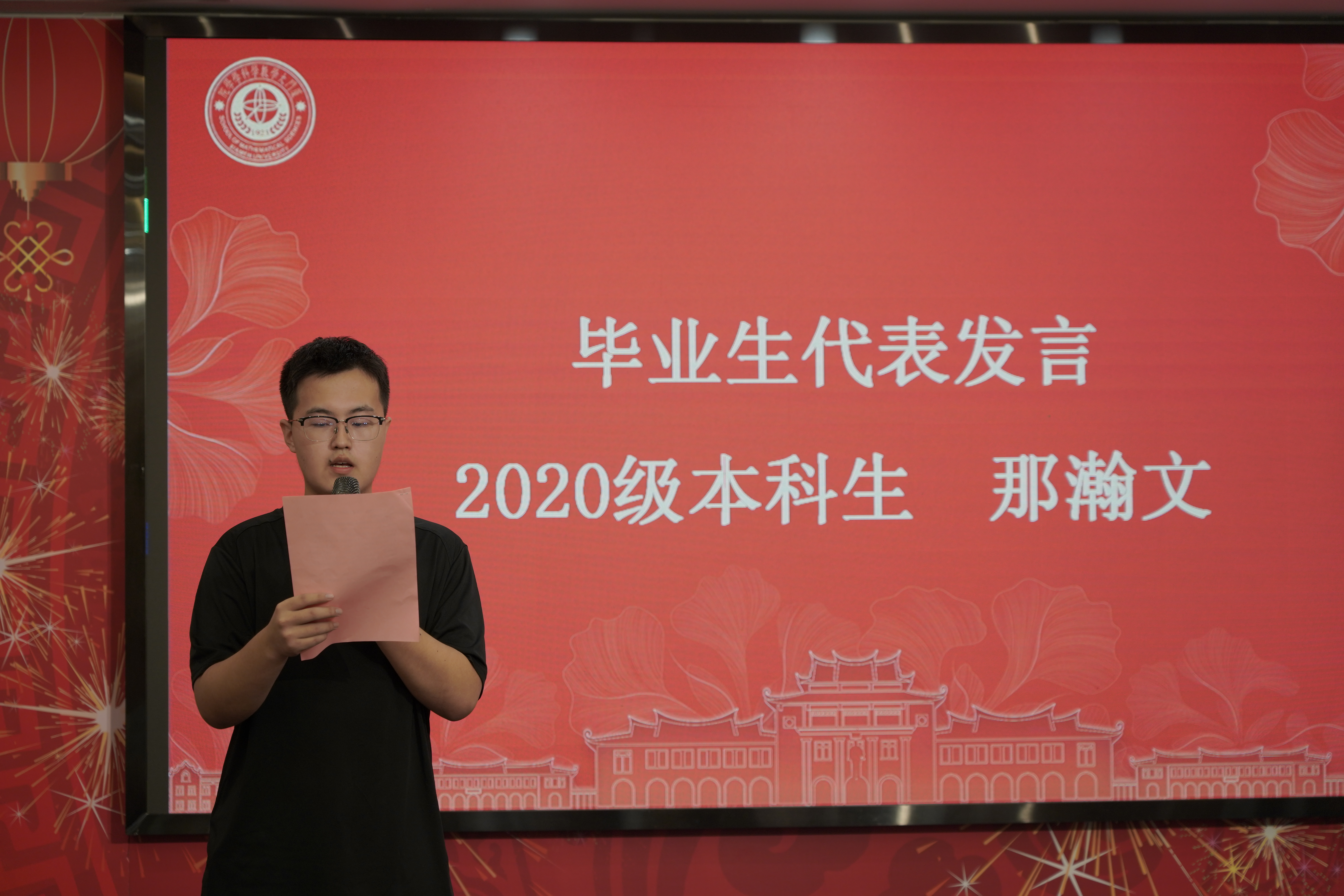 2020级本科生那瀚文、2021级硕士生黄依瑞代表学院2024届毕业生上台发言,祝贺大家顺利毕业的同时,也对母校、母院、师长和同学为大家供的支持和帮助表示感谢。他们共同回忆起在数院学习和生活的时光,历数自己几年求学的所获所感,感情充沛,言辞恳切。他们表示,无论之后将要去向何方,都会始终牢记“学无止境”,始终践行“知行合一”,以创造者、开拓者的姿态去探索更广阔的成长空间,不负学校和学院的殷切期望。
