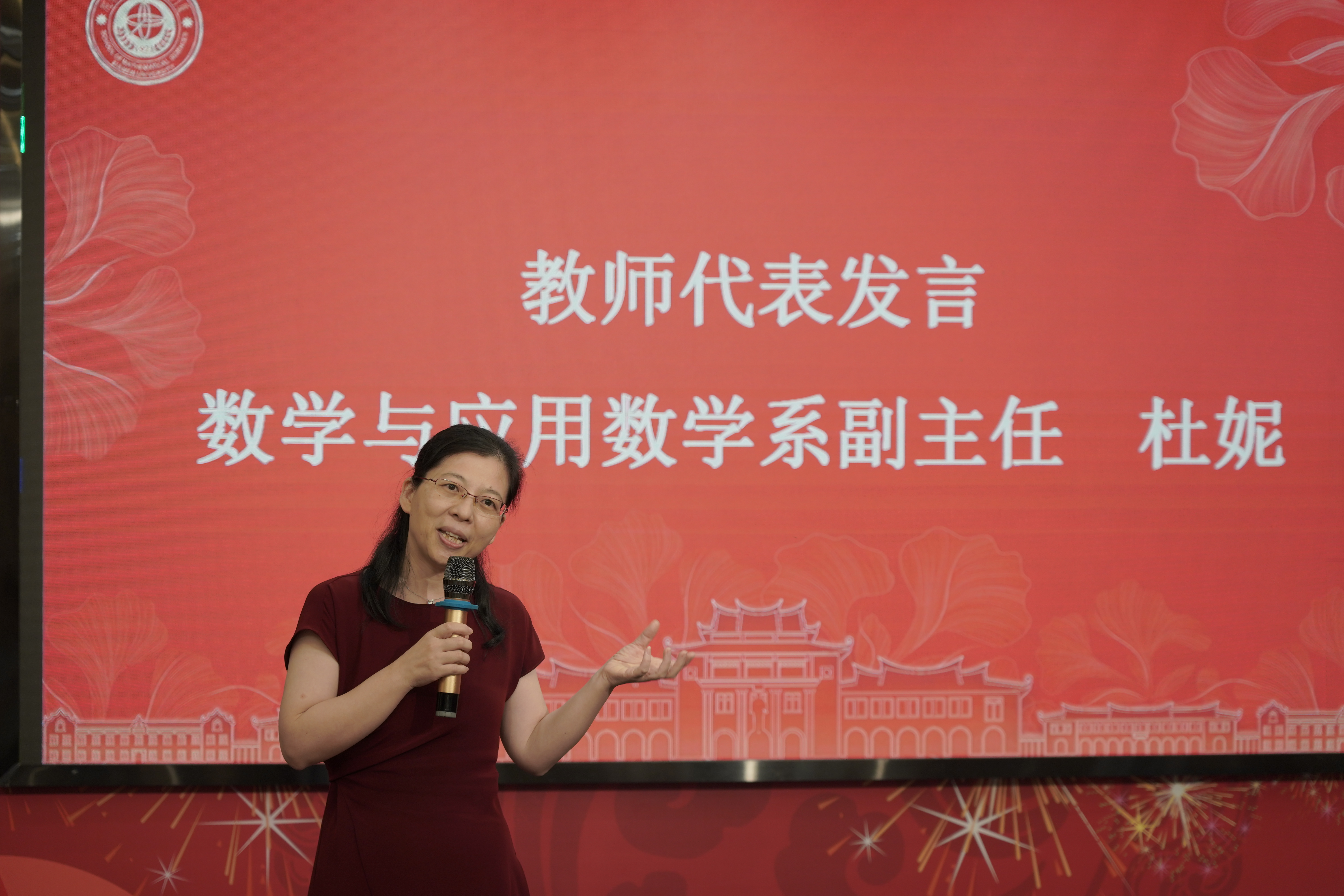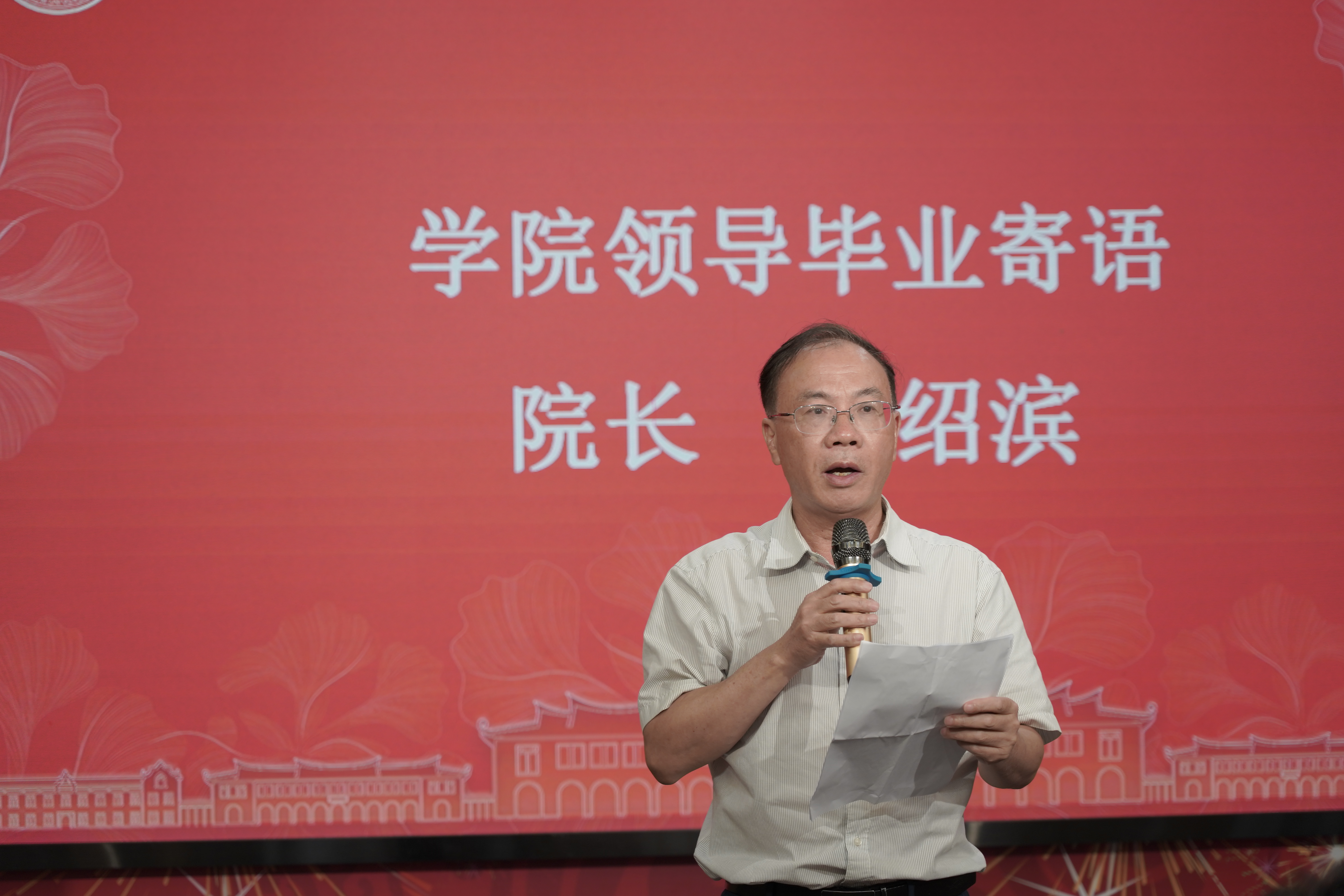 谭绍滨回顾了同学们在校学习时光并表达了对毕业生踏上新征程、实现新梦想的美好祝福。他指出,百年的厦大数学走出了一条与中华民族休戚与共、与时代发展同向同行的奋斗之路,同学们牢记“自强不息、止于至善”的校训和陈景润院士的科学精神,不仅付出了青春和汗水,也收获了人生的成长。他希望,同学们在充满变数的新征程上,一定要守常求变,常学常新,在砥砺前行的同时,时刻保持内心的定力,真正成就大我,充分利用自己所学报效祖国,为加快实现教育现代化、实现中华民族伟大复兴的中国梦贡献自己的青春力量。