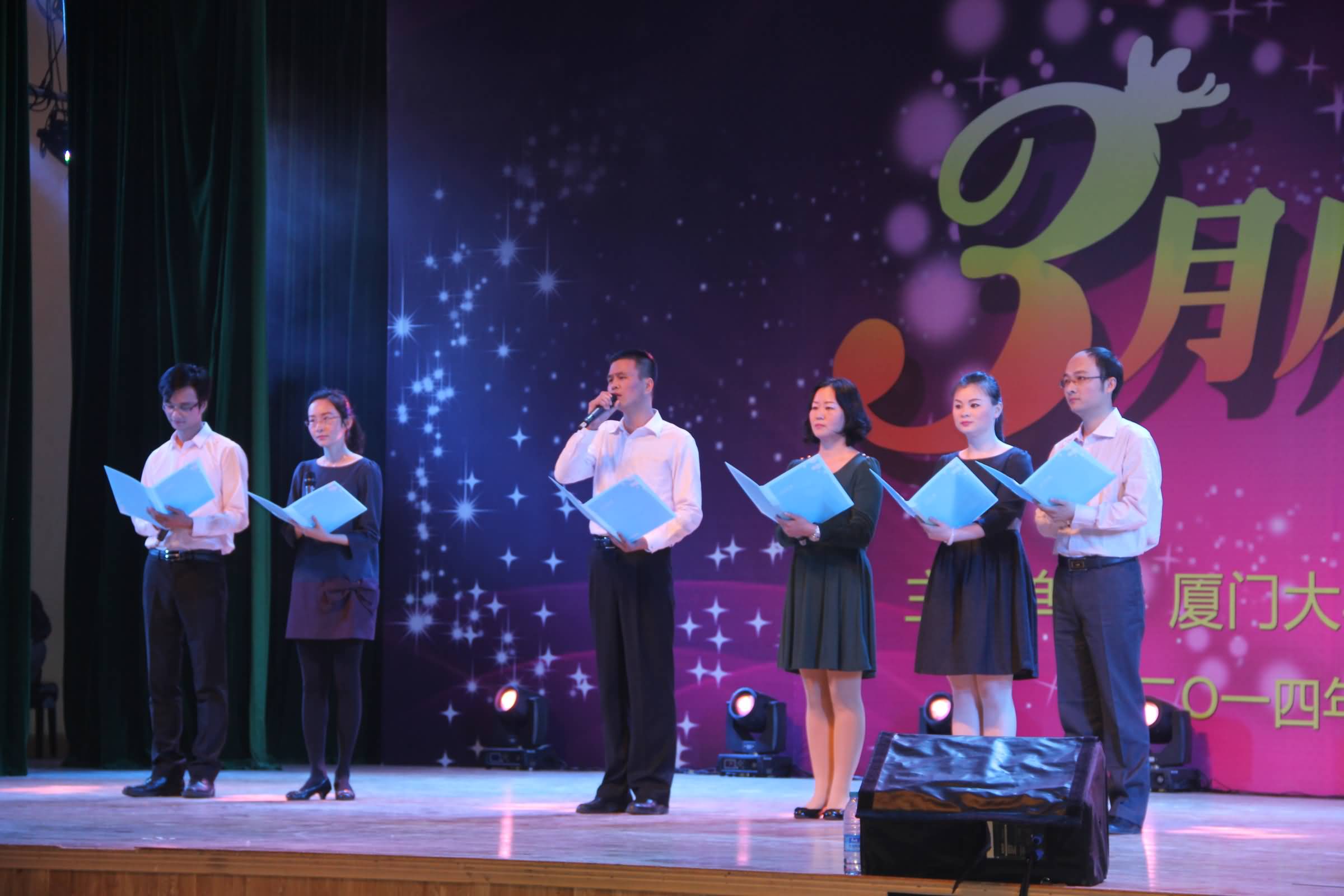 在2014年4月14日晚“三月风采”的晚会上,我院六位老师宋翀、梁薇、李伟、高春玲、罗珍、周达在台上表演了诗歌朗诵《数学三行家书》。