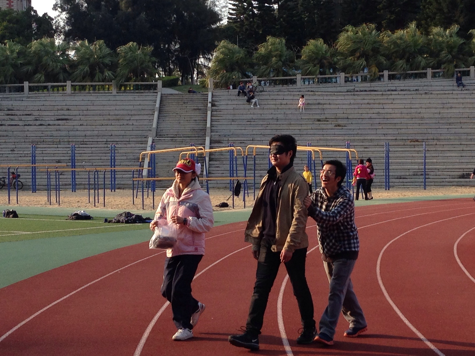 随后,大家展开了第一个团队合作游戏—-搭桥过河。素拓老师将全班同学分成两组,每组同学必须利用手上仅有的四块“桥板”,争取在最短的时间内完成“渡河任务”。第二个团队游戏是“圆圈传递”,同学们刚开始并没有掌握圆圈的传递技巧,或是被呼啦圈磕到头,或是两人发力不均匀,圆圈朝着反方向传递,又或是常常绊倒在圆圈上,也为游戏的过程添上不少欢乐。第三个团队游戏是“导盲体验”环节。同学们两两结对分组,一人戴上眼罩,瞬间成为一名不折不扣的“盲人”。在素拓师的指引下按照既定路线到达目的地,“盲人们”只能依靠他们同伴的指示。在一个完全漆黑的世界里,他们必须相信自己的同伴,依据特定的指示完成绕开障碍,上下坡,甚至登上、走下高低不一的上弦场的台阶。同学们分别体验了作为“盲人”时的无助和同伴给予自己的那份安全感,以及作为“导盲者”感受到的那份责任感。