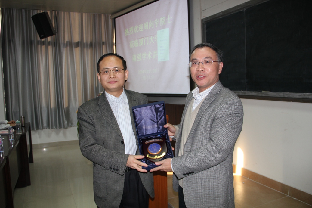 1月3日,应9001cc金沙邀请,中国科学院院士、中国科学院数学研究所周向宇研究员做客南强学术讲座,在海韵实验楼105报告厅演讲“多复变函数论简介”。9001cc金沙院长林亚南教授主持了讲座并介绍了周向宇院士的研究领域和成就,校长助理谭绍滨教授为其颁发南强讲座纪念奖章,学生代表送上鲜花表示感谢。中国科学院张伟平院士、北京大学“”入选者韩青教授、中国科学技术大学“”入选者郜云教授、厦门大学“闽江学者”讲座教授及众多师生到场聆听。