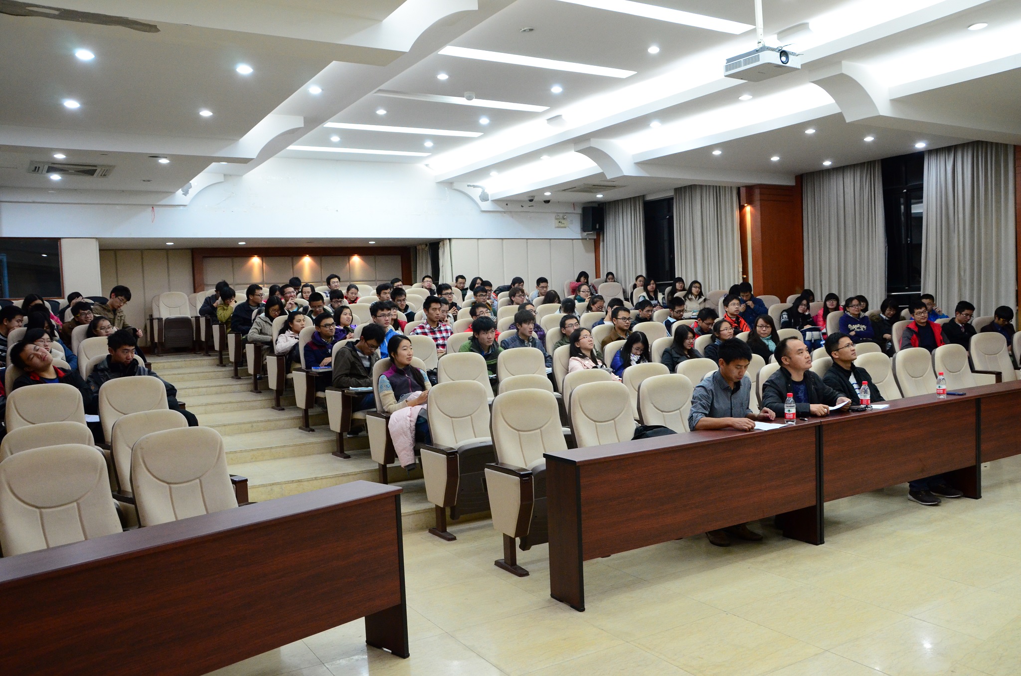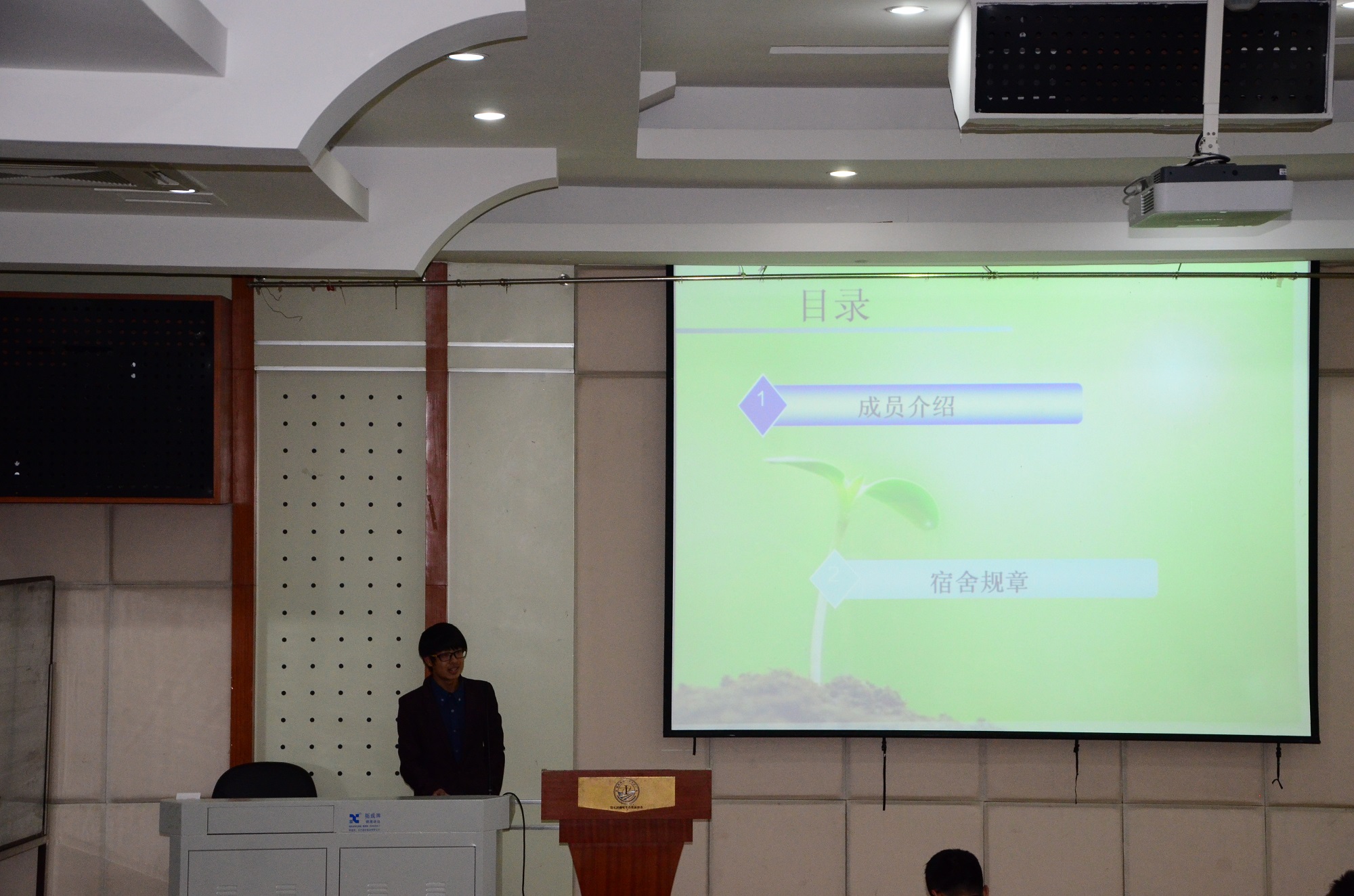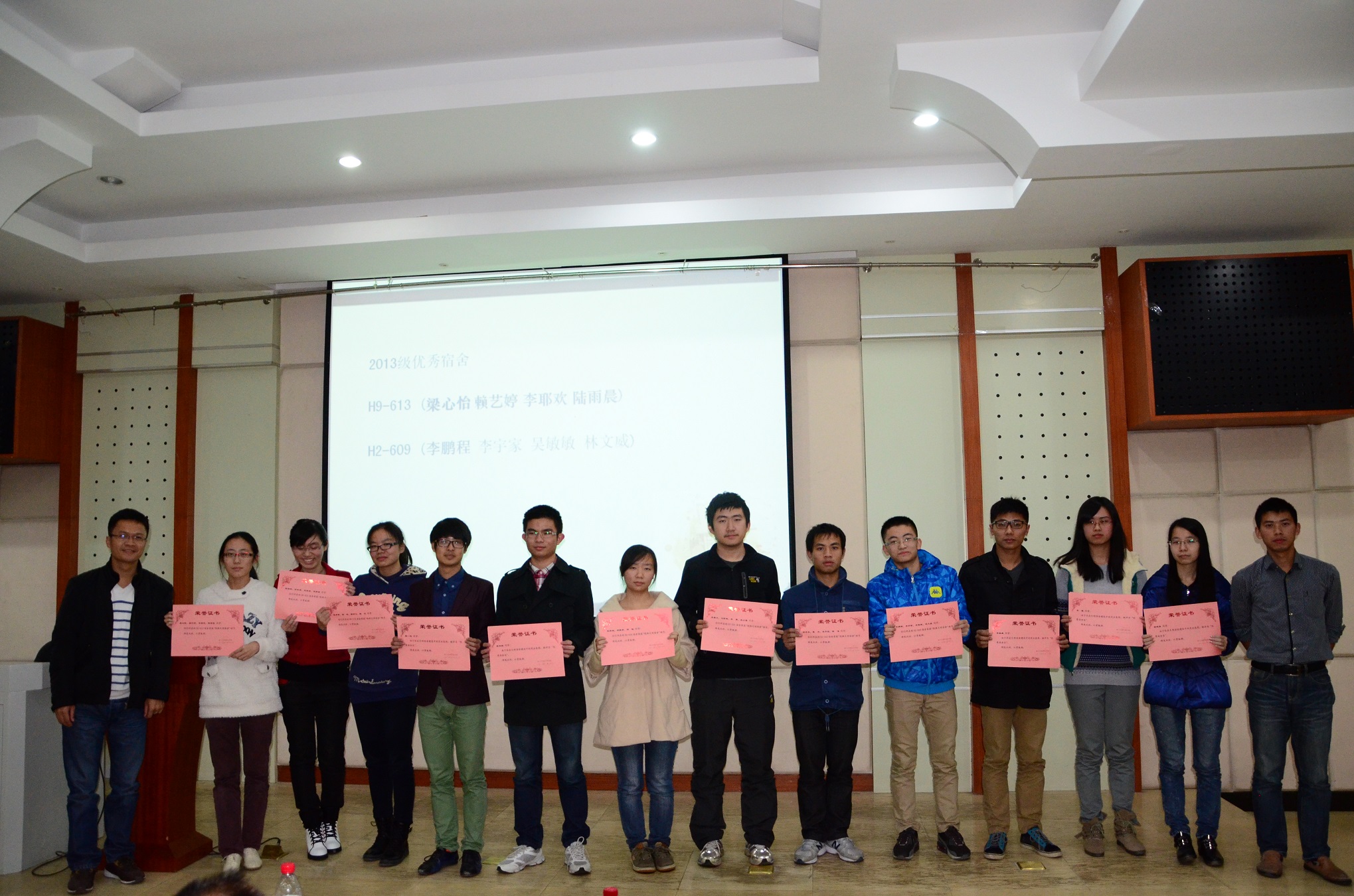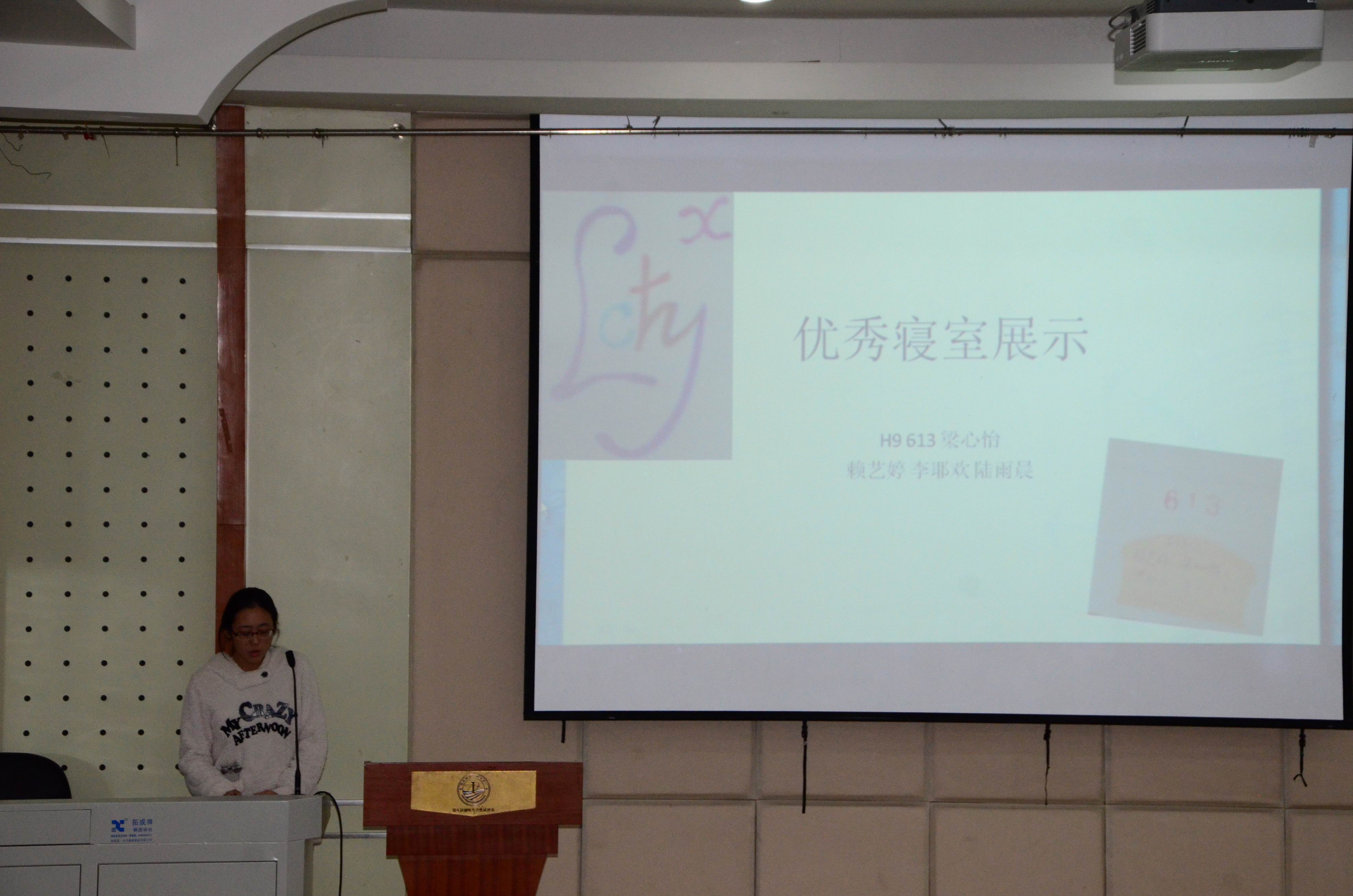颁奖过后,文明宿舍展示汇报正式开始。八个优秀寝室的宿舍长走上讲台,宿舍成员介绍、文明宿舍公约、宿舍美化、宿舍活动等各个方面的介绍,活泼而有爱地展现出优秀寝室融洽而和谐的氛围。值得一提的是,最后上场的H2-609宿舍长李鹏程作为新生学霸寝室的代表向大家展示了“学霸宿舍”是怎样炼成的,H2-609宿舍通过集体看公开课视频、集体上图书馆自习、集体讨论思维碰撞等方式,在期中考试中其宿舍成员各门专业课平均分远远超出班级平均分,其中解几课平均分为90.5。