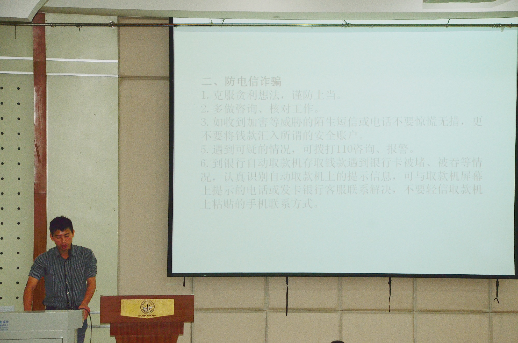 大会首先由辅导员石义凯发言。石老师就宿舍安全教育、宿舍长职责、宿舍管理规定等方面阐述了宿舍管理与安全问题的重要性。石老师强调,宿舍长在建设和谐的宿舍氛围方面应起到良好的模范带头作用,并积极组织开展有利于宿舍团结的宿舍文化、体育活动;要注意督促全宿舍成员遵守宿舍管理规定;安全教育方面,要防骗尤其是电信诈骗,做到绝不下海游泳,管理好水电门窗等等。石老师最后通过一组真实图片,展现了我校包括我院部分宿舍区常见的不文明行为,尤其以使用违规大功率用电器以及过度上网等现象最为明显,引发了同学们对自身的深深反思。