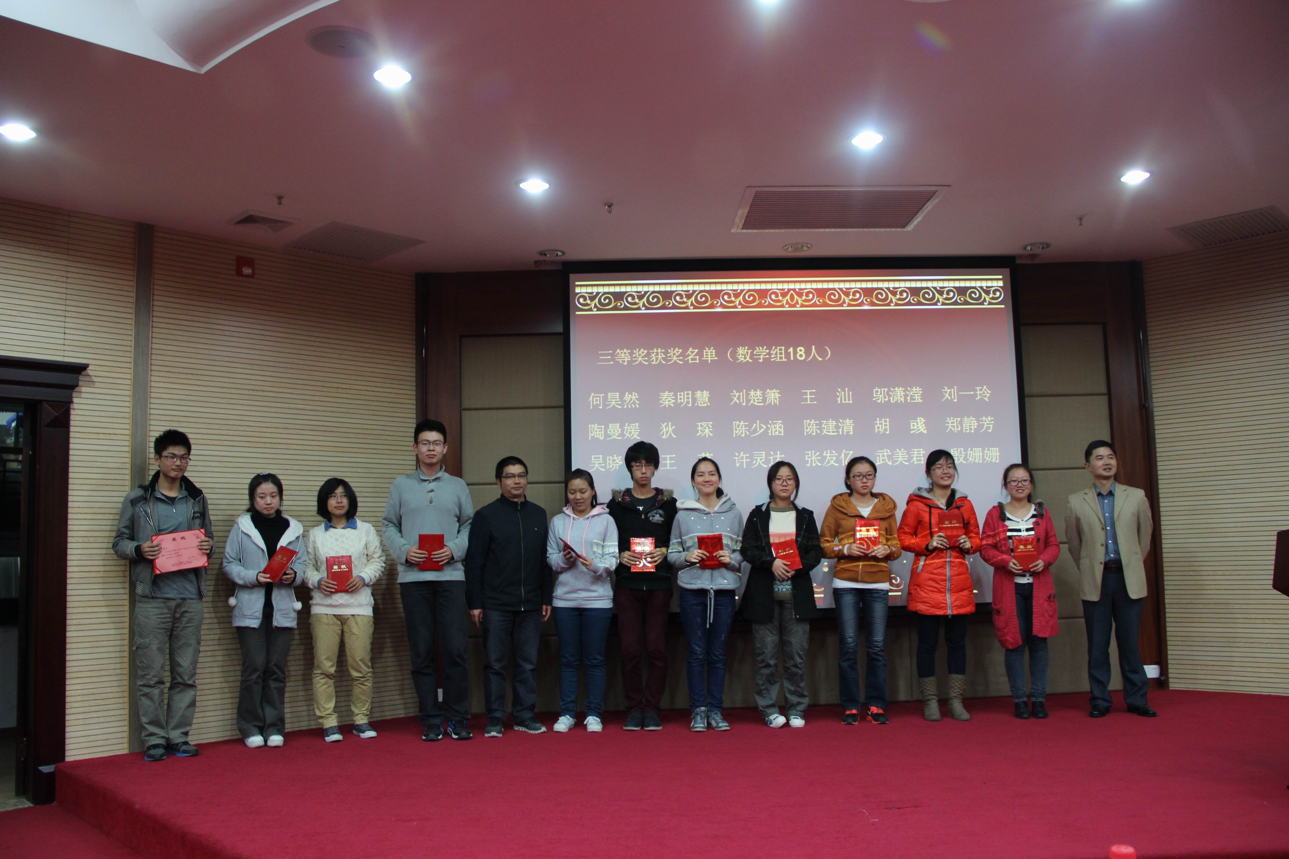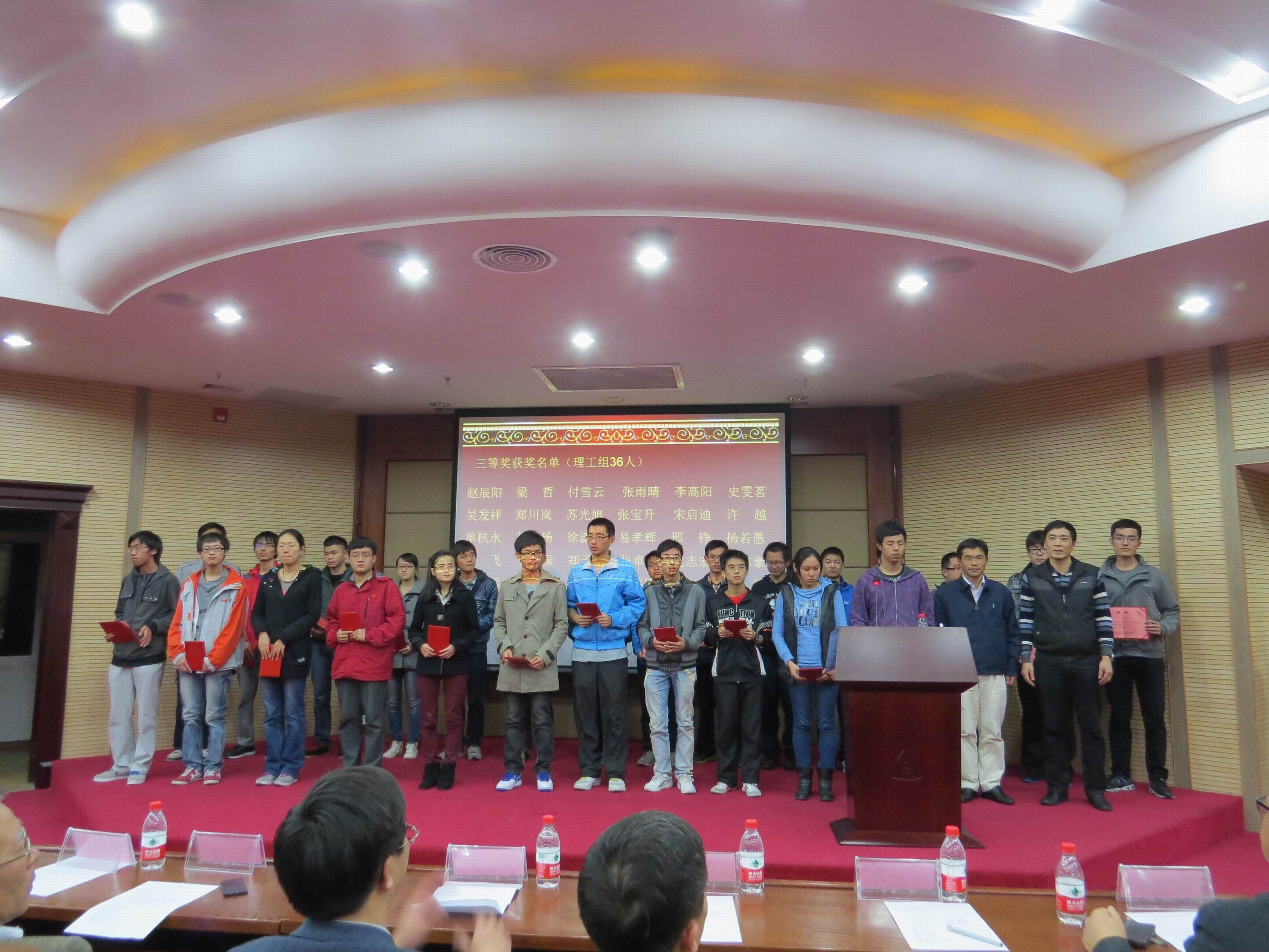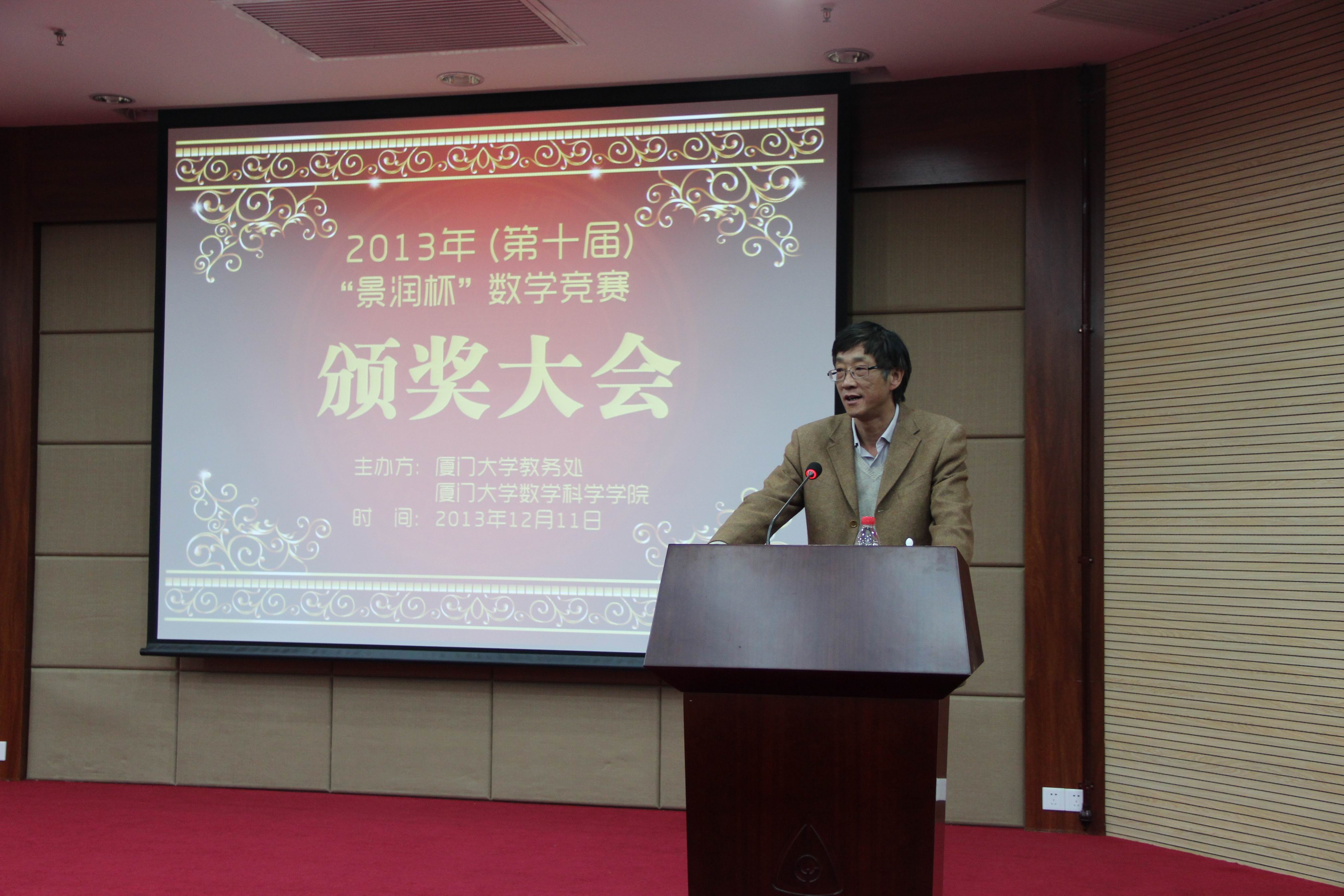 第十届(2013年)“景润杯”数学竞赛颁奖大会于12月11日晚7:30在克立楼隆重召开。与会来宾有第十届厦门大学“景润杯”数学竞赛组织委员会名誉主任、厦门大学副校长邬大光教授,厦门大学现代教育技术与实践训练中心主任、教务处谢火木副处长,厦门理工学院应用数学学院党委副书记陈全胜,集美大学数学系副主任翁苏骏,9001cc金沙院长林亚南,党委书记张明智,党委副书记郑诚明,副院长钱建国,公共数学教学部主任钟春平,林建华老师,辅导员陈向柳、石义凯以及近两百名同学出席了颁奖大会。