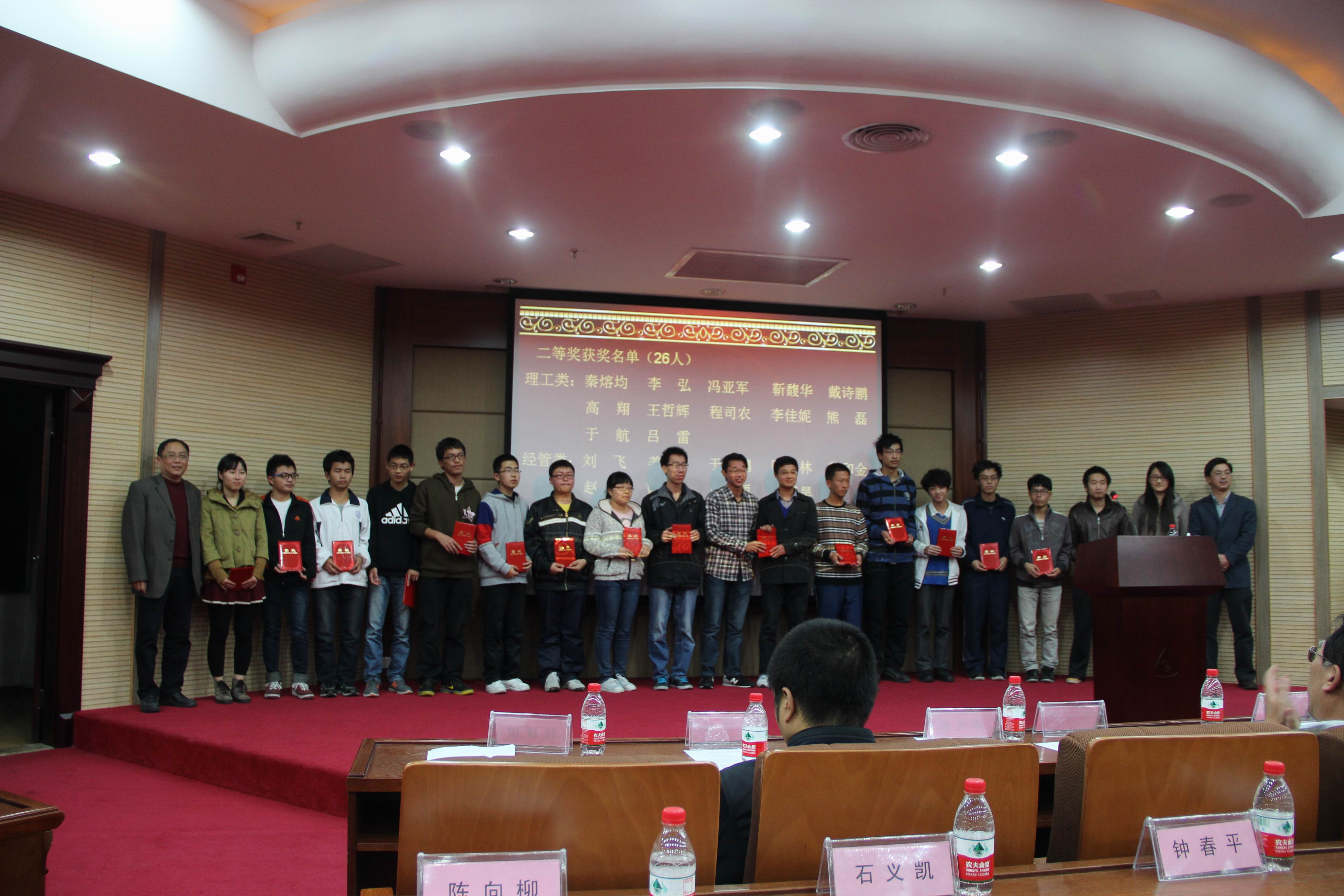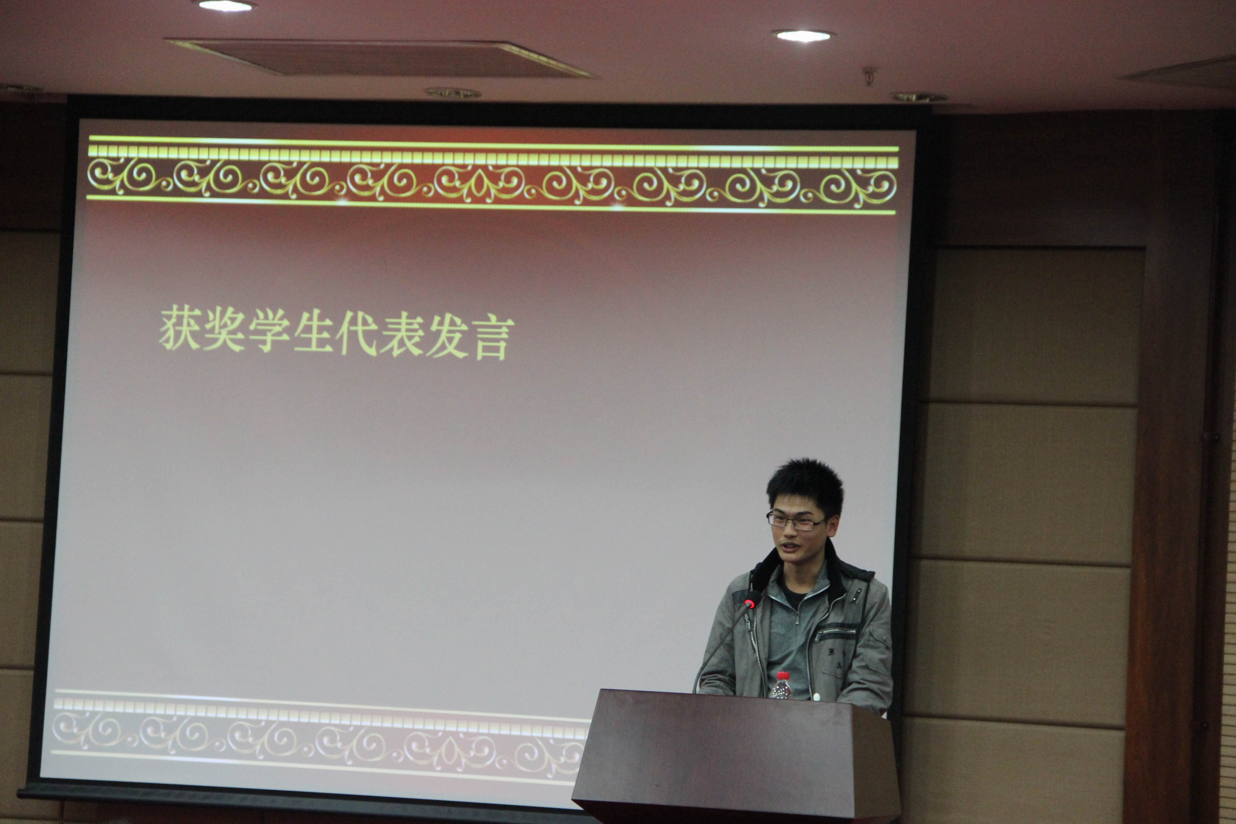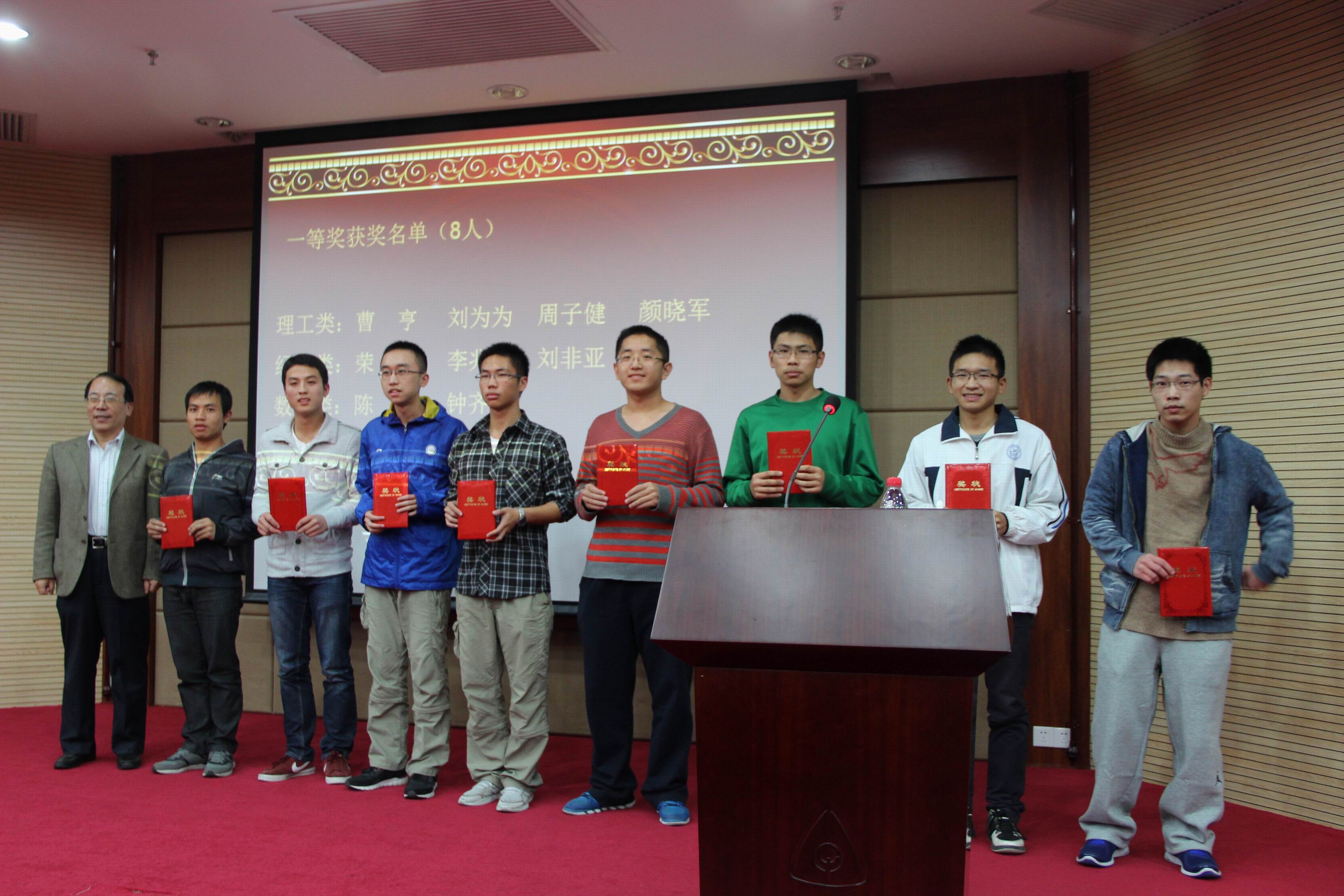 随后,谢火木主任宣读了第十届(2013年)厦门大学“景润杯”数学竞赛的获奖名单。邬大光副校长、林亚南院长、谢火木主任等九位老师分别为获奖同学颁发了荣誉证书。颁奖结束后,我院2011级获奖同学许灵达代表数学专业组上台发言。他谈了学习数学的经历,分享了与“景润杯”数学竞赛的故事。他认为“景润杯”数学竞赛为同学们提供了一个相互交流的平台,一个在数学世界展示自己的平台。随后,信息科学与技术学院的2011级获奖同学曹亨代表非数学专业组上台发言。他介绍了数学与自己所学的自动化专业的密切关系,凸显出数学对于学好自己专业的重要性,并分享了学习数学的心得和感悟。
