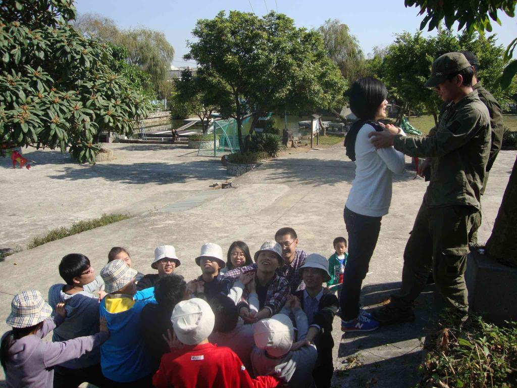 压轴的游戏是同起同坐。所有的队员胳膊挽着胳臂,背靠着背站成两排,然后一同坐下,再一同起来。要求全队同一频率,同一节奏。只要团队中任何一员掉链子,这个游戏就无法完成。在大家共同的努力和多次尝试后,终于达到了一秒内坐下,一秒内站起来的要求。