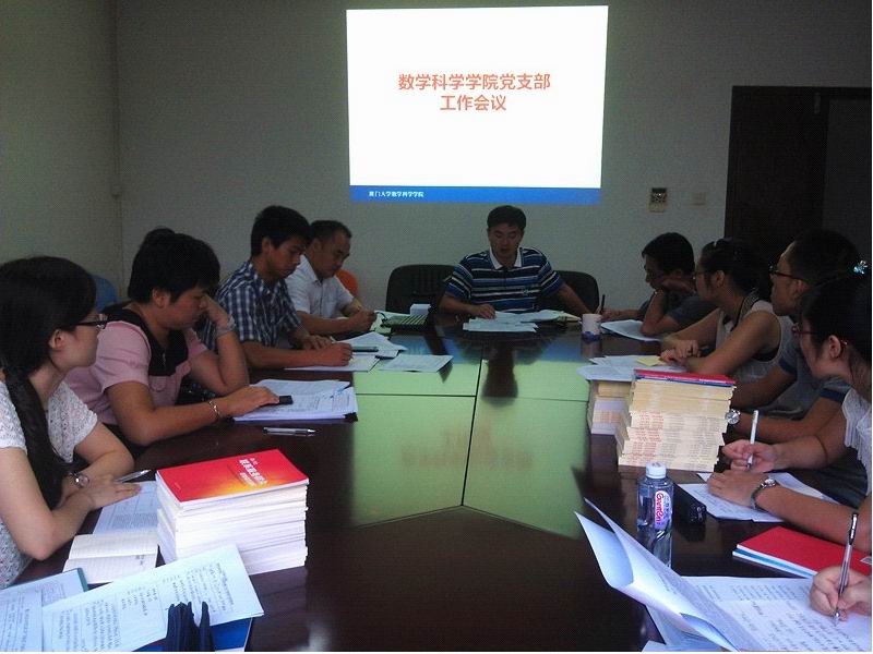 接着,在张明智书记的主持下,讨论了上一年度的支部立项总结及新一年度的支部立项申报工作,最后确定推荐本科生数学答疑、学业帮扶活动、硕士研究生和本科生科技中学课外辅导及博士助教立项活动申报厦门大学2013年校级立项。接下来,张书记对近阶段的党支部工作作出了部署,要求各支部要及时召开党员大会,做好换届工作;其次,要求各支部抓住开学契机,做好宣传工作,做好入党推优工作;会上,各支部推荐确定了新一期党校学习班入党积极分子名单。