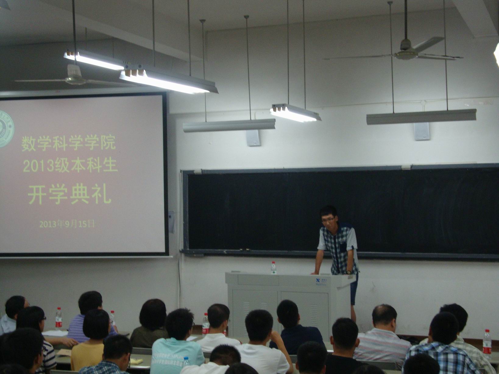院长林亚南教授首先发言,代表学院对2013级新同学的到来表示欢迎,他希望新同学重视学习,努力去认识数学,不要放松。同时,他讲到大学数学与高中数学的不同,要求同学们要有吃苦的精神。他还提醒同学们要改变学习方式和习惯,做到不懂就问,问题及时解决,不要拖延累积。最后,他希望同学们立下远大志向,并从小事做起,脚踏实地。