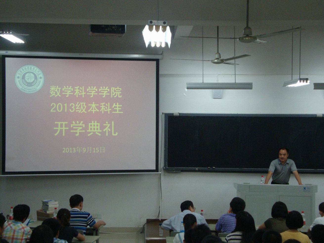 9月15日晚,我院在海韵教学楼隆重召开2013级本科新生开学典礼。学院高度重视本次典礼,院长林亚南,院党委书记张明智,副院长邱春晖、许传炬、钱建国,党委副书记郑诚明、张剑文,数学与应用数学系主任金贤安,概率与数理统计系主任刘继春,公共教学部主任钟春平,信息与计算数学系副主任杜魁,学院团委书记、研究生辅导员黄兆君,学院团委副书记、12和13级辅导员陈向柳,10、11级辅导员石义凯,2013级一班班主任刘龙城、2013级二班班主任吴聪敏,教学秘书黄晨龙出席了此次大会。大会由郑诚明副书记主持。