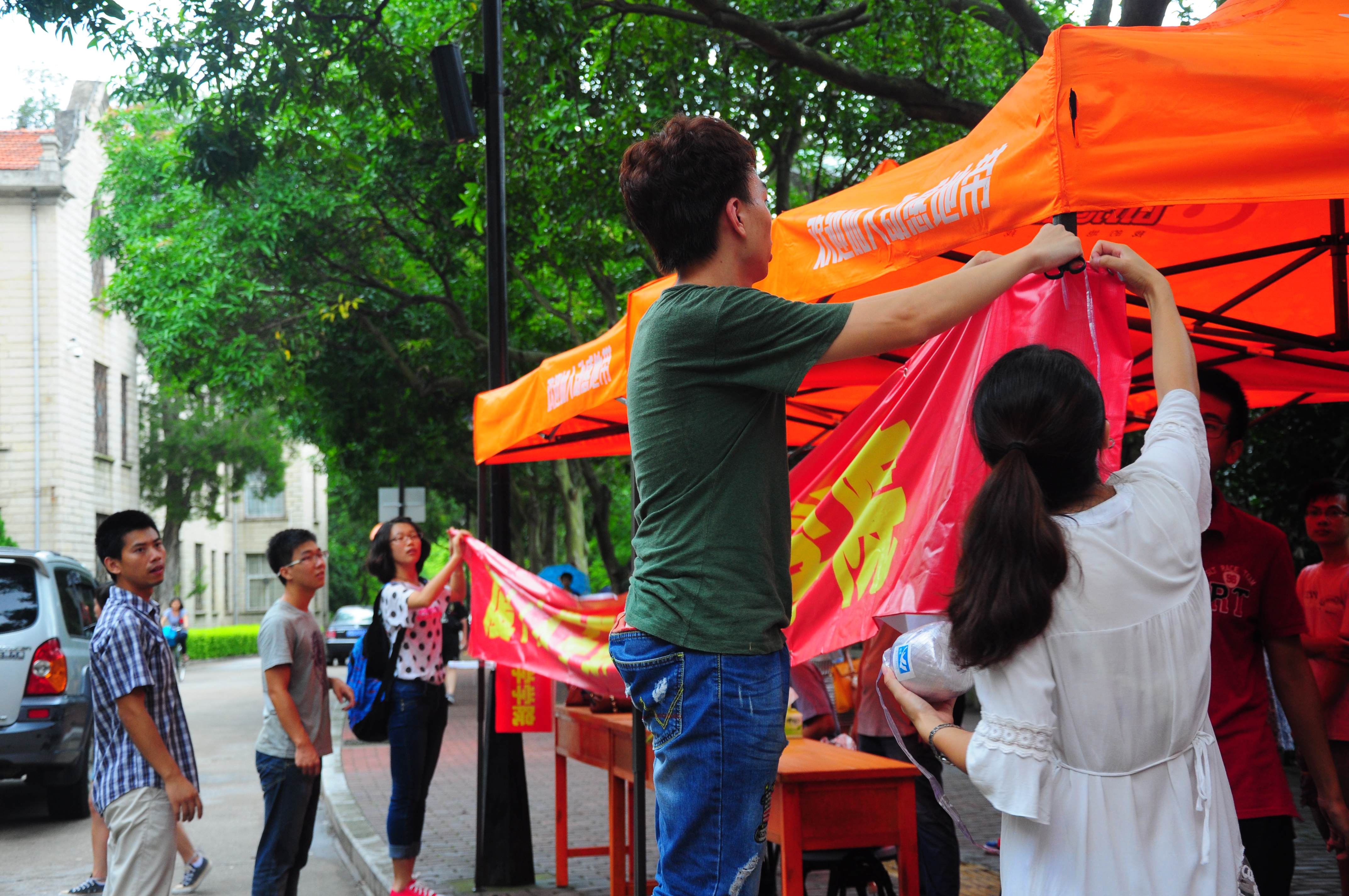 学院团委副书记陈向柳、辅导员石义凯也亲临迎新点,悉心指导迎新工作的进行;教学秘书黄晨龙也进行来注册的测试工作;两会一中心的学生干部,率先垂范,积极热情的投入到迎新工作中,今天下午早早就布置好了迎新点并开始了报到入住工作;宣传中心、美工部及其他同学提前做好墙贴、地标、条幅,张贴悬挂在新生宿舍,每个宿舍门口都张贴好床位分布,让他们一进园区就能感受到学院领导、老师、学长学姐的温馨关怀;在本部大本营同学们冒雨支起帐篷,早早的挂好横幅,作为本部靠近校门的第一个迎新点,让新一届的学弟学妹第一个感受到这个大家庭的热情;海韵的同学仍然不辞辛苦,分批引导新生去往宿舍,带领他们感受这个即将进入的大家庭的温暖。