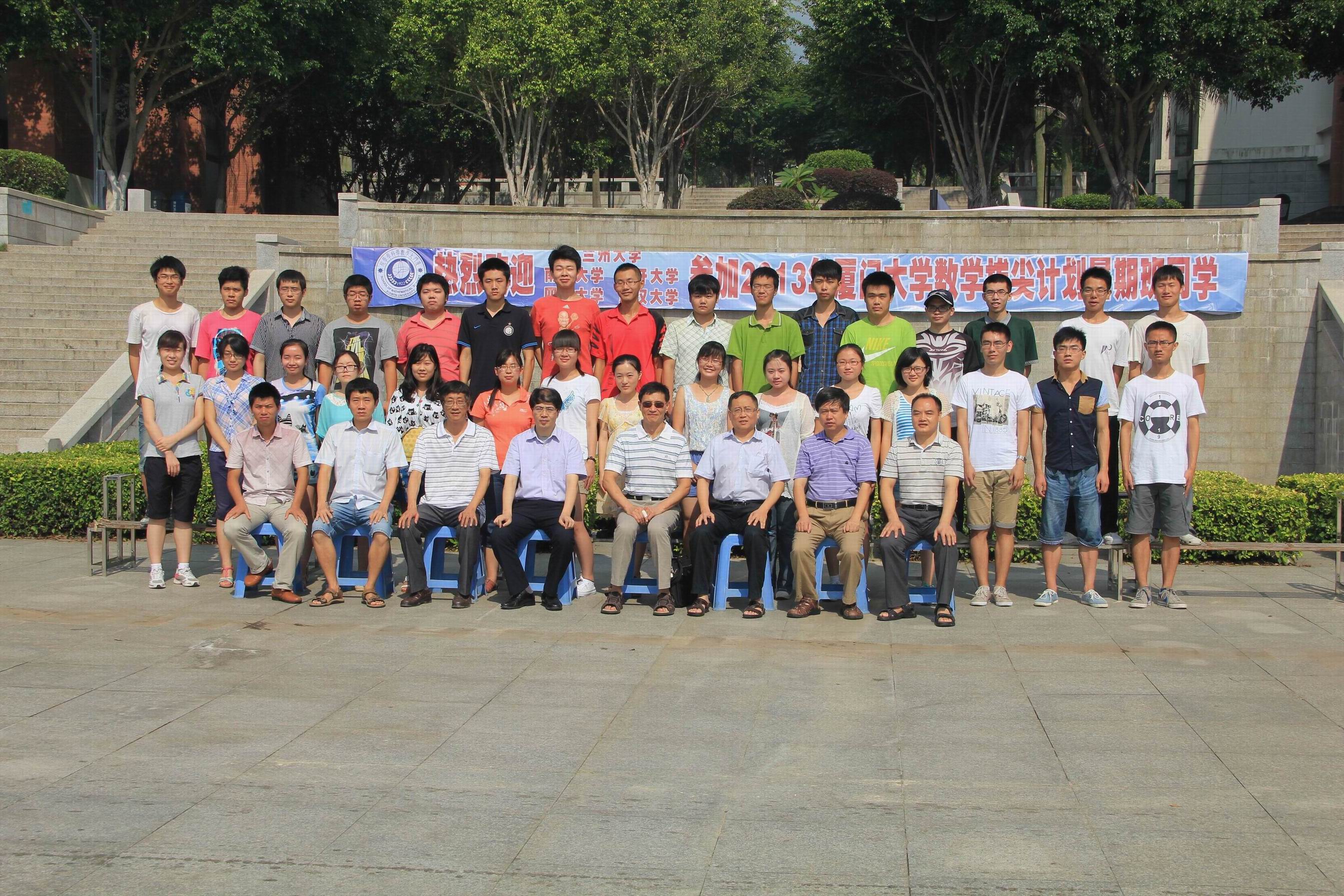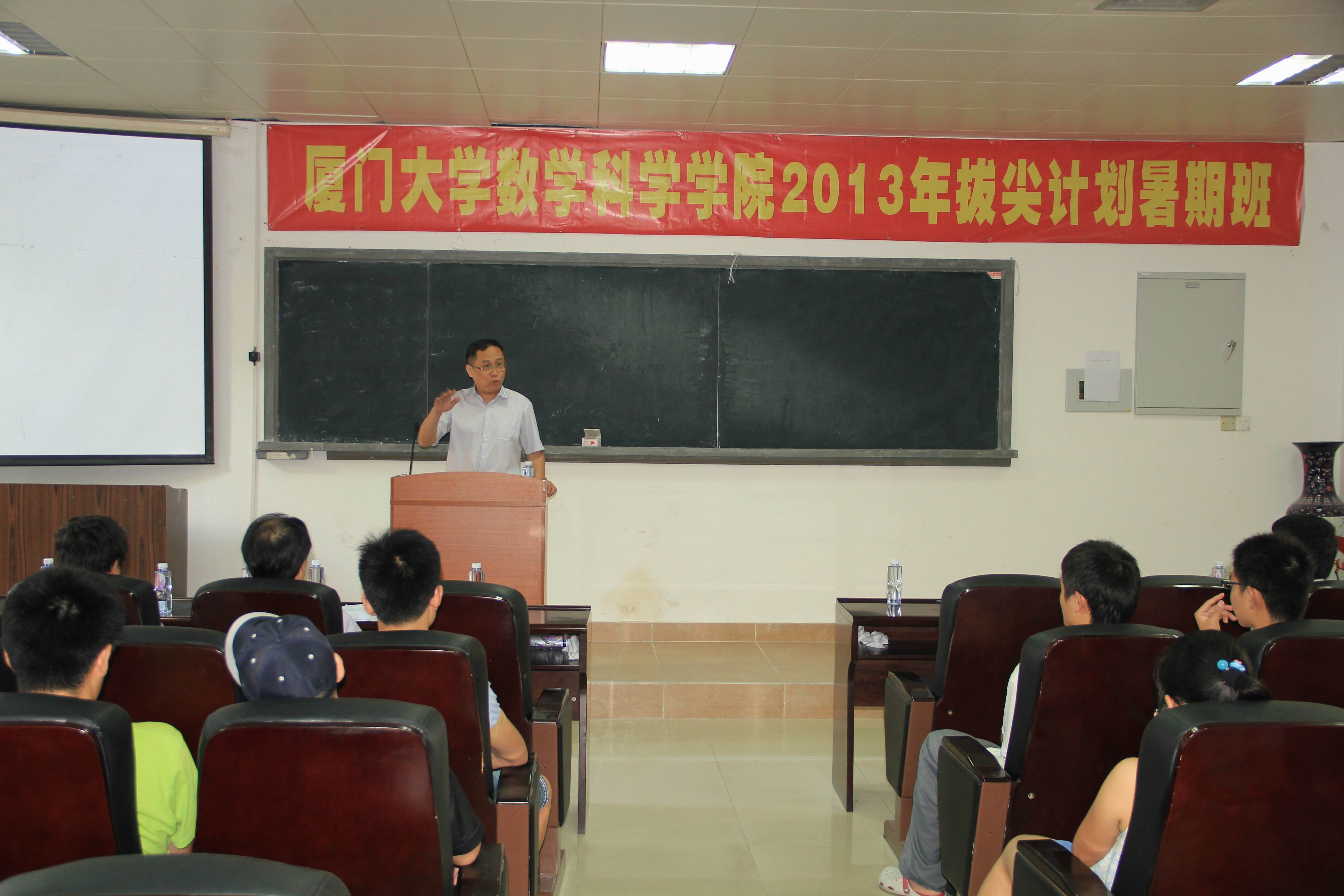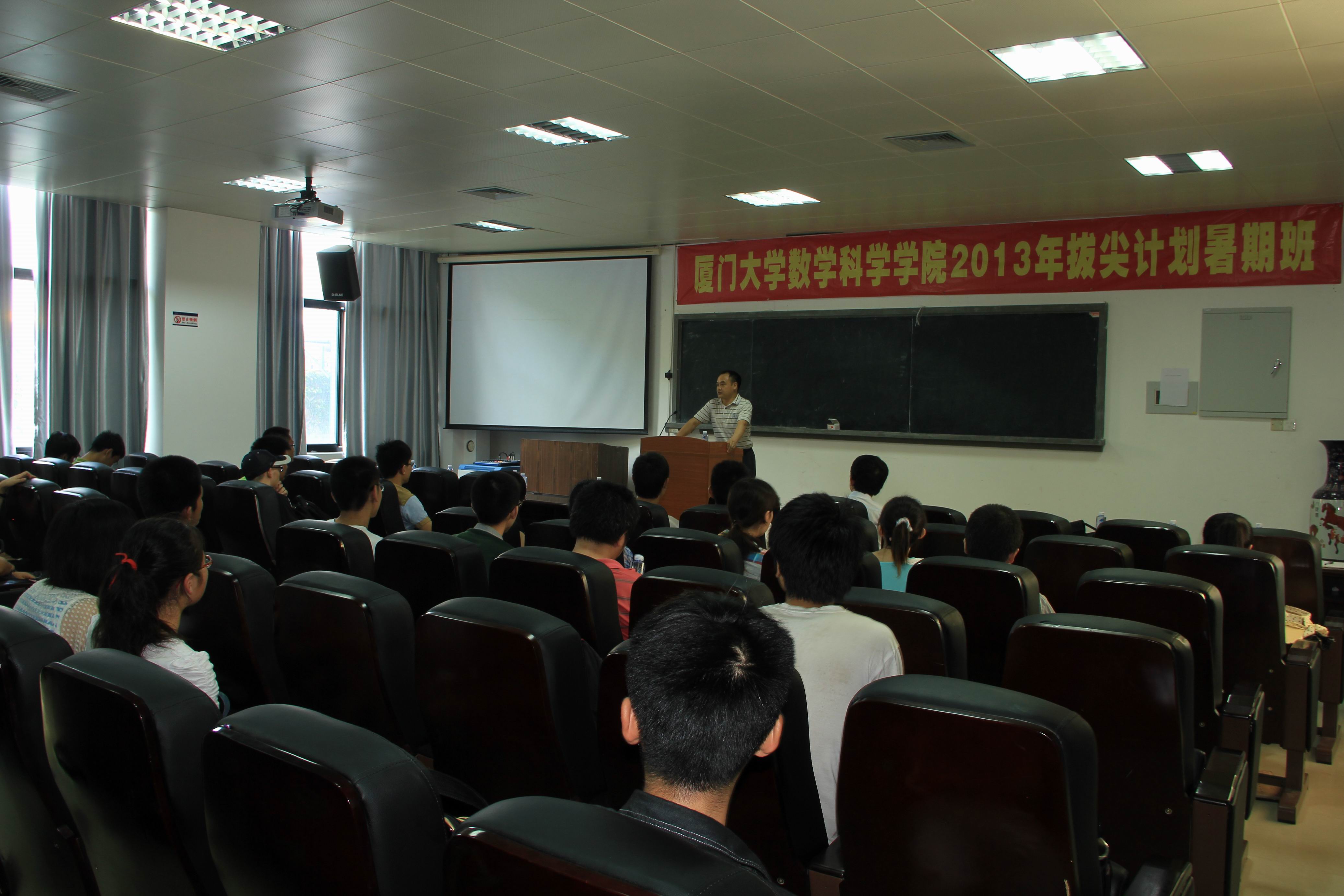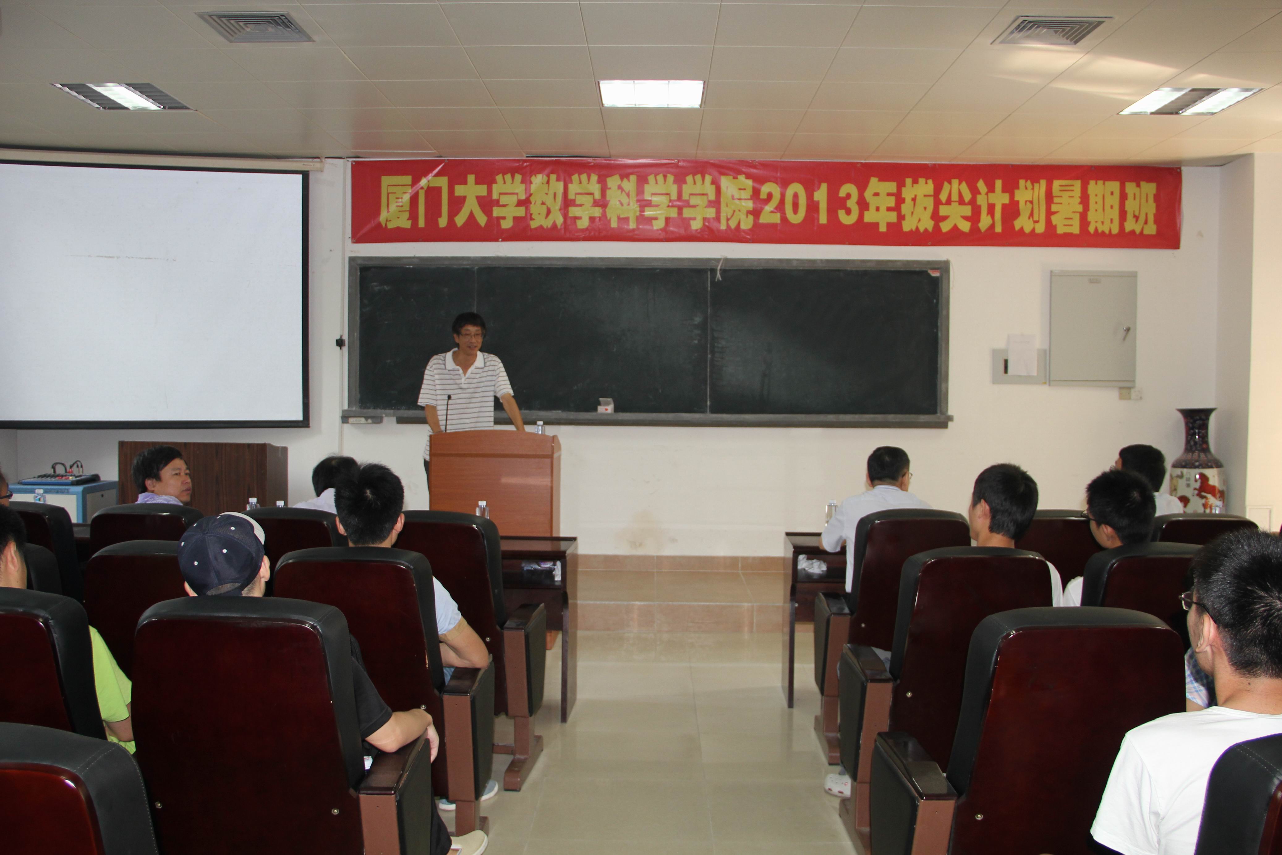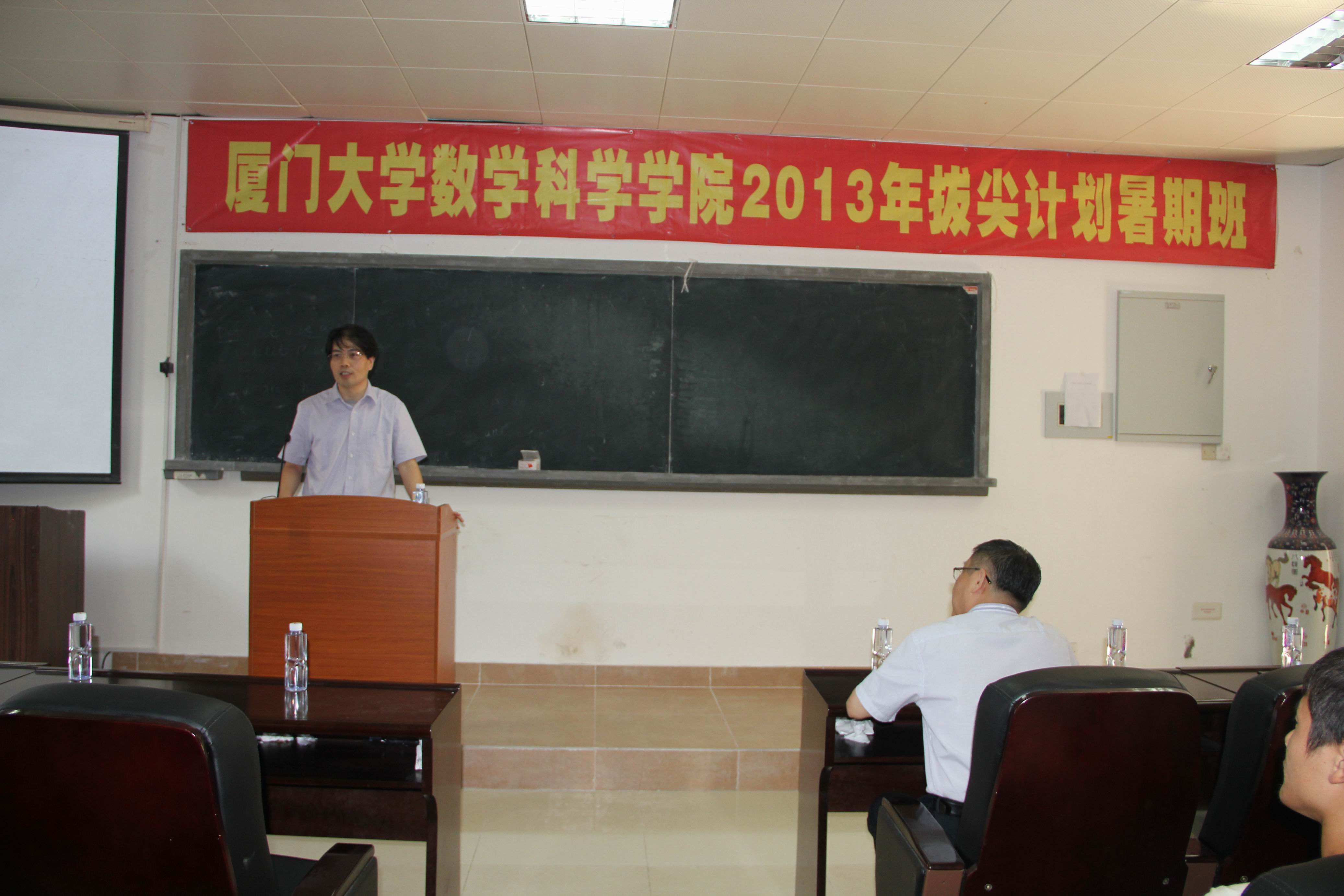 为期三周的9001cc金沙拔尖计划暑期班于2013年7月22日正式开班,来自兰州大学、南开大学、南京大学、四川大学、武汉大学、厦门大学六所著名高校的数学学科拔尖计划的37名学生共聚厦门大学,开启了这场求学之旅。学校教务处副处长薛成龙、院长林亚南教授、副院长邱春晖教授、厦门大学国家级高层次人才、美国Ohio州立大学教授、党委副书记郑诚明、数学与应用数学系副主任刘轼波教授、辅导员石义凯老师以及本期暑期班全体学员出席了开幕式,开幕式由钱建国副院长主持。