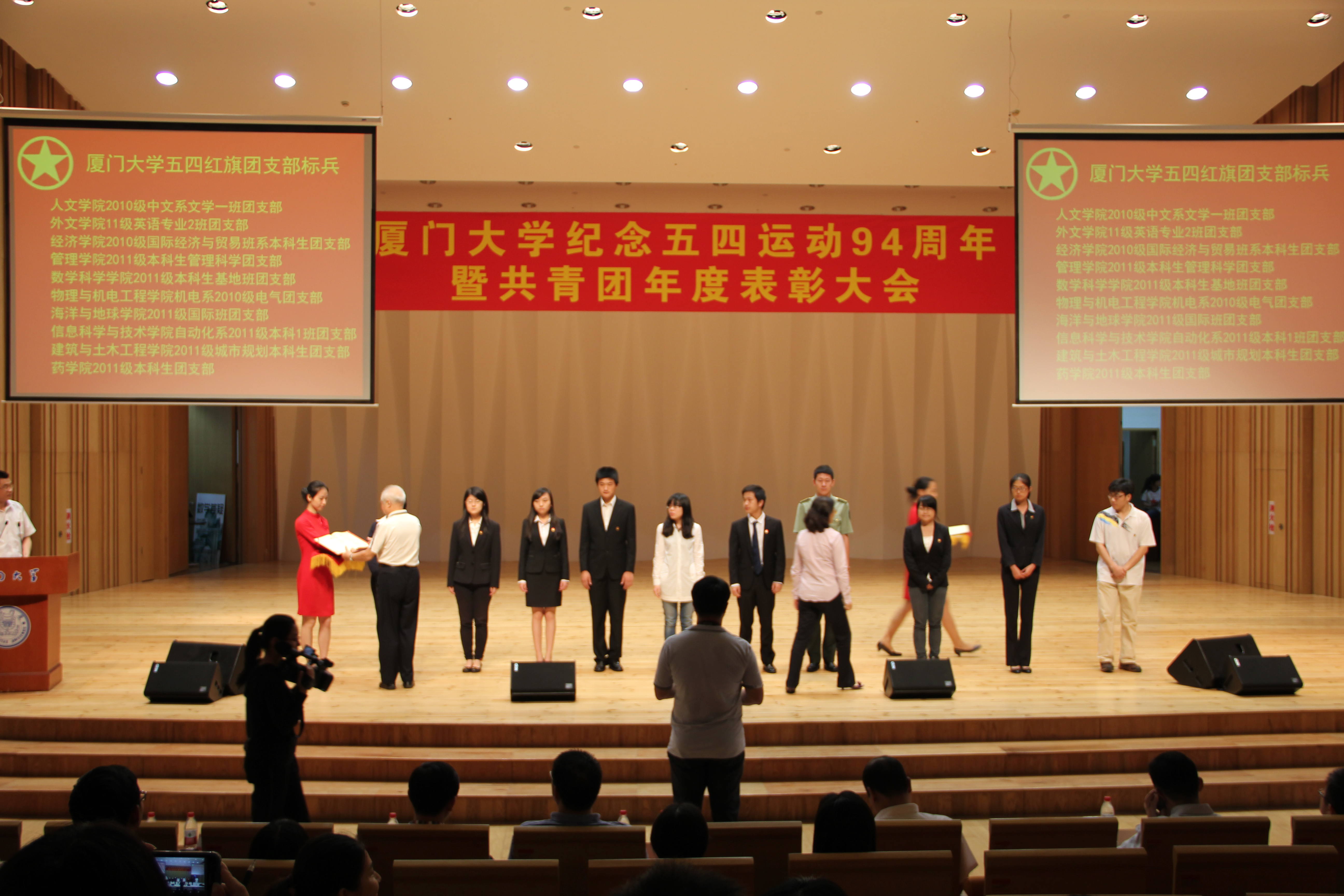 颁奖部分进行了厦门大学五四红旗团委、厦门大学五四红旗团支部标兵、厦门大学优秀共青团员、厦门大学优秀共青团干的表彰及颁奖,2011级基地班团支部获得了“五四红旗团支部标兵”称号。团支书郑佳丽代表2011级基地班团支部上台领奖。