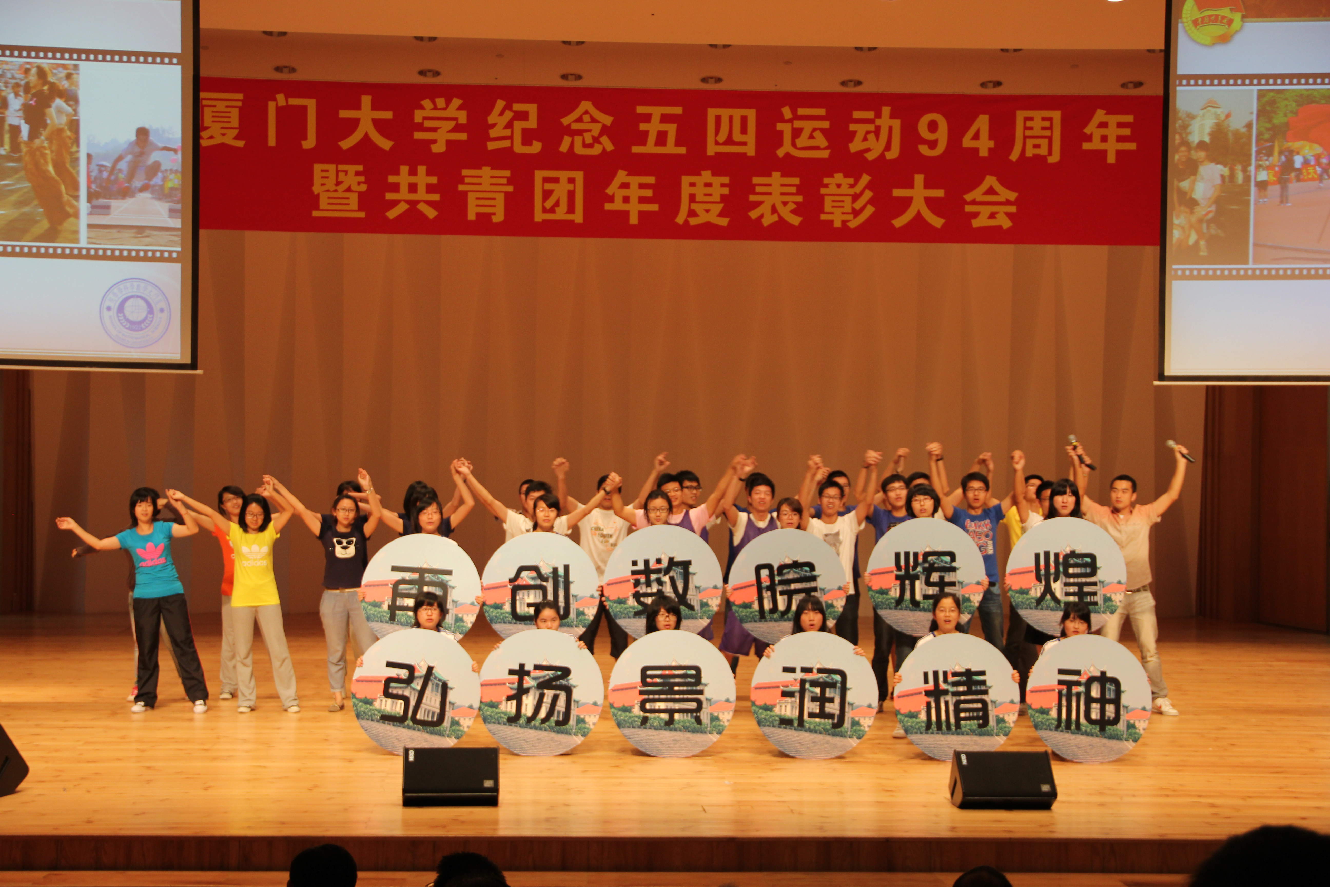 2013年5月13日下午3:00,我院2011级基地班团支部参加了厦门大学纪念五四运动94周年暨共青团年度表彰大会,在厦门大学科艺中心音乐厅作为优秀典型进行了展示演出。