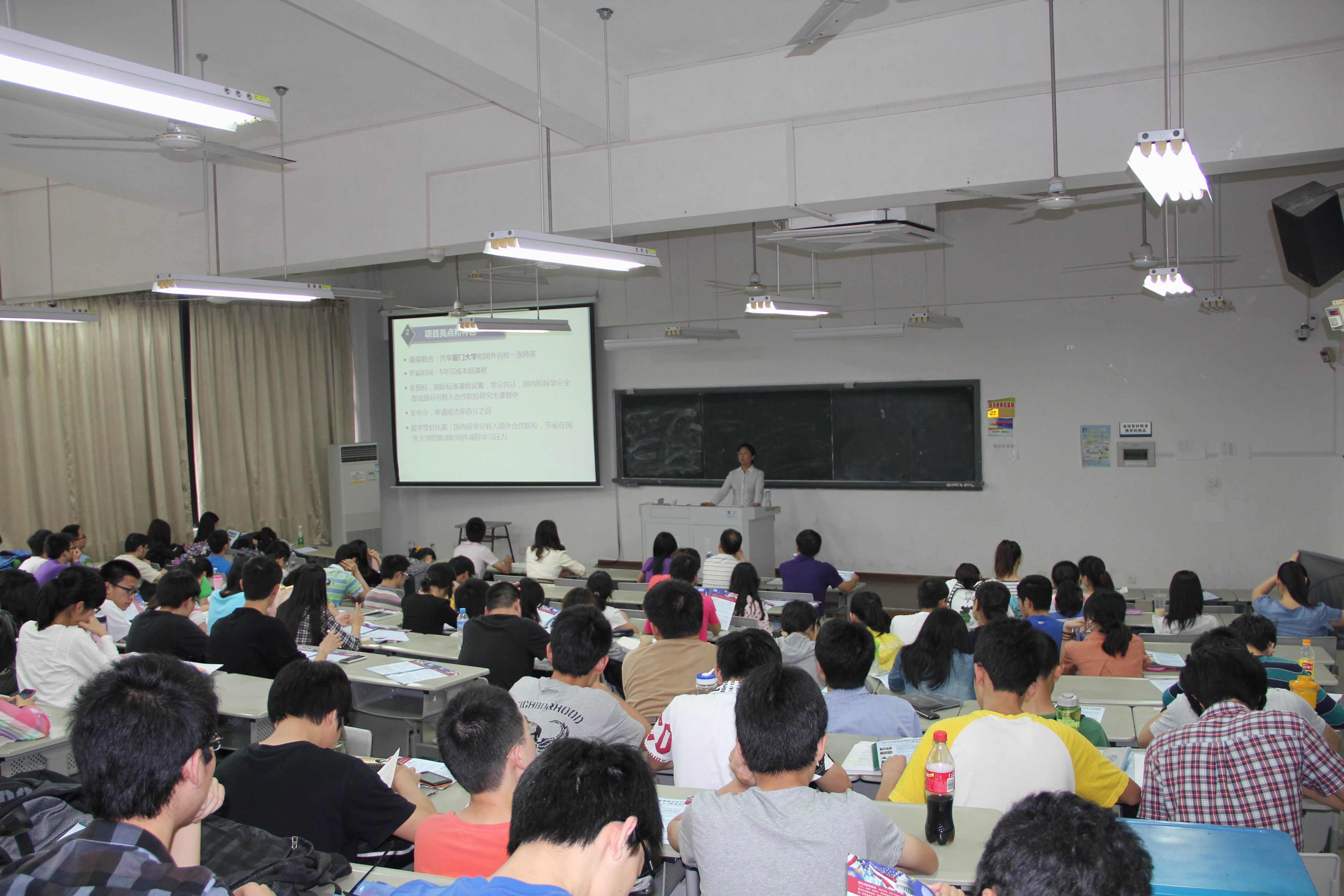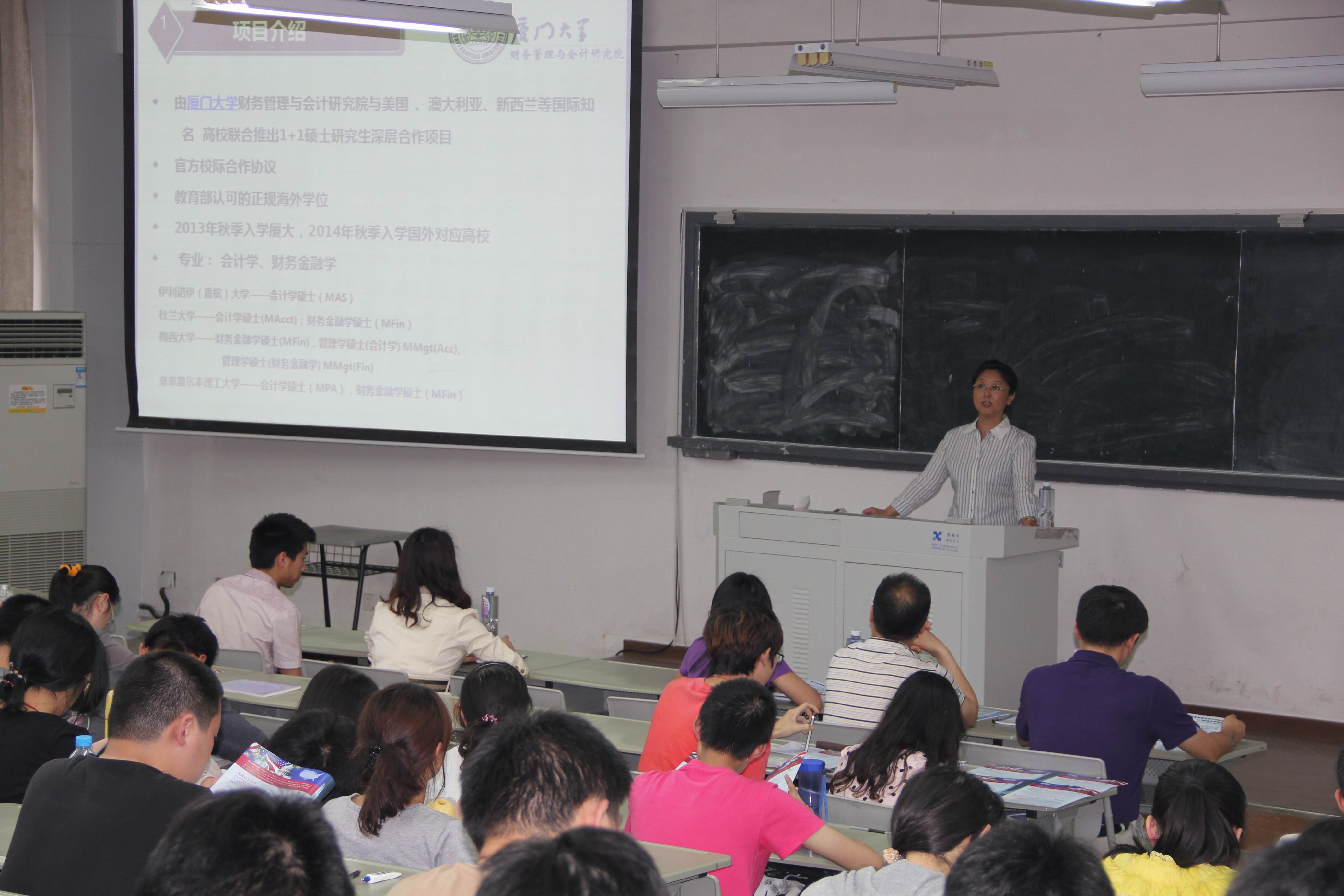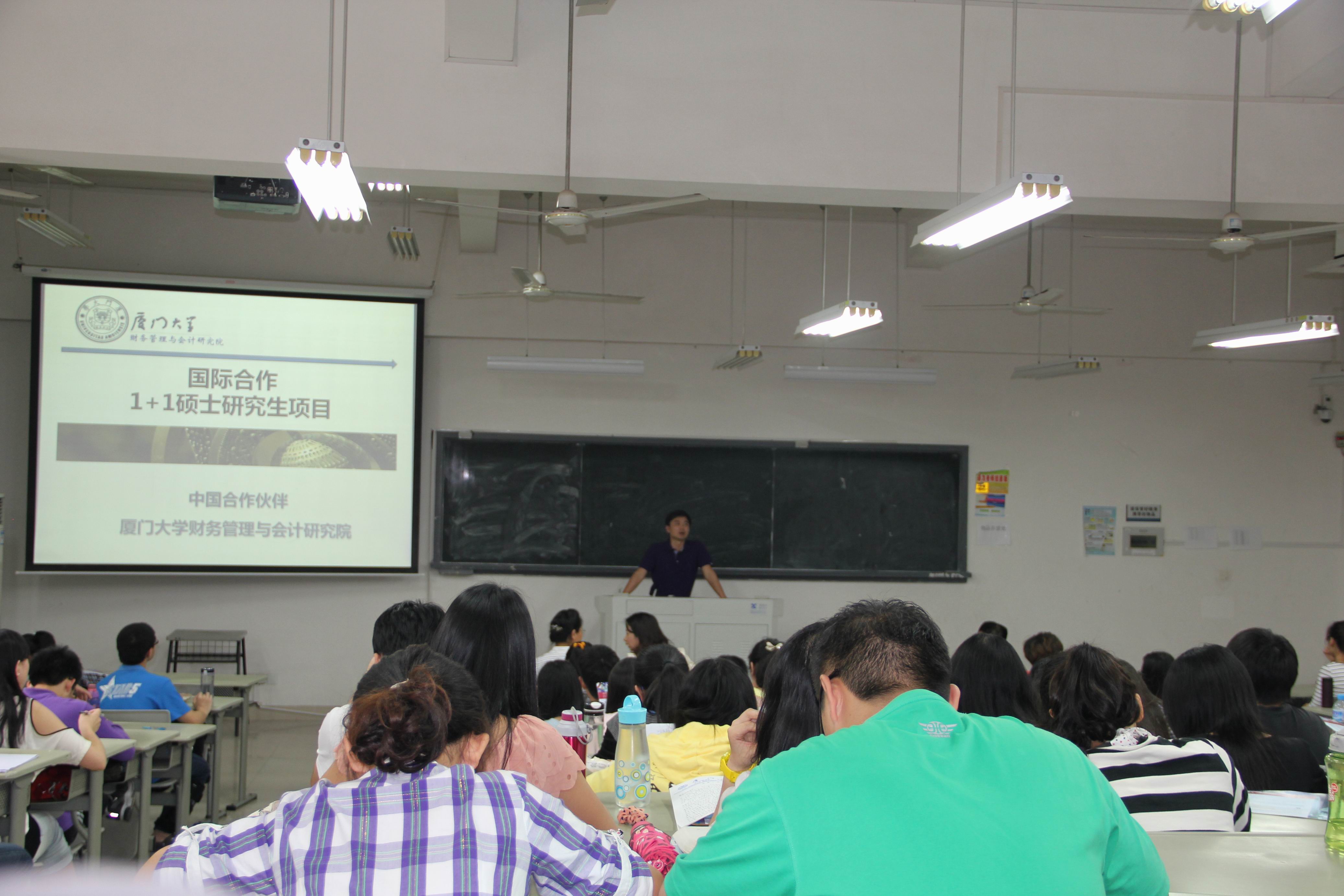 介绍会上,张国华教授主要就我校财务管理与会计研究院的综合实力、1+1联合办学项目的独特优势、与之联合办学的美国伊利诺伊(香槟)大学、美国杜兰大学、新西兰梅西大学、澳大利亚皇家墨尔本理工大学做了详细介绍。厦门大学财务管理与会计研究院的学术带头人和教学科研骨干长期活跃于国内外学术舞台,具有丰富的教学、科研和咨询培训经验,并且与政府机关和实务部门保持广泛的联系。通过该项目,学员可以同时享有厦门大学财务管理学院与国外大学优质的教育资源,而教育部认证的国外学位证书和厦门大学及IFAS卓越的学术声誉,将为学生提供更为广阔的就业前景。