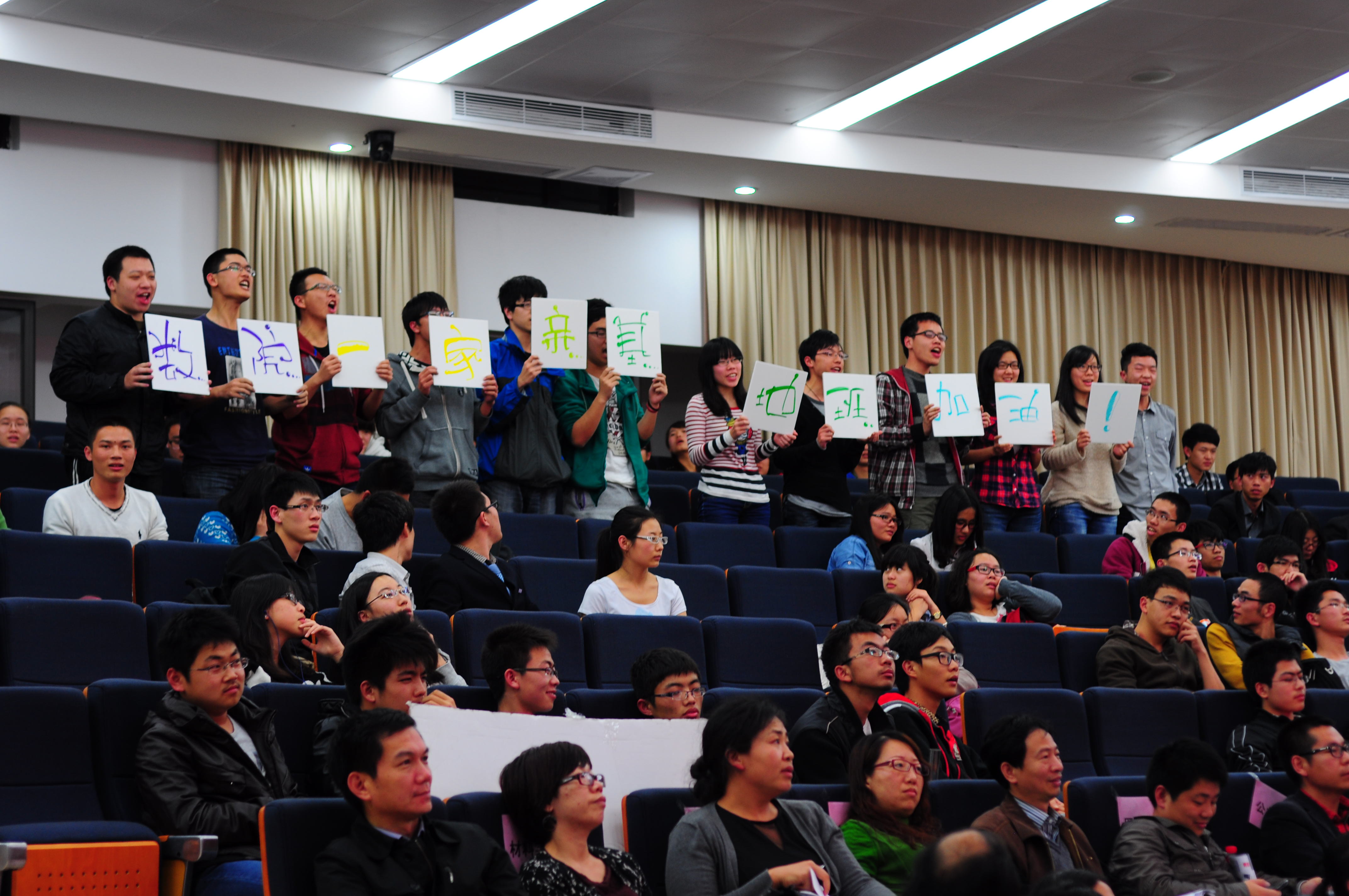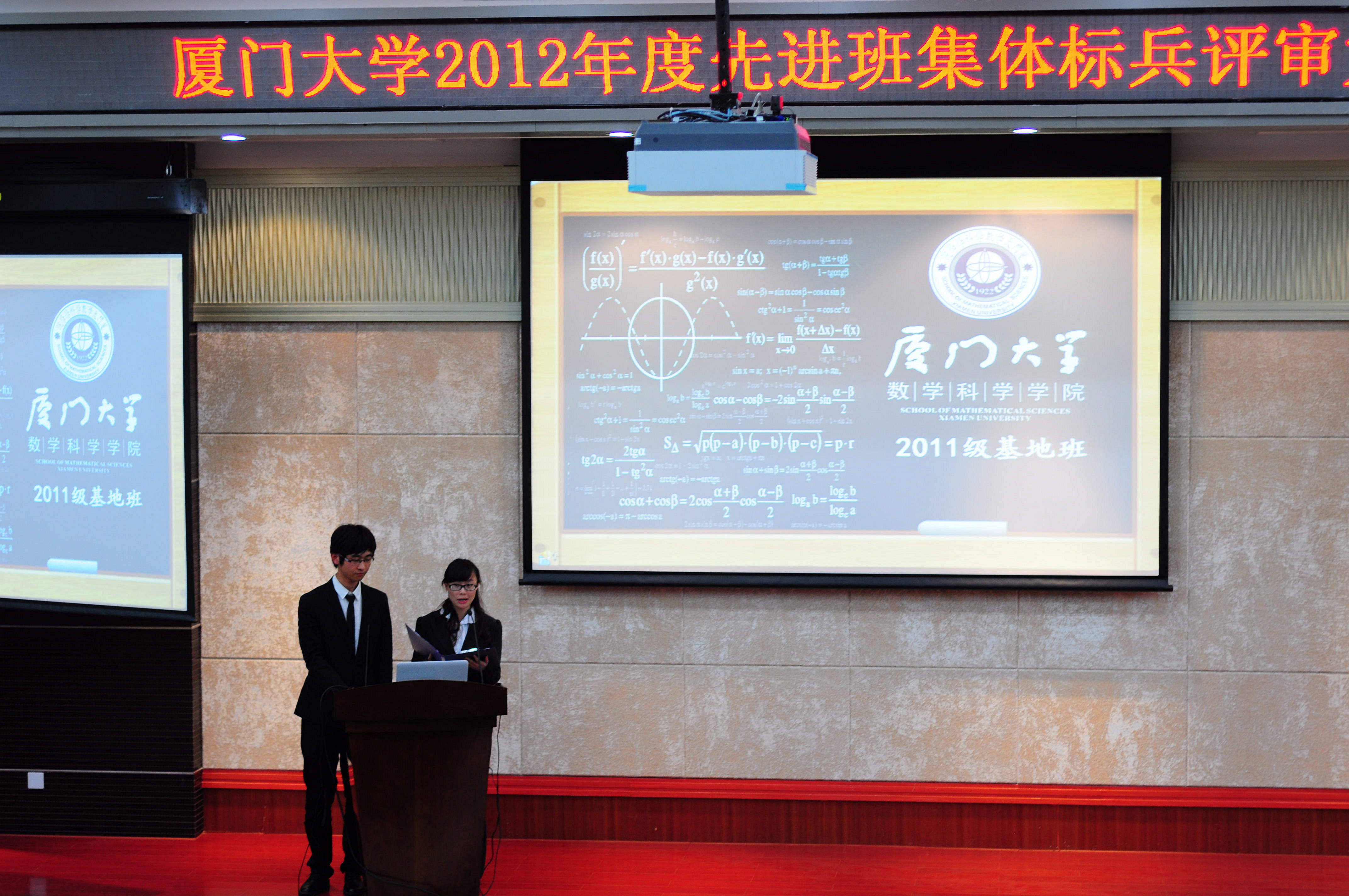 2013329日星期五晚,经济学院报告厅汇集了来自22个学院的同学,在这里举行由学生工作部主办的厦门大学2012年度“先进班集体标兵”评审答辩会。院党委副书记郑诚明老师,班主任杜魁老师,辅导员石义凯老师,以及基地班的20多位同学到场加油。班长汤德轩、主讲陆玥代表班级上台展示。
